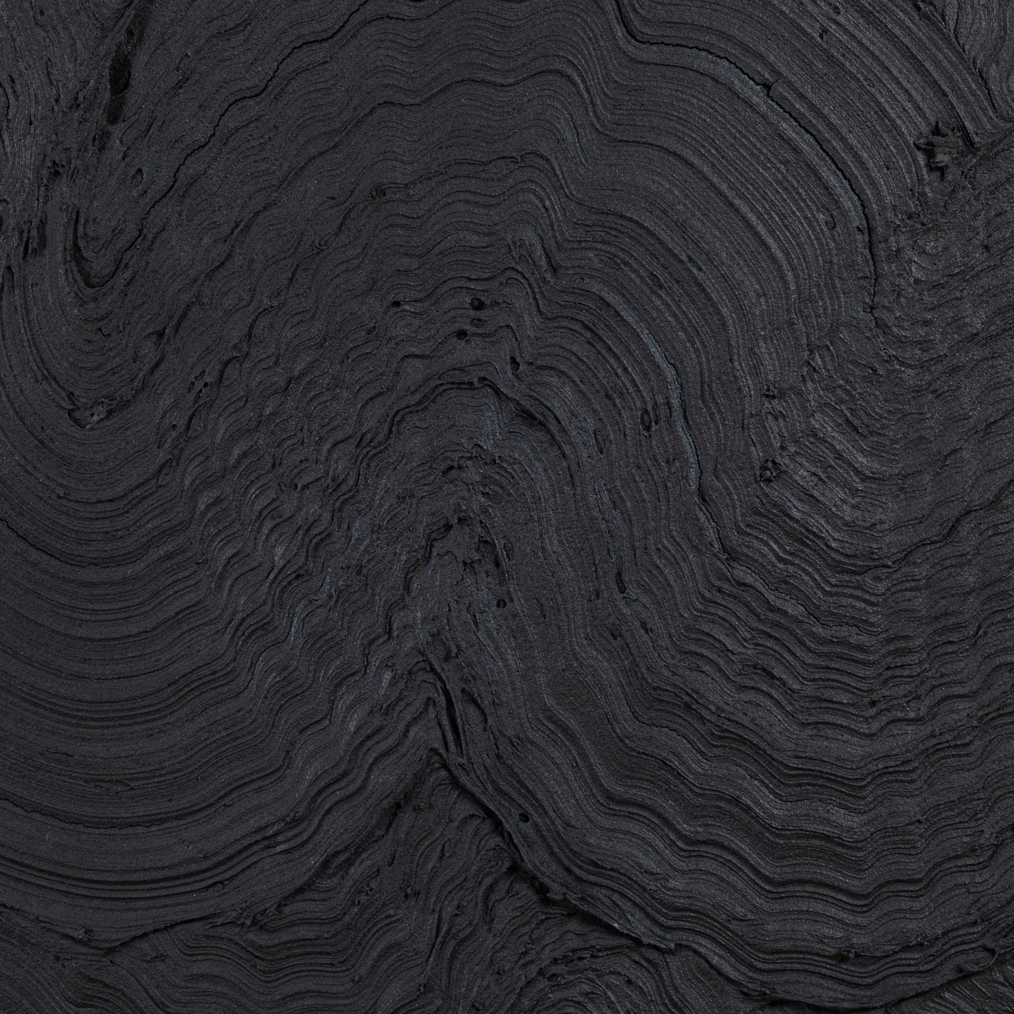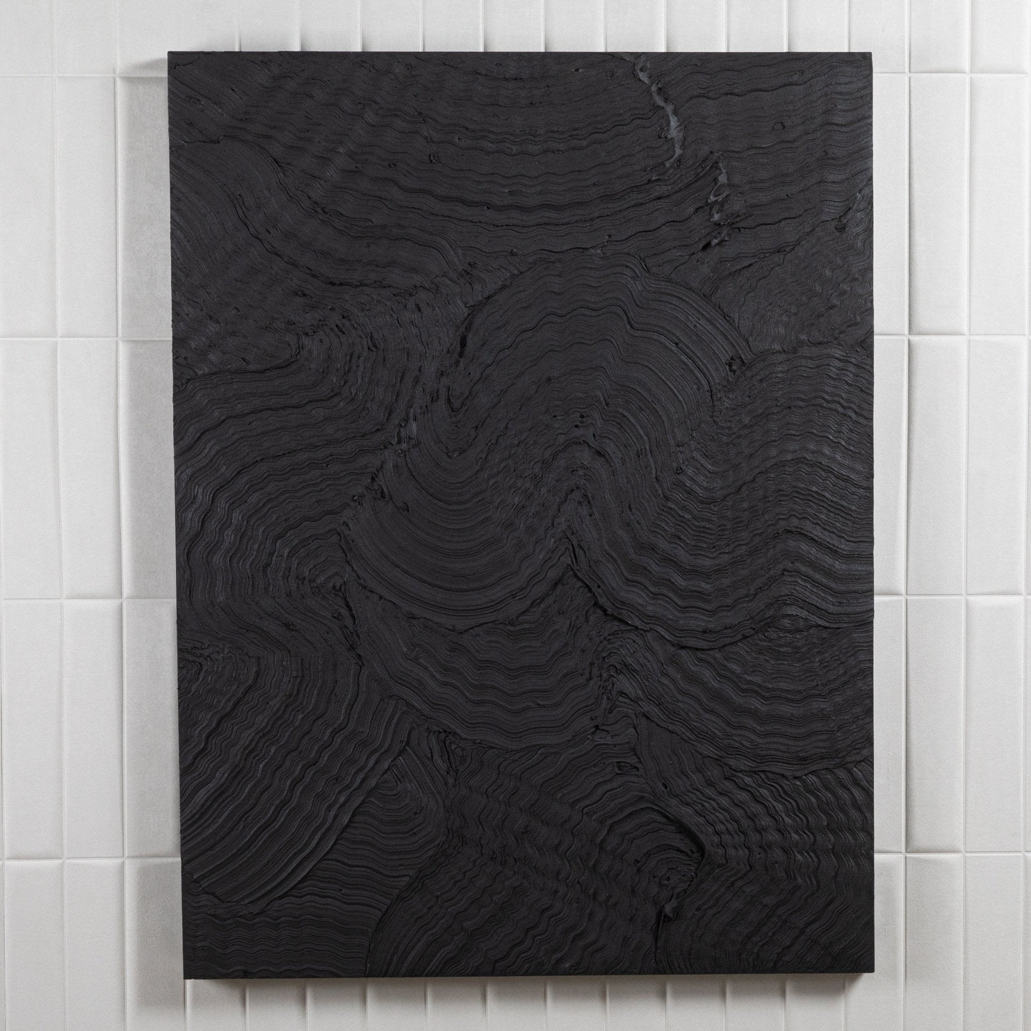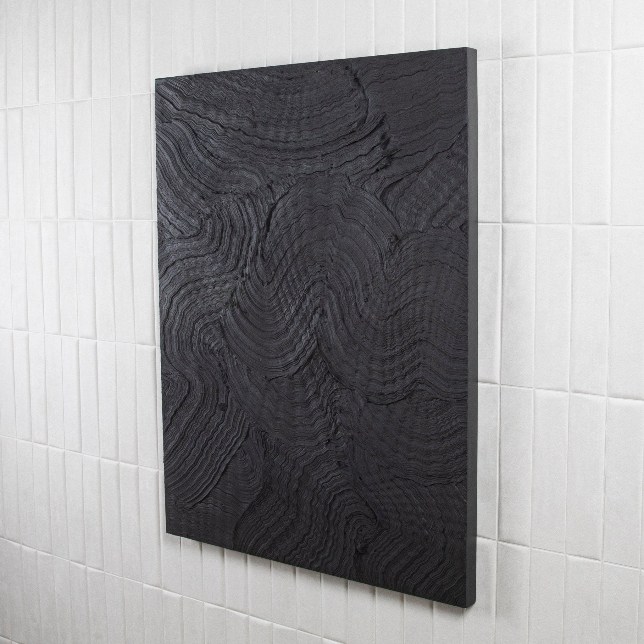 A captivating exploration of depth and dimension, this abstract textural painting by Michael Allen is a striking statement of modern artistry. Executed on a wood panel, the composition features bold, sculptural layers that interplay with light and shadow, creating a dynamic visual rhythm. The monochromatic palette intensifies the tactile quality of the piece, drawing the viewer into its intricately layered surface.