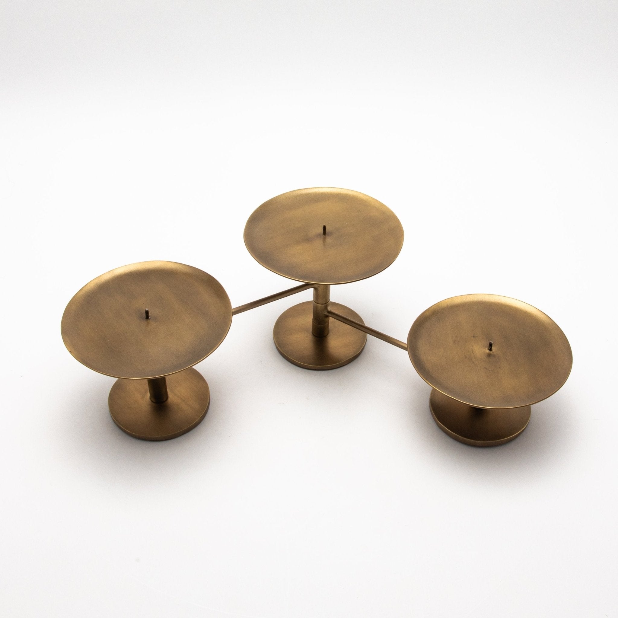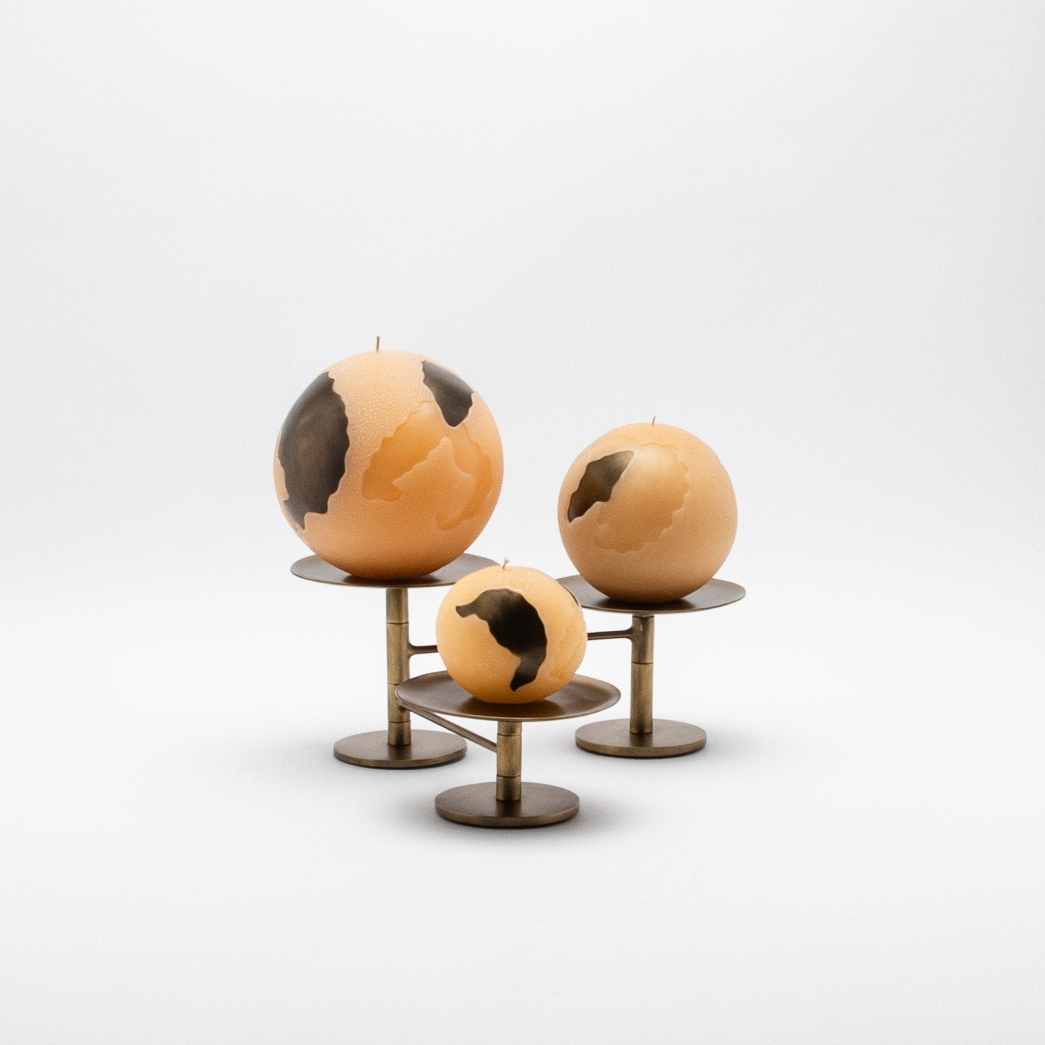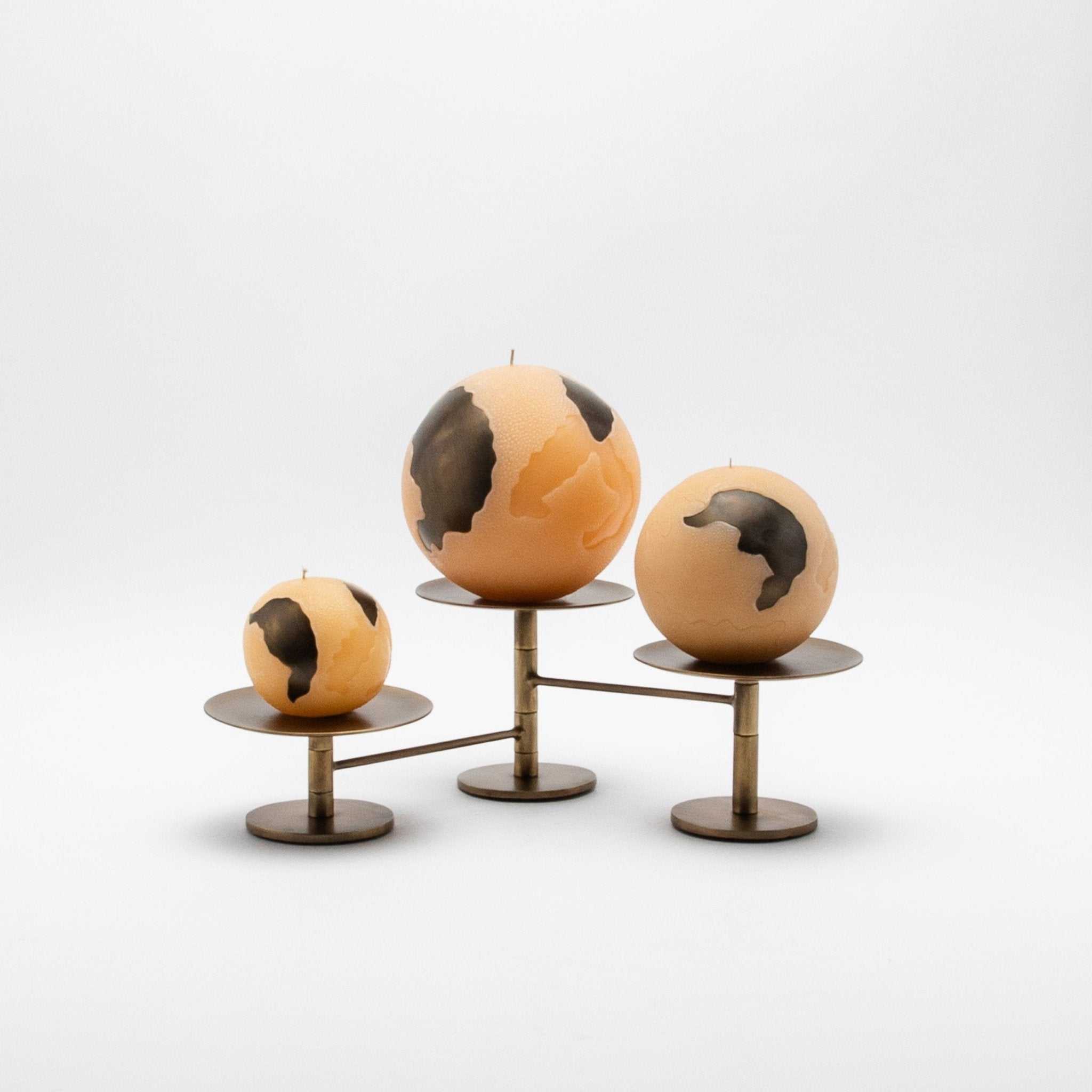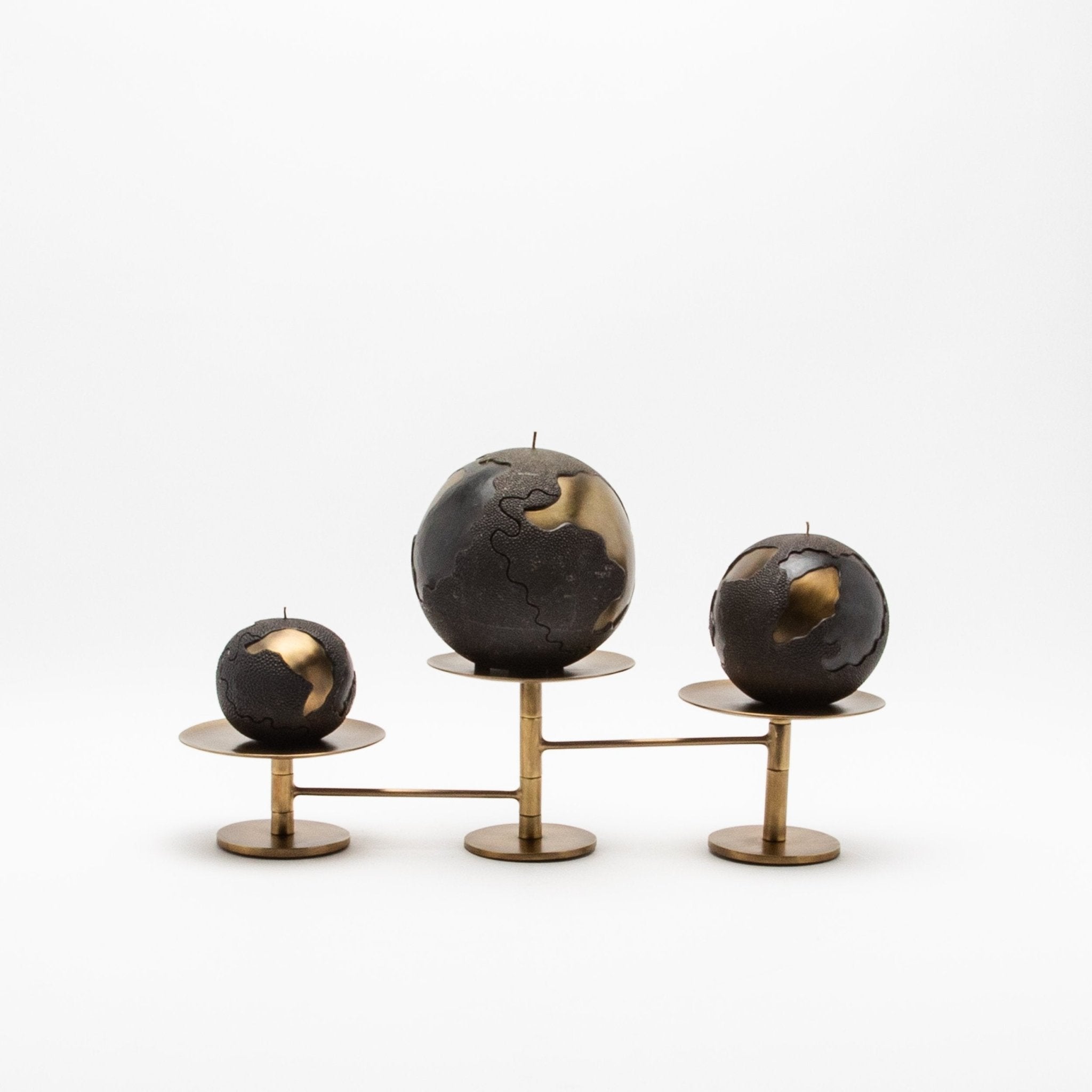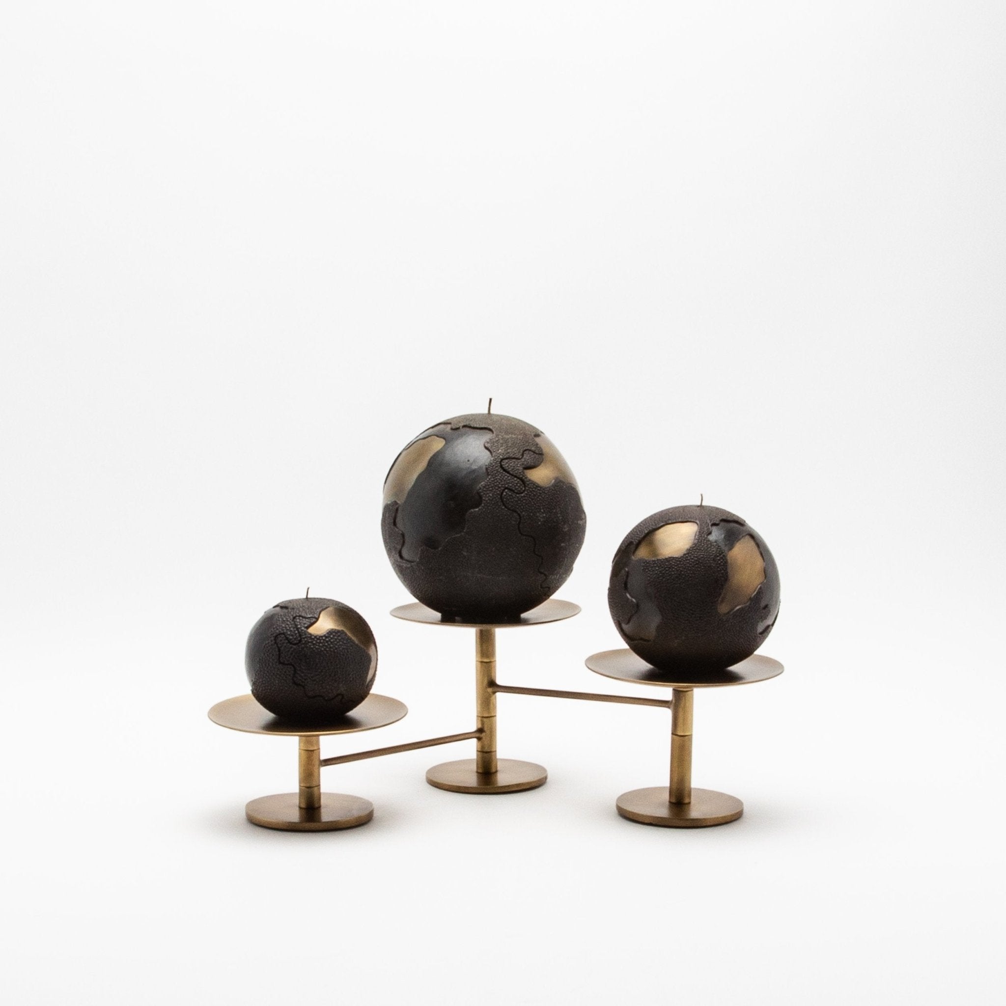 The 3-Top Mobile Sphere Pedestal by Patrick Coard Paris is a testament to modern design and exceptional craftsmanship. Featuring a trio of brass pedestals, this piece elegantly balances form and function with its sculptural composition. Each platform is meticulously hand-crafted, showcasing the warm, golden hue and natural patina of brass, lending a timeless elegance to the overall aesthetic. The interconnected design of the pedestals creates a dynamic visual rhythm, making it a standout addition to any sophisticated interior. Perfect for displaying candles, as shown, or other curated decor pieces, the pedestal embodies versatility while maintaining an unmistakable luxury appeal. Whether used as a centerpiece or an accent piece, this creation exudes the artistry and innovation synonymous with Patrick Coard Paris.