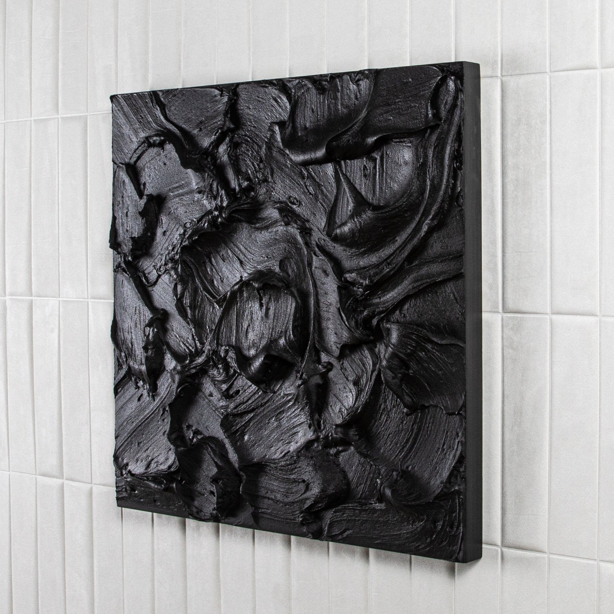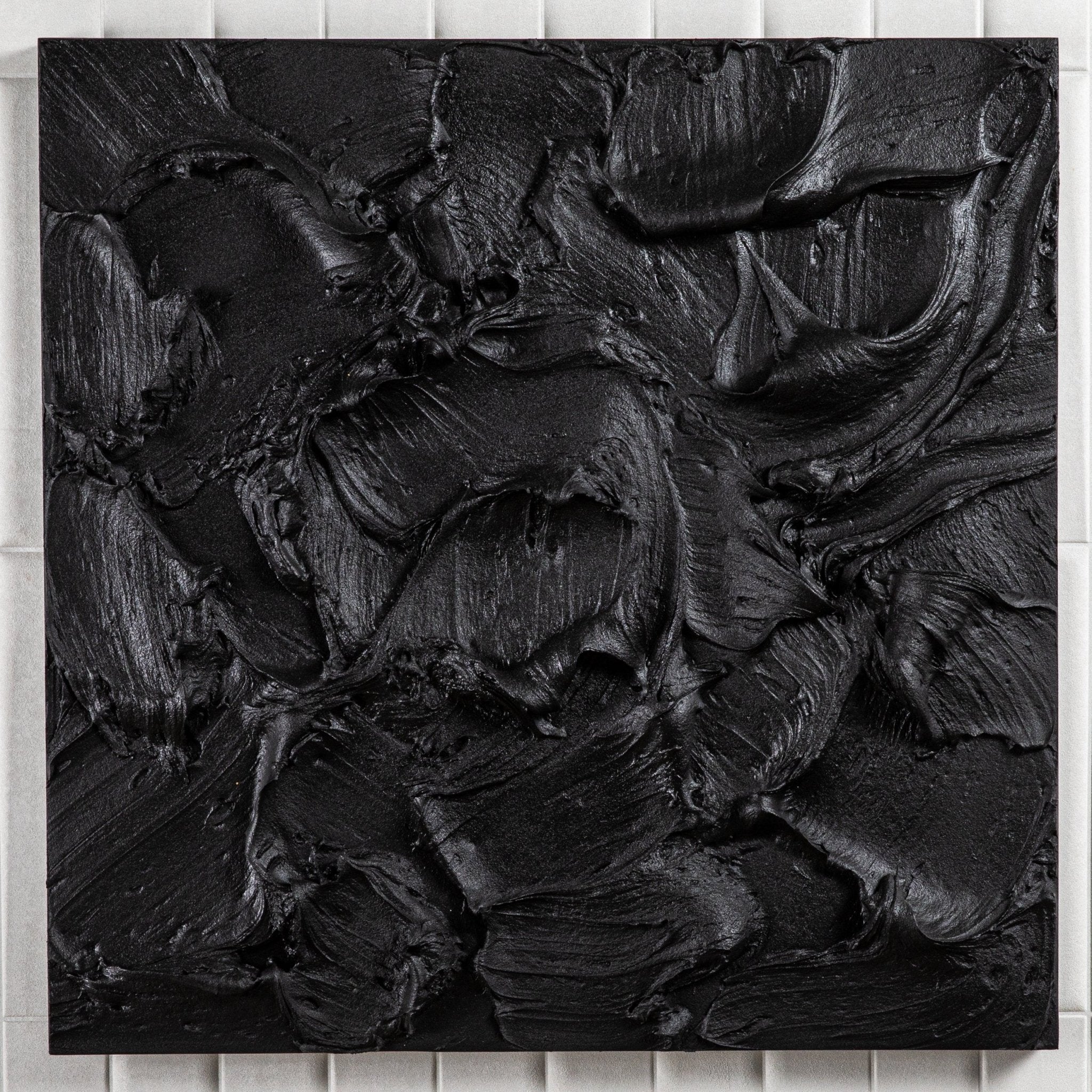 A captivating exploration of depth and dimension, this abstract textural painting by Michael Allen is a striking statement of modern artistry. Executed on a wood panel, the composition features bold, sculptural layers that interplay with light and shadow, creating a dynamic visual rhythm. The monochromatic palette intensifies the tactile quality of the piece, drawing the viewer into its intricately layered surface.