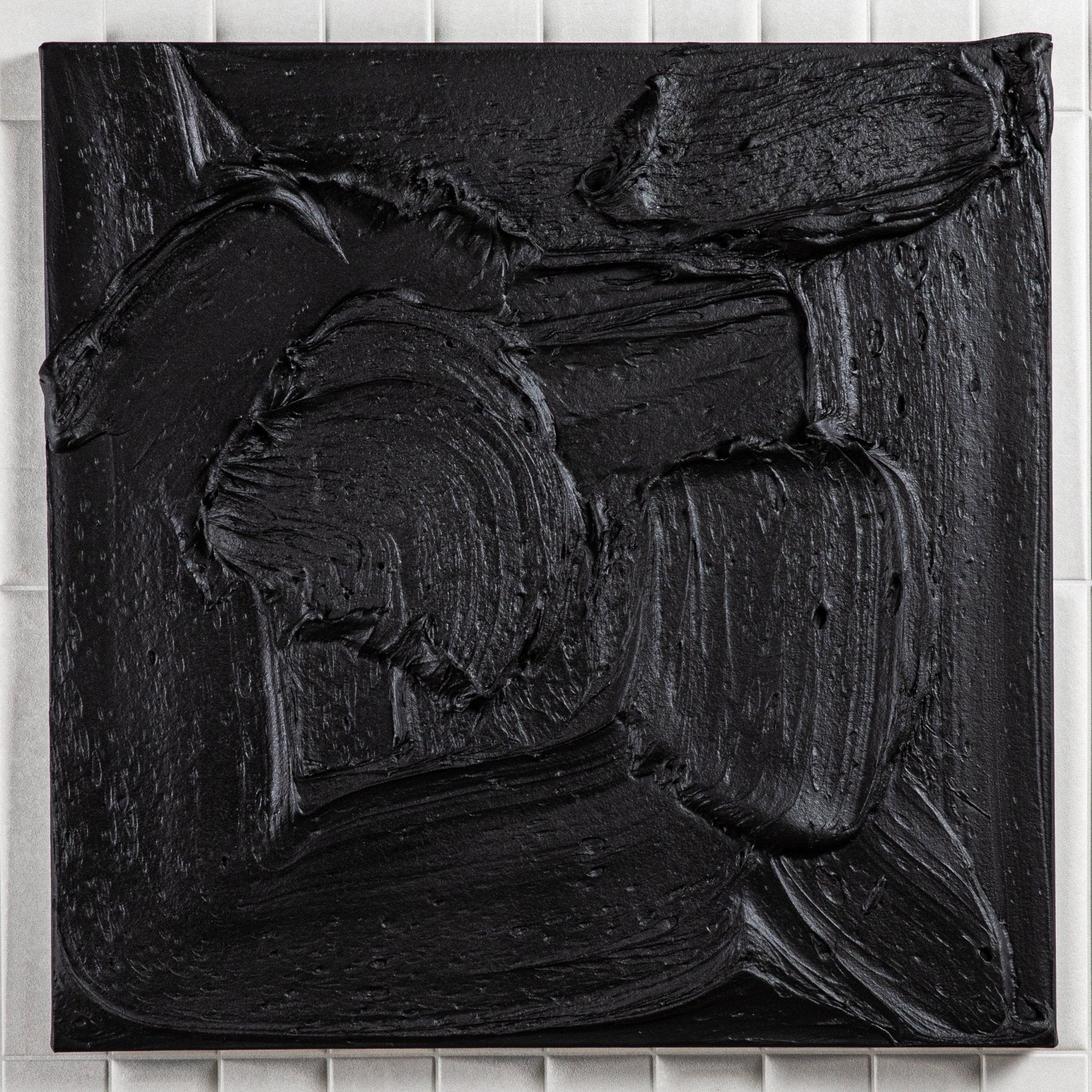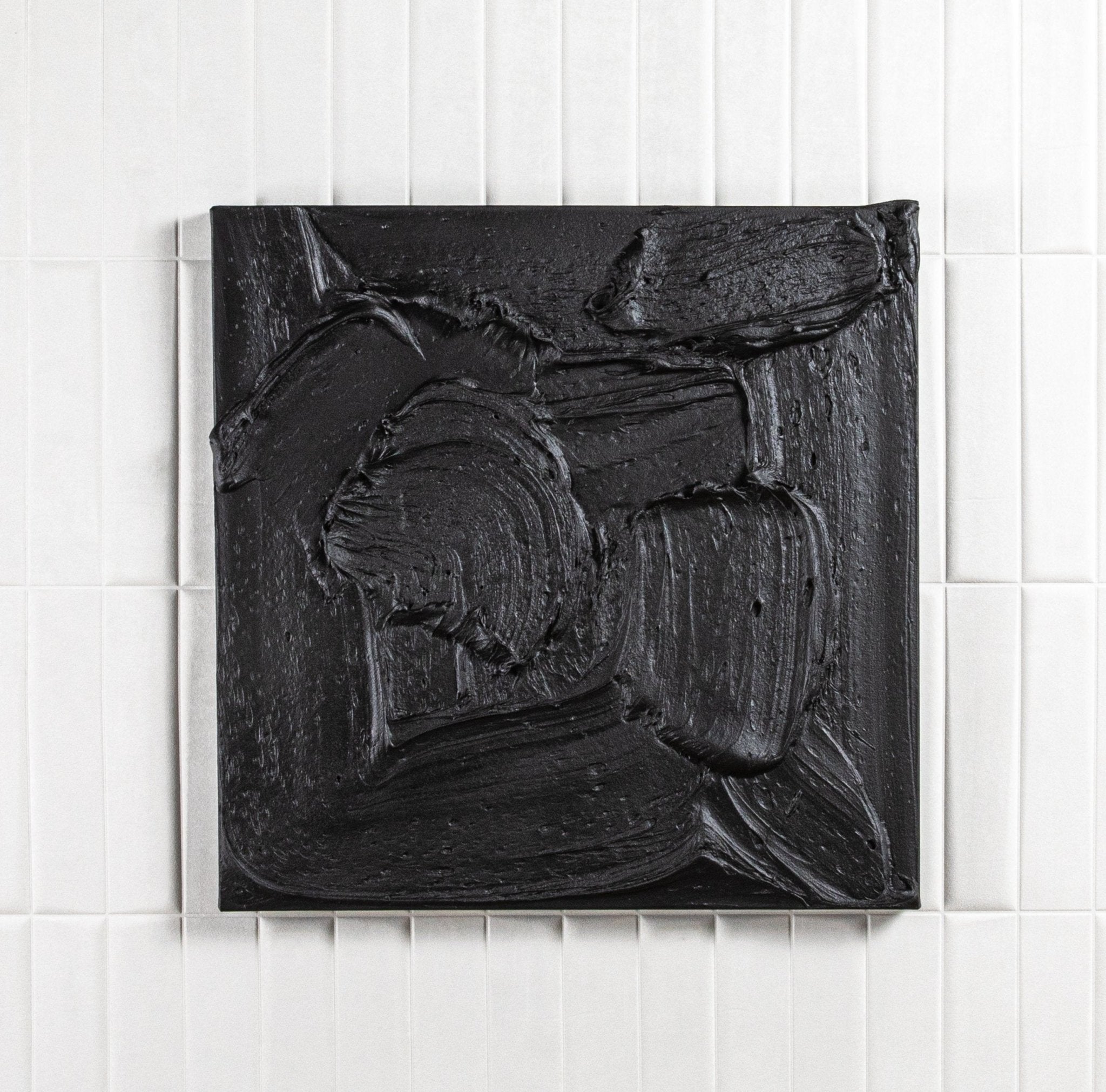 A captivating exploration of depth and dimension, this abstract textural painting by Michael Allen is a striking statement of modern artistry. Executed on a wood panel, the composition features bold, sculptural layers that interplay with light and shadow, creating a dynamic visual rhythm. The monochromatic palette intensifies the tactile quality of the piece, drawing the viewer into its intricately layered surface.