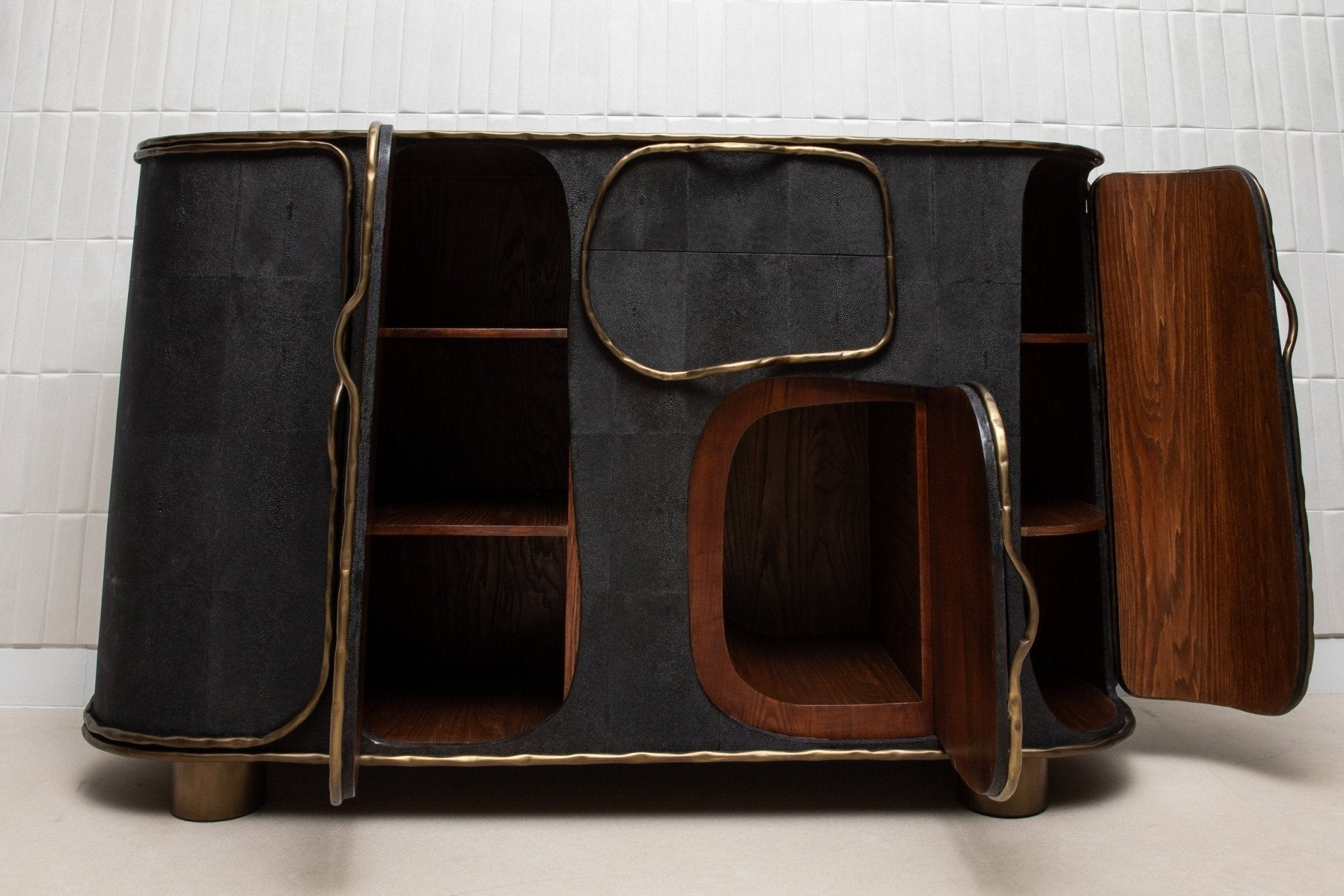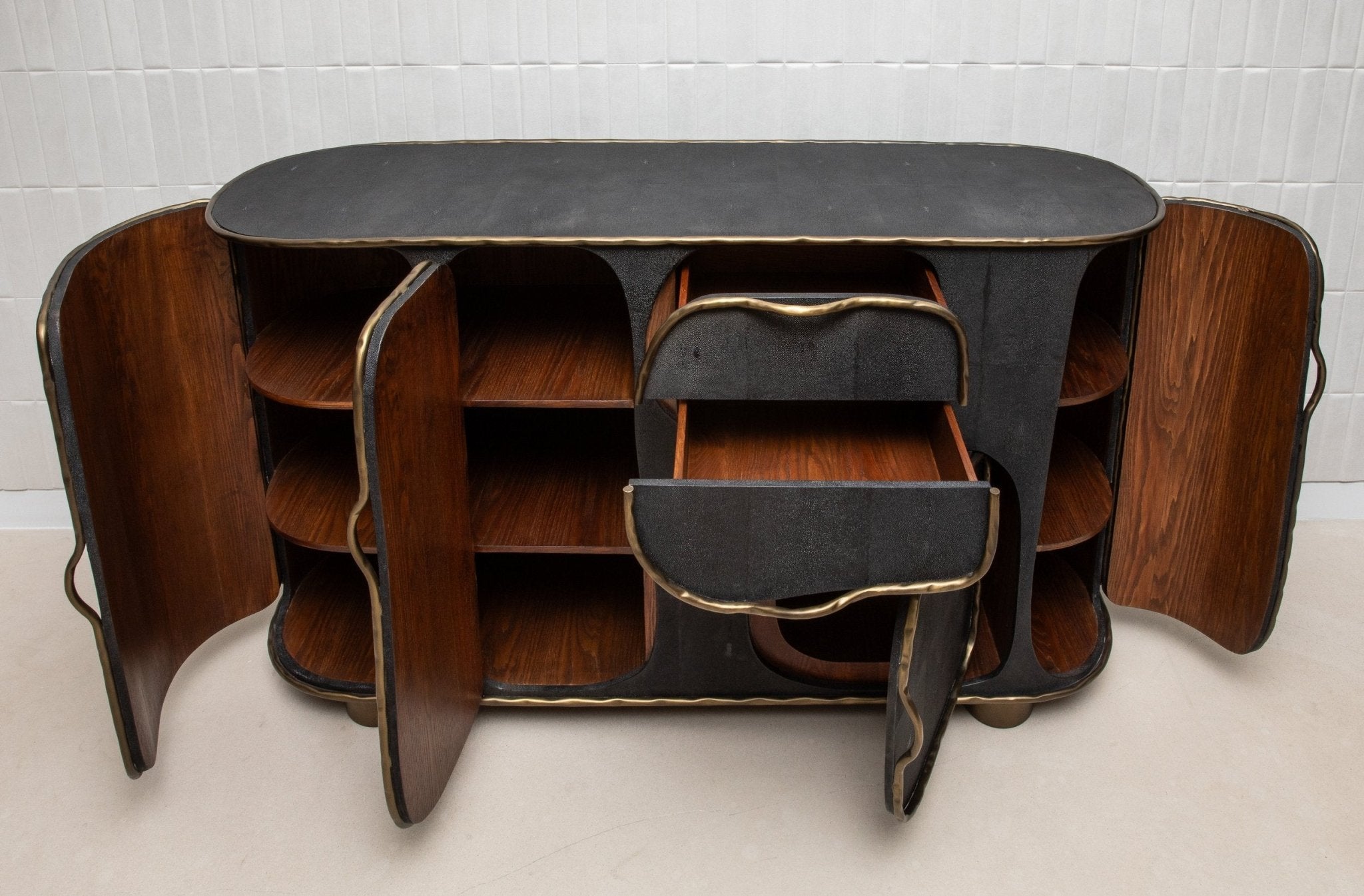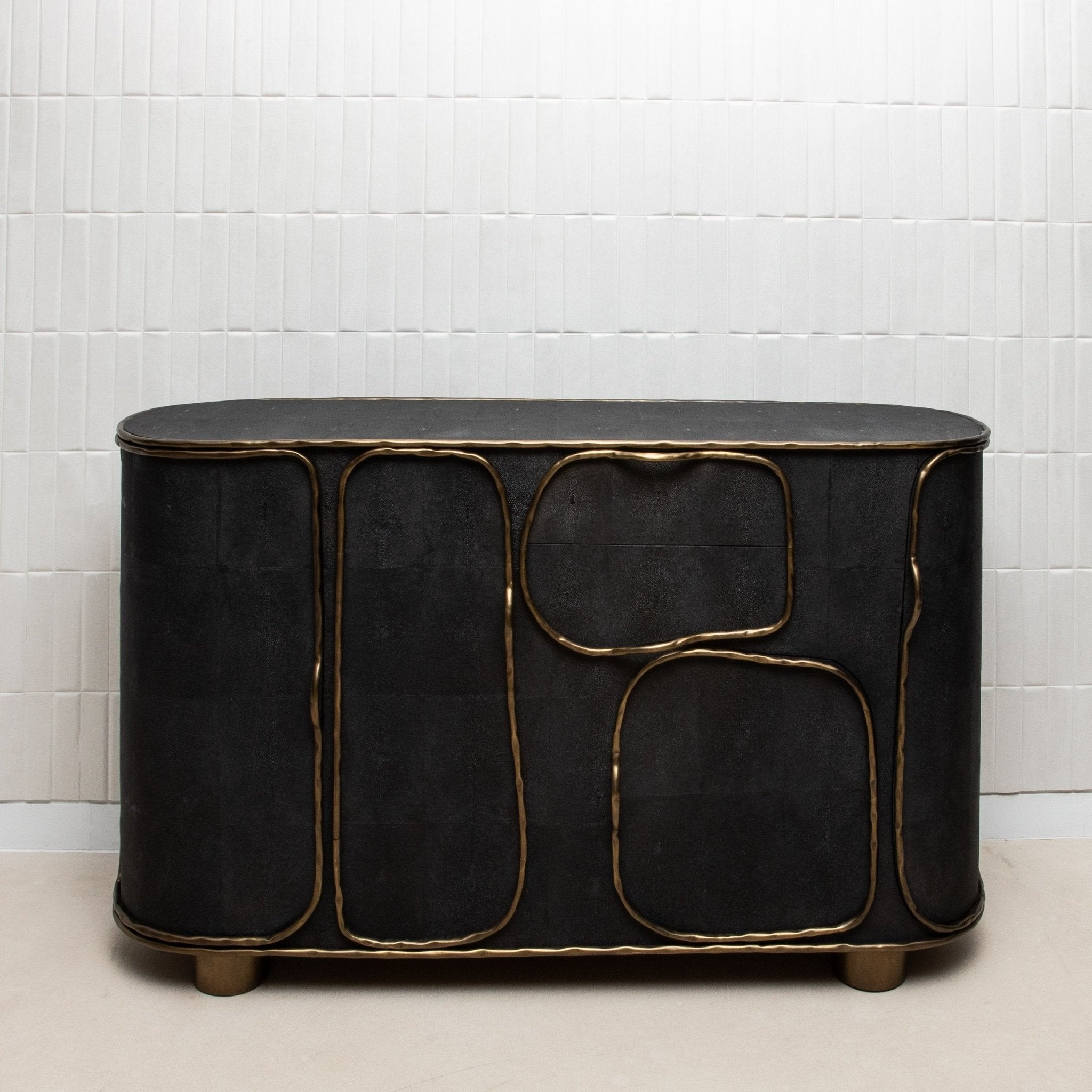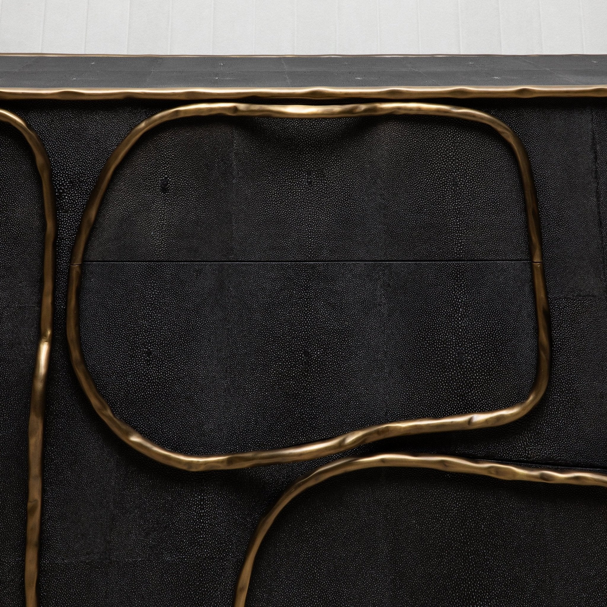 The Arianne Buffet by R&Y Augousti is a masterpiece of modern luxury, blending exquisite craftsmanship with an avant-garde design. Handcrafted from luxurious black shagreen, this buffet showcases a unique textured surface, beautifully contrasted by flowing lines of bronze patina brass that create an organic, fluid design. The curvaceous form of the buffet, paired with its intricate detailing, makes it a true statement piece in any interior, effortlessly elevating the ambiance with its bold yet refined presence.