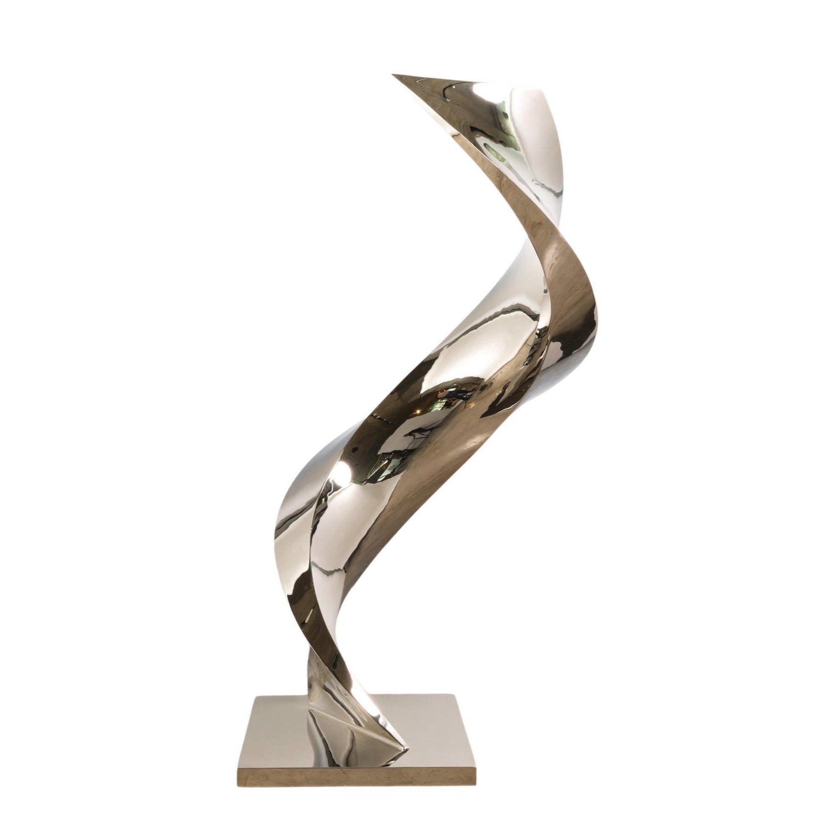 Cubus Spiralis, a standout piece from Katz Studio's Geometra collection, embodies the essence of geometric minimalism while challenging its boundaries. This mesmerizing sculpture rises from its base in a twisting, ribbon-like shape that defies gravity and perception, exemplifying the collection's focus on elemental forms and spatial dynamics.