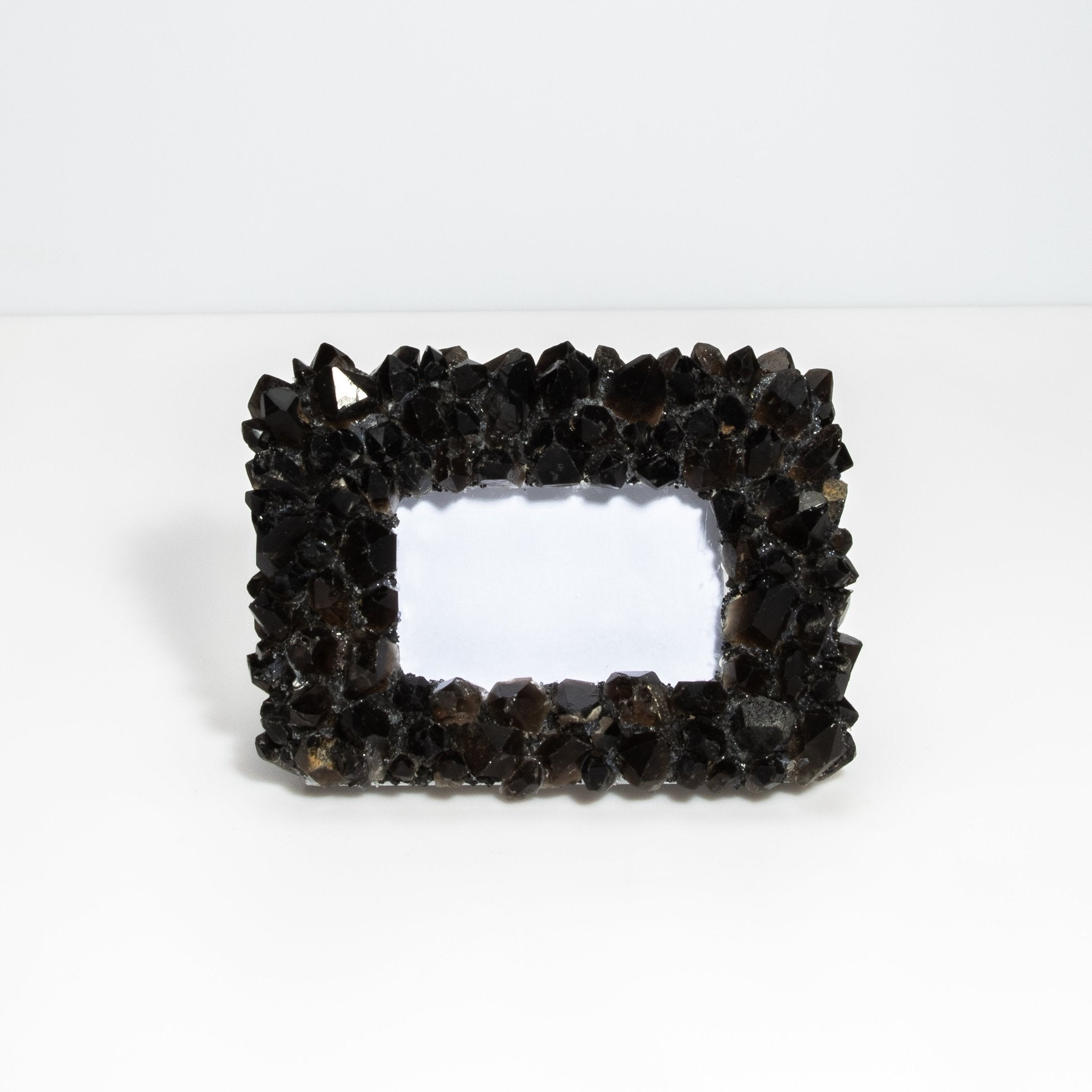 This Kathryn McCoy frame, adorned with black quartz crystals, is a perfect blend of elegance and natural beauty. The frame showcases the intricate structure and deep, rich tones of black quartz, making it a standout piece for any home or office. Handcrafted by skilled artisans, the frame's unique design ensures that no two pieces are exactly alike, providing a truly one-of-a-kind addition to your decor. Ideal for displaying cherished memories, this frame not only serves a functional purpose but also adds a touch of luxury and sophistication to any space.