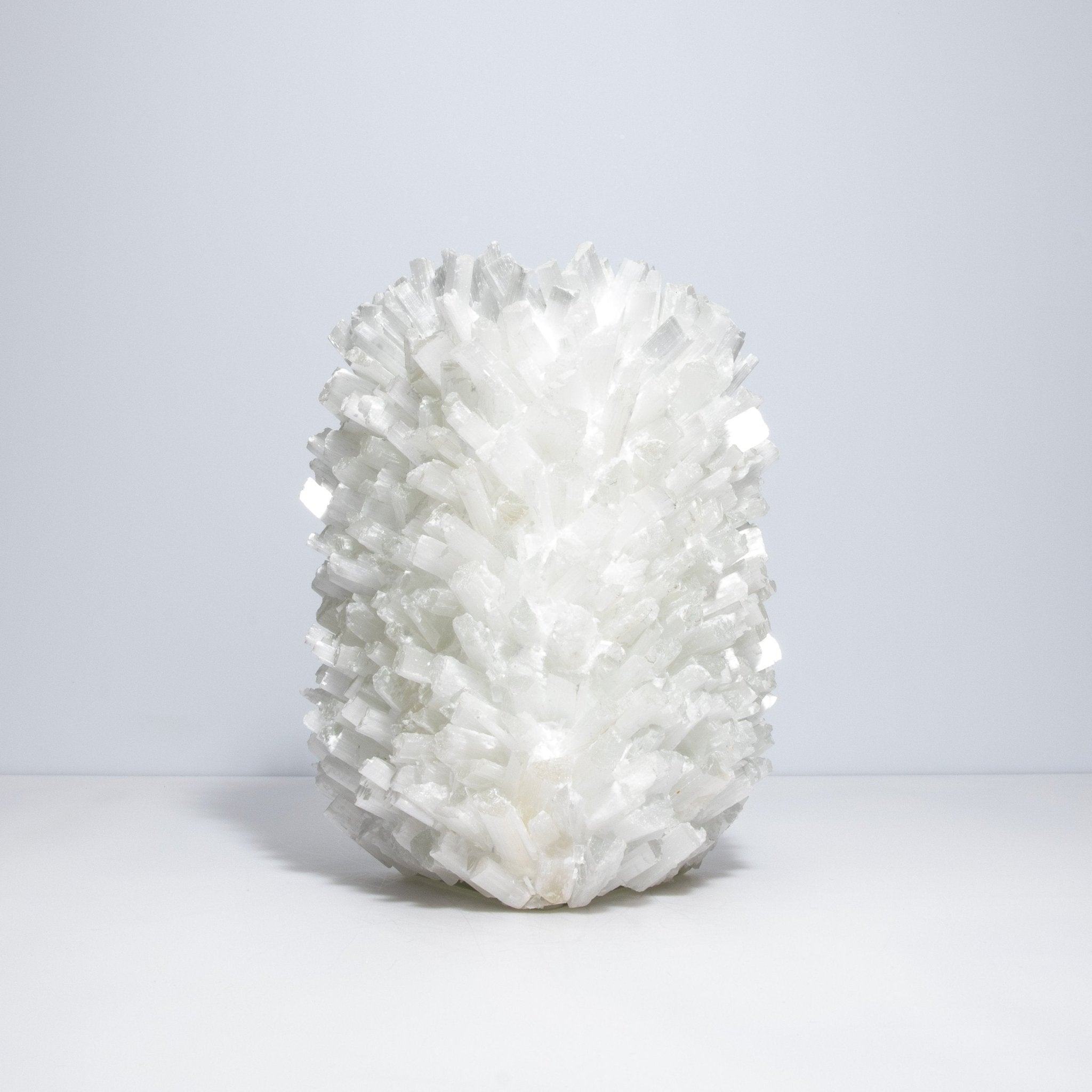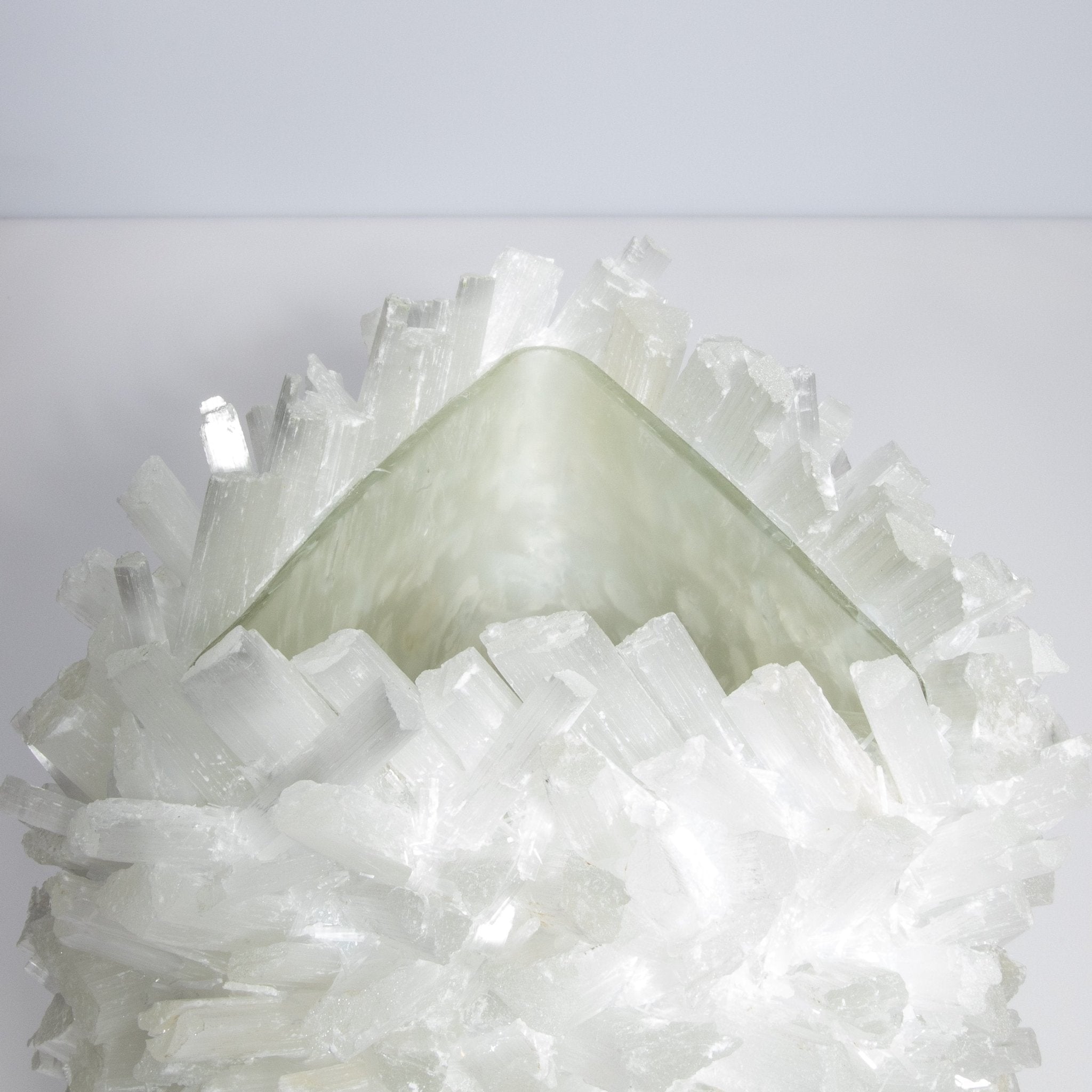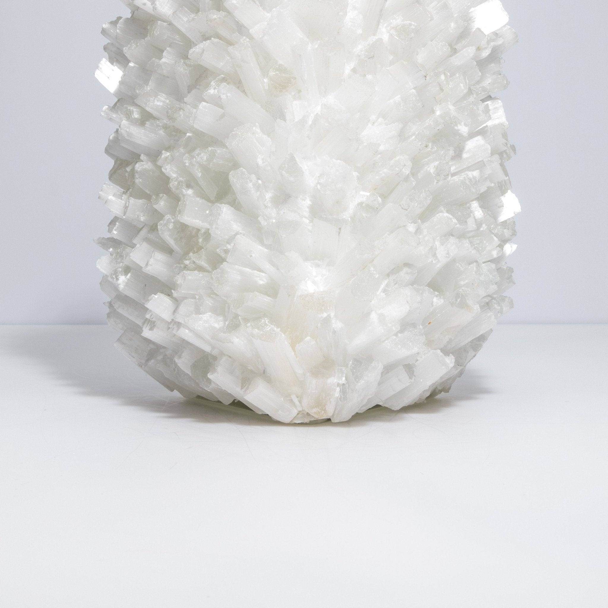 Selenite vases serve as ideal containers for floral arrangements, branches, or decorative stems, adding a touch of sophistication and refinement to any room. Their substantial weight ensures stability, while their sturdy construction makes them durable and long-lasting. The brilliance of the selenite, combined with Kathryn McCoy's meticulous attention to detail, creates a piece that is not only functional but also a luxurious work of art.