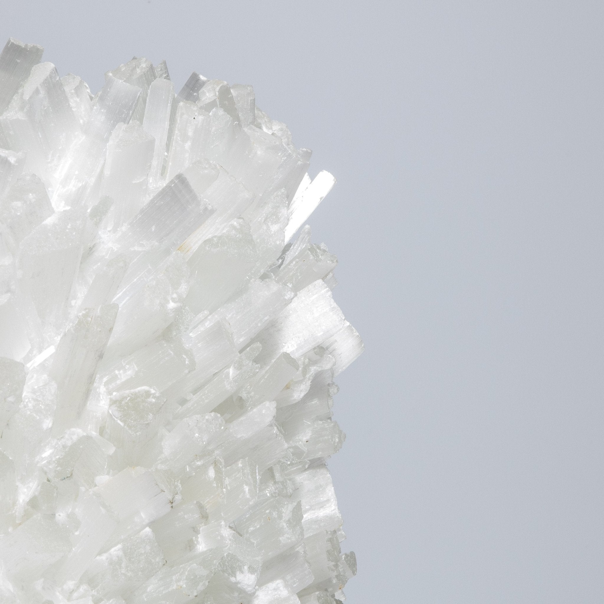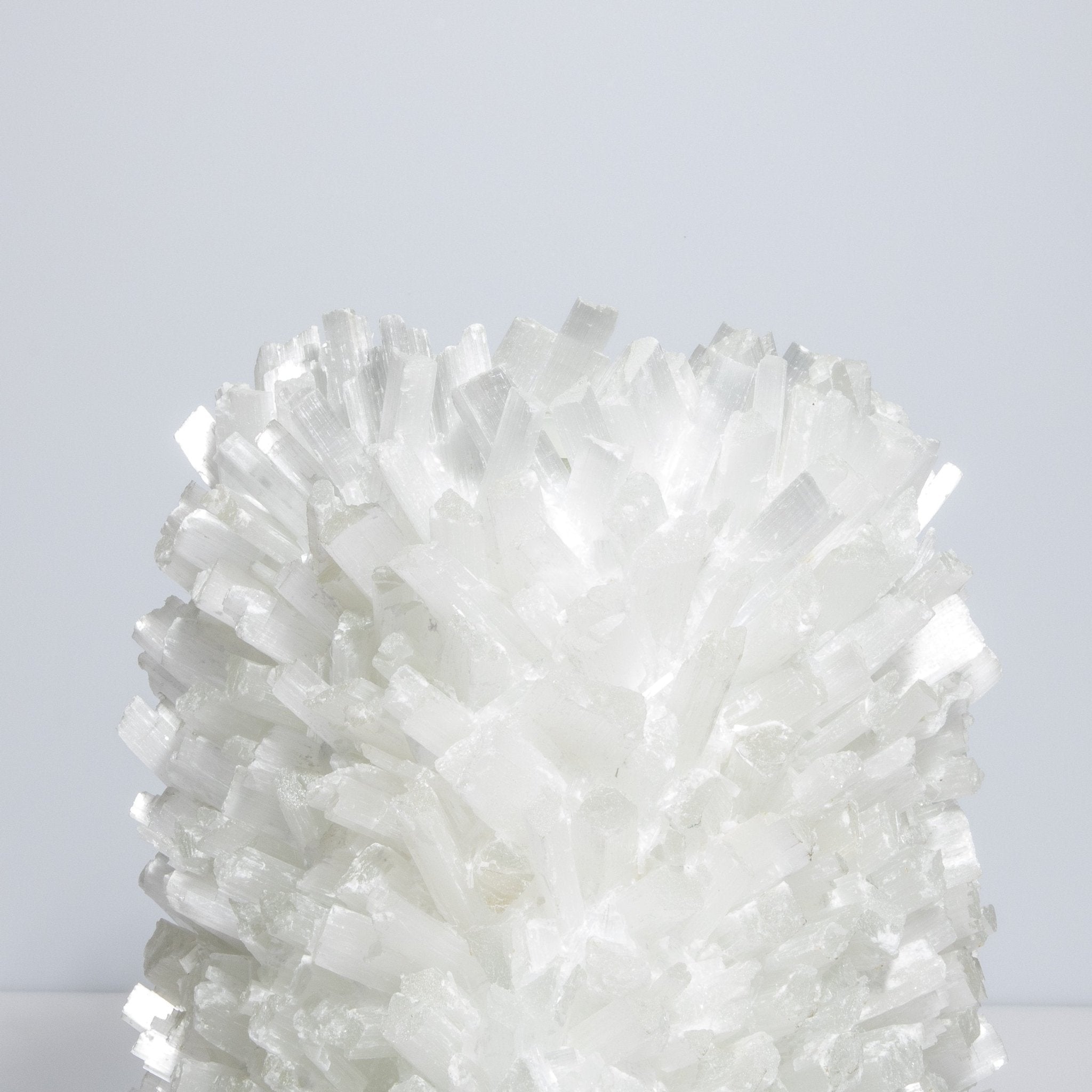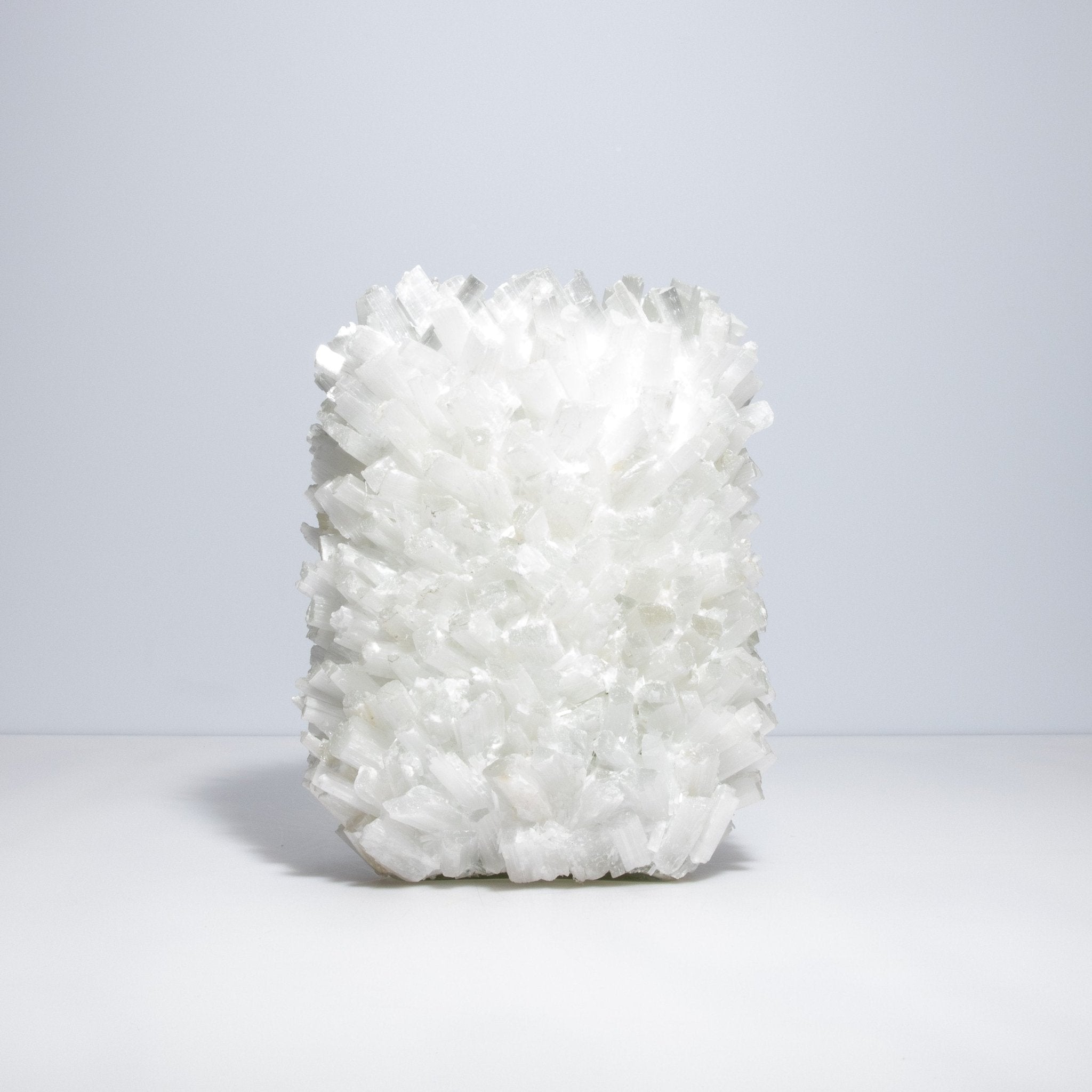 Selenite vases serve as ideal containers for floral arrangements, branches, or decorative stems, adding a touch of sophistication and refinement to any room. Their substantial weight ensures stability, while their sturdy construction makes them durable and long-lasting. The brilliance of the selenite, combined with Kathryn McCoy's meticulous attention to detail, creates a piece that is not only functional but also a luxurious work of art.