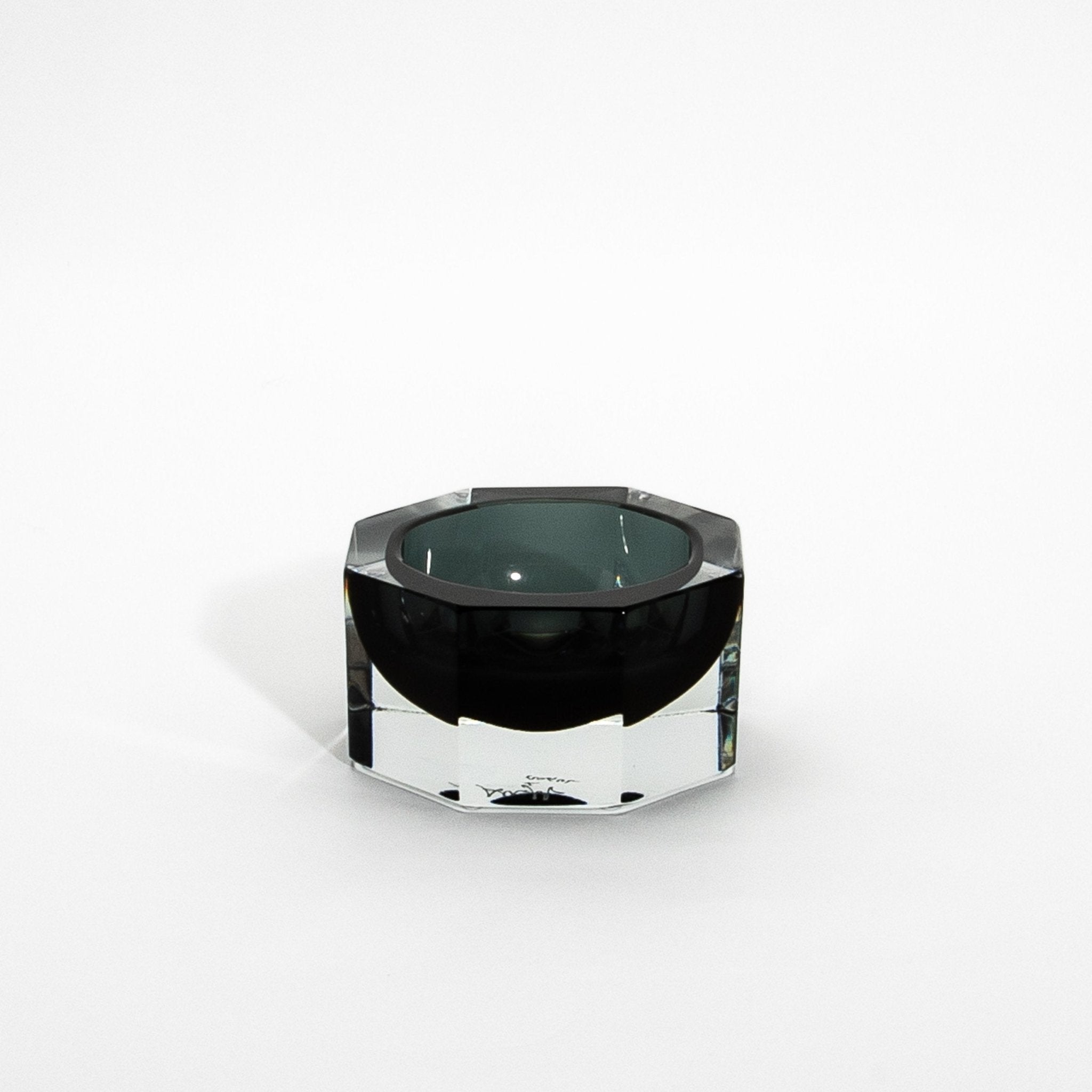 This exquisite hand-blown Murano ashtray in grey is a true testament to the artistry of Venetian glassmaking. Featuring a faceted geometric design, it captures and reflects light with mesmerizing brilliance, enhancing its deep grey tones encased within crystal-clear glass. The seamless blend of modern elegance and traditional craftsmanship makes it a standout piece, whether used as a functional ashtray or displayed as a sculptural element. Each angle and edge of its meticulously crafted form showcases the artisan's precision, creating a play of light and shadow that transforms any space it inhabits. Perfect for collectors or as a thoughtful gift, this Murano ashtray embodies sophistication and timeless luxury, making it a versatile accent for both contemporary and classic interiors.