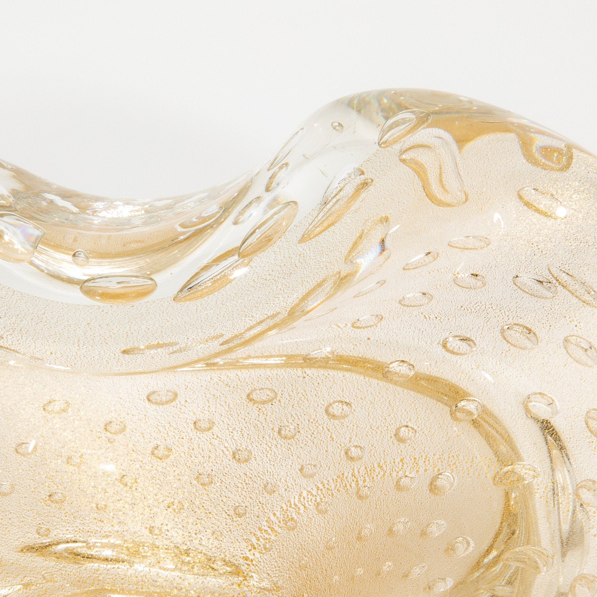 This exquisite hand-blown Murano dish embodies timeless Italian craftsmanship, showcasing a delicate fusion of artistry and opulence. Crafted from crystal-clear Murano glass, the piece is infused with 24-karat gold flecks, creating an ethereal sparkle that catches and refracts light in mesmerizing patterns. Its flowing, organic form is accentuated by intricate bullicante detailing—capturing air bubbles in the glass for a striking textural effect—highlighting the artisan’s unparalleled skill. A harmonious blend of curves and subtle asymmetry gives the dish a contemporary edge while preserving its classic elegance. Perfect as a statement decor piece or a sophisticated centerpiece, this one-of-a-kind creation elevates any space with its luxurious materials and sculptural design. An irreplaceable treasure that celebrates Venetian glassmaking heritage.