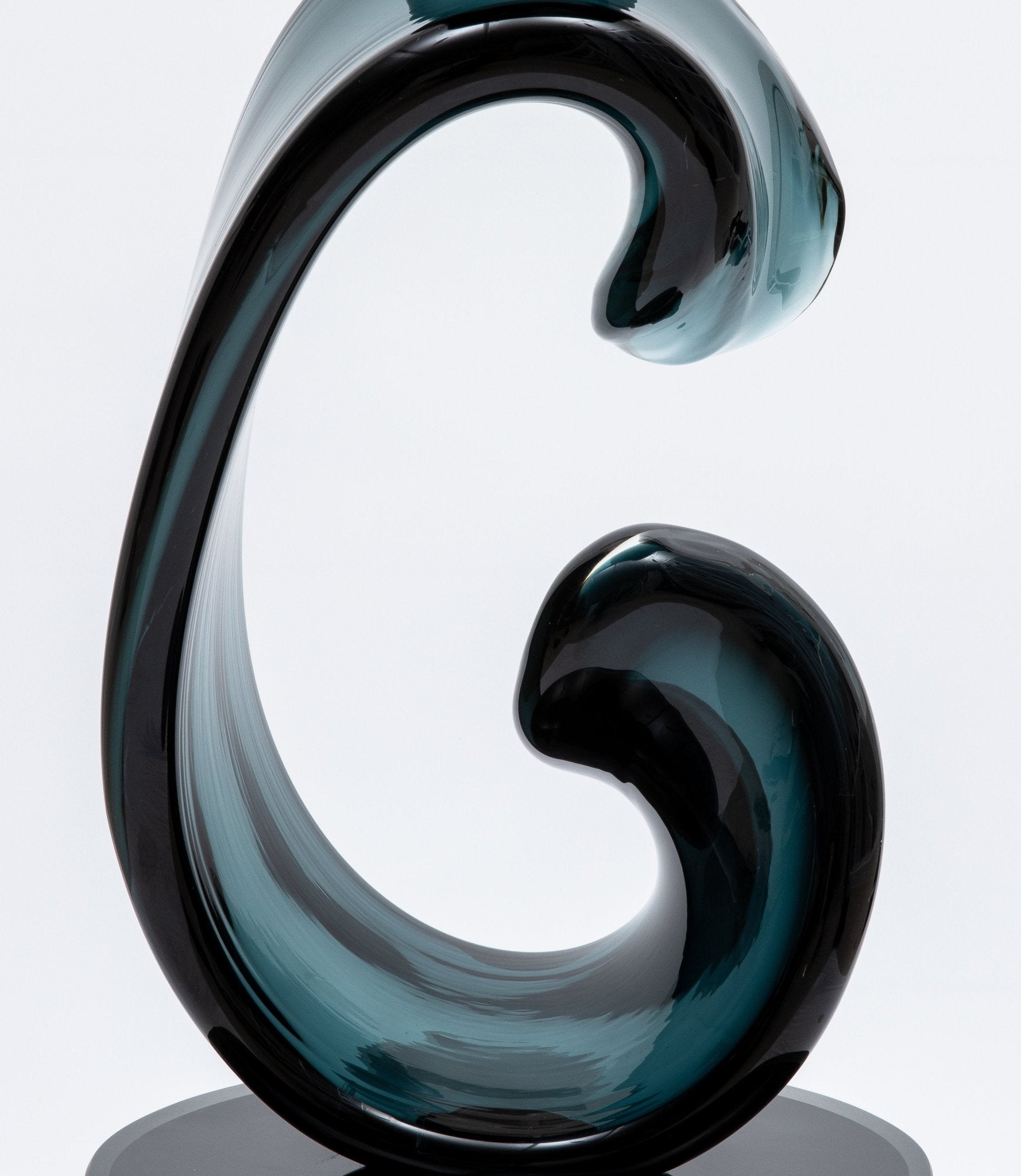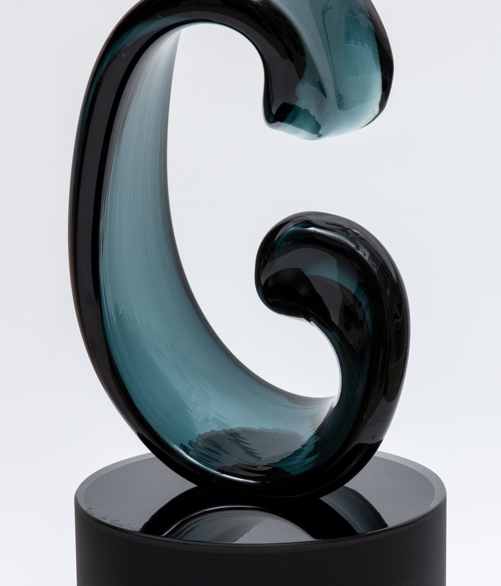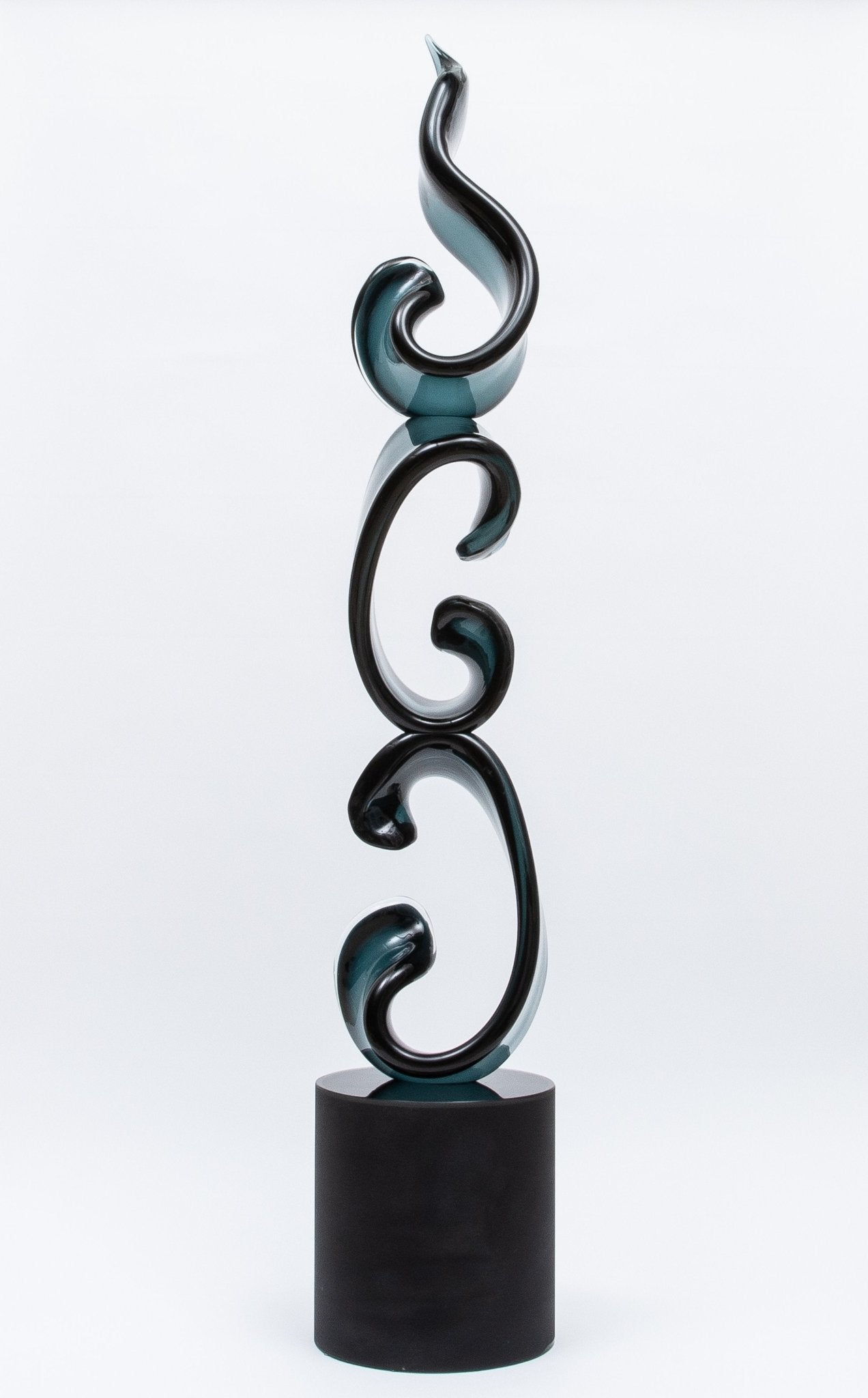 The deep, rich tones of the hand-blown glass interact beautifully with light, casting mesmerizing reflections that accentuate the sculpture's sinuous forms. Attached securely to a sleek glass pedestal, the sculpture exudes a modern sophistication, making it a captivating focal point in any setting. The combination of traditional Venetian glassmaking techniques with contemporary design sensibilities results in a piece that is both timeless and avant-garde.