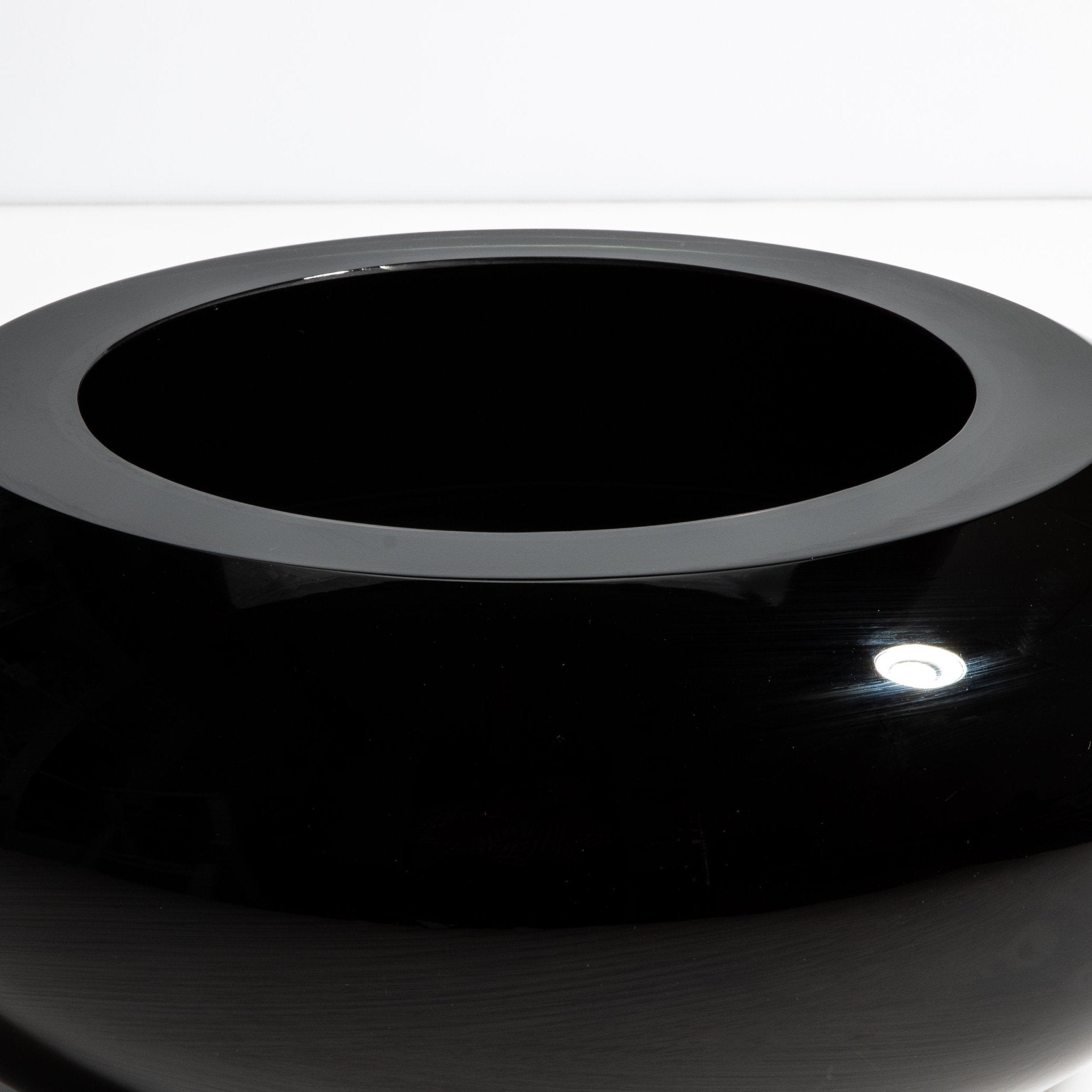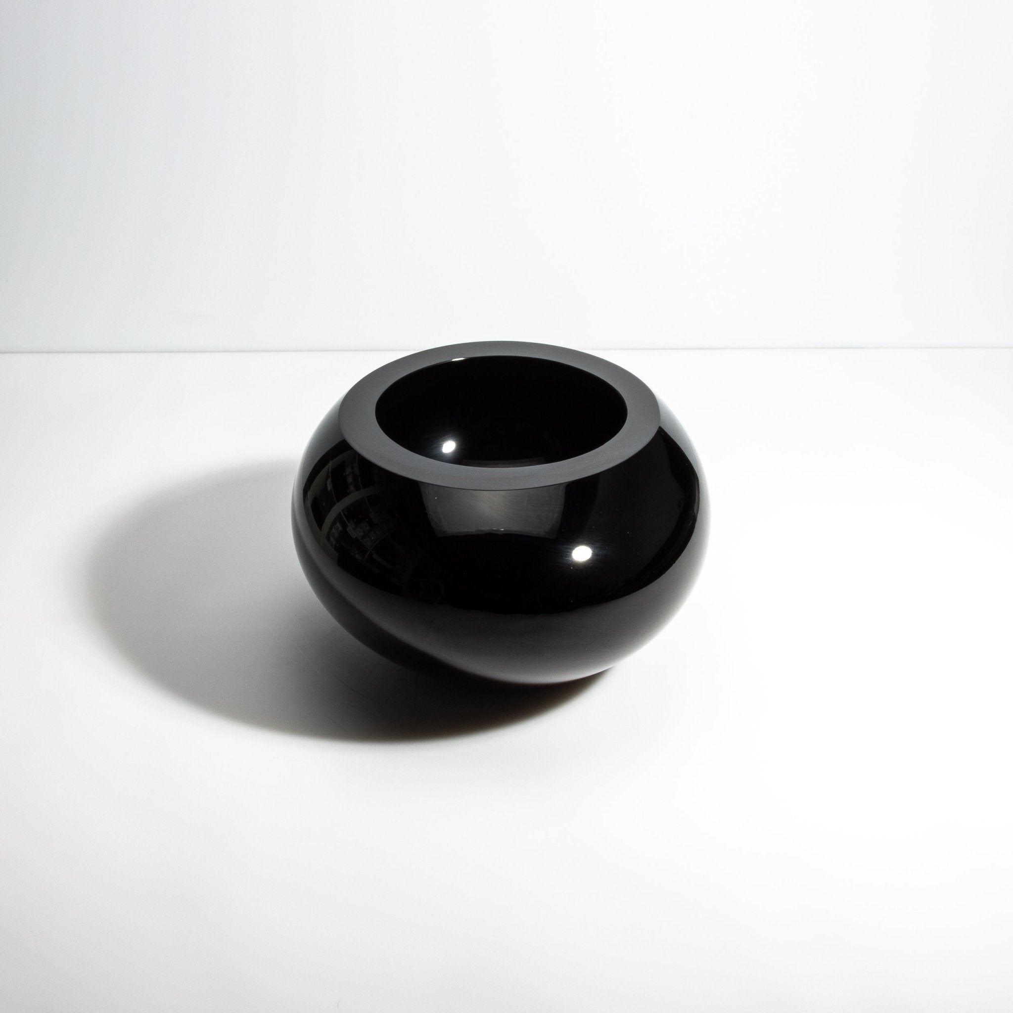 Indulge in the exquisite elegance of this masterpiece of Murano glass artistry. Handcrafted by the renowned artisans of Venice, this luxurious bowl exudes sophistication with its deep, glossy black finish. The smooth, rounded silhouette is a testament to the impeccable craftsmanship and attention to detail that Murano glassmakers are celebrated for. Each piece is carefully shaped and polished, resulting in a flawless surface that reflects light beautifully, creating a mesmerizing play of highlights across its deep onyx black surface.