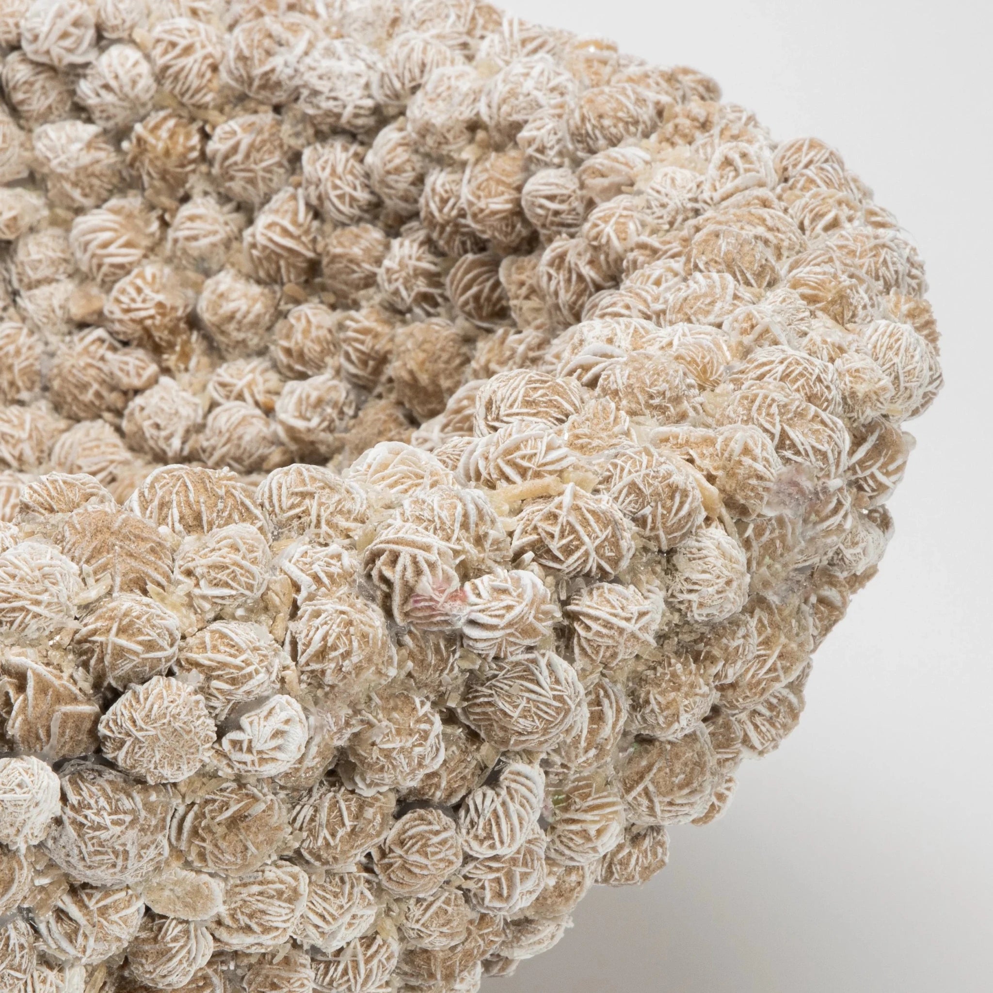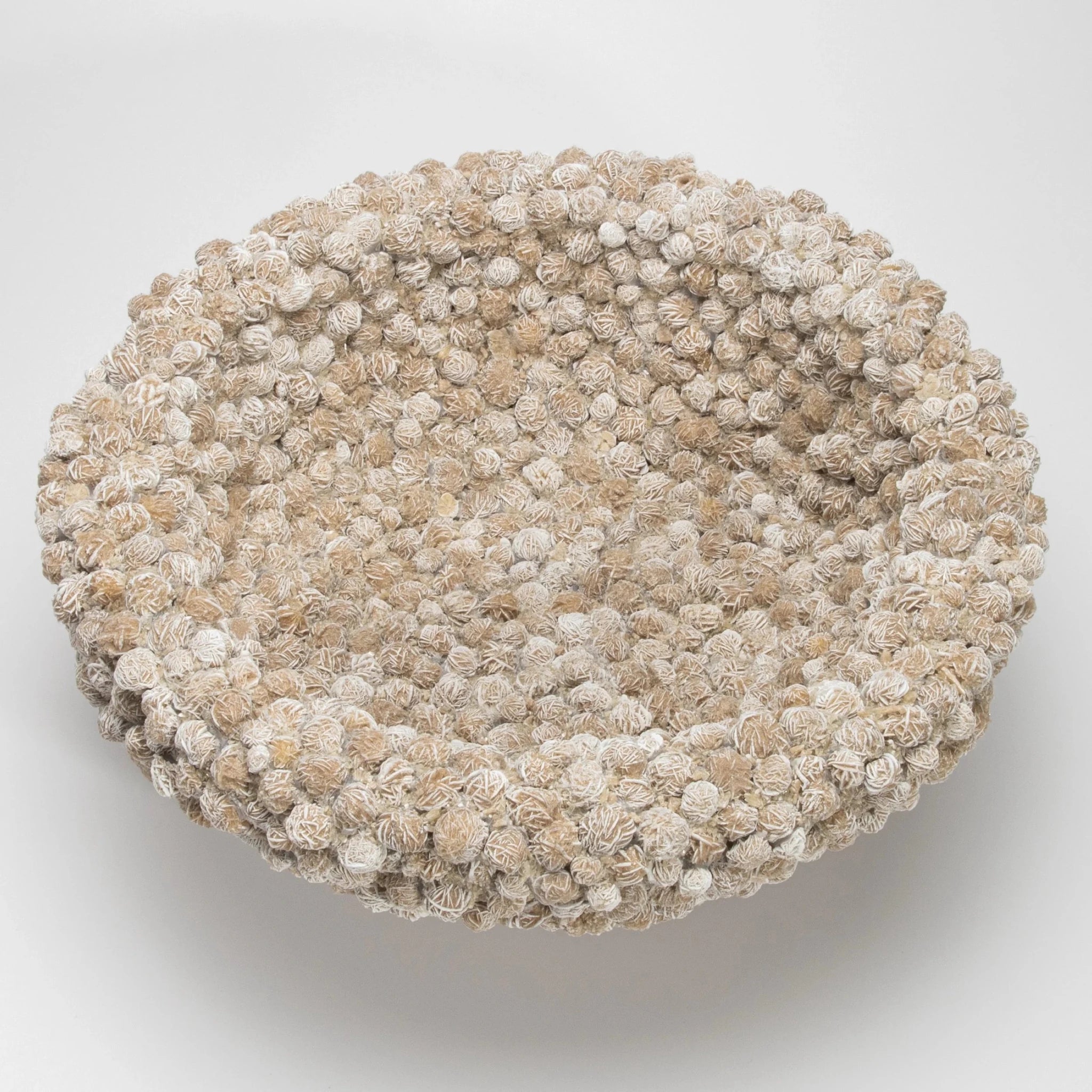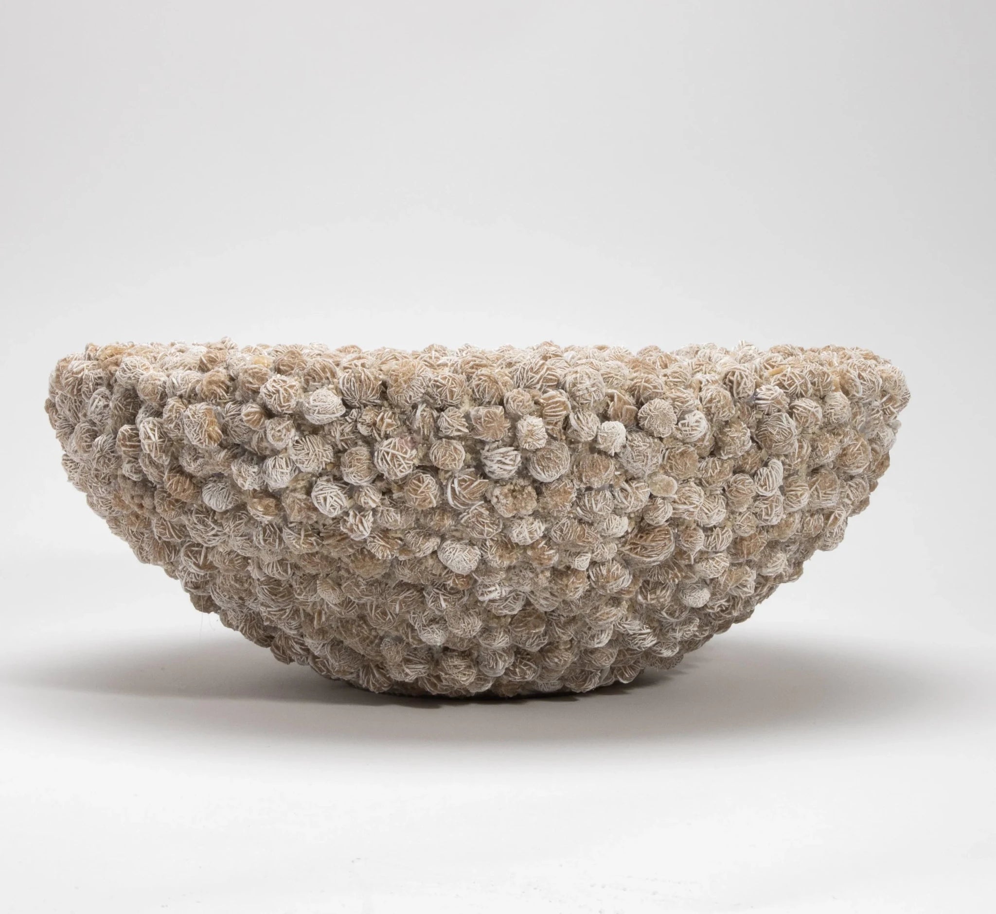 A sculptural treasure born from the raw elegance of nature, this Inside-Out Bowl by Kathryn McCoy is meticulously handcrafted from Desert Rose Selenite. Each individual mineral rosette—delicately layered in earthy tones of sand and ivory—is arranged with precision to create a soft, organic texture that feels both ancient and refined. The surface dances with intricate crystal formations, offering a tactile richness that beckons the hand while capturing and diffusing light in a mesmerizing glow.