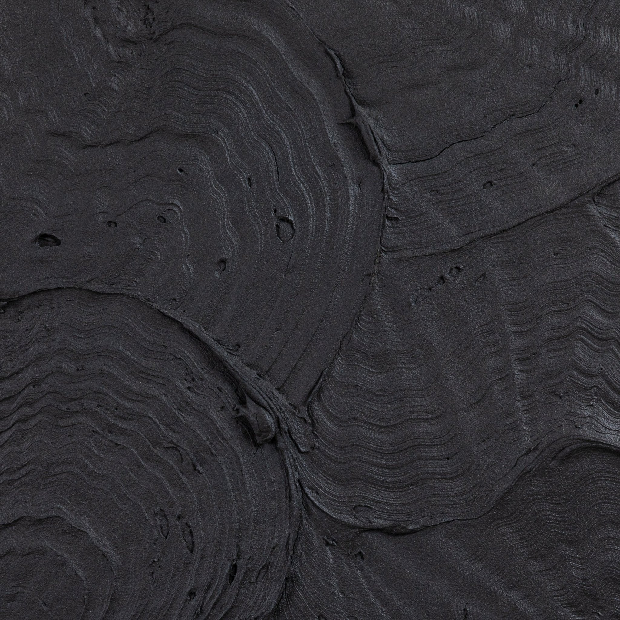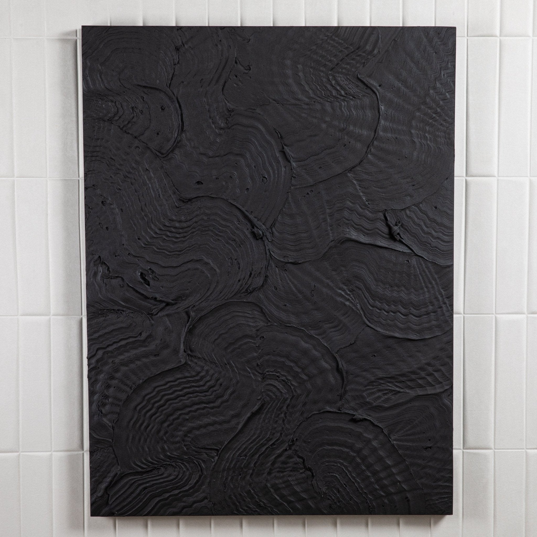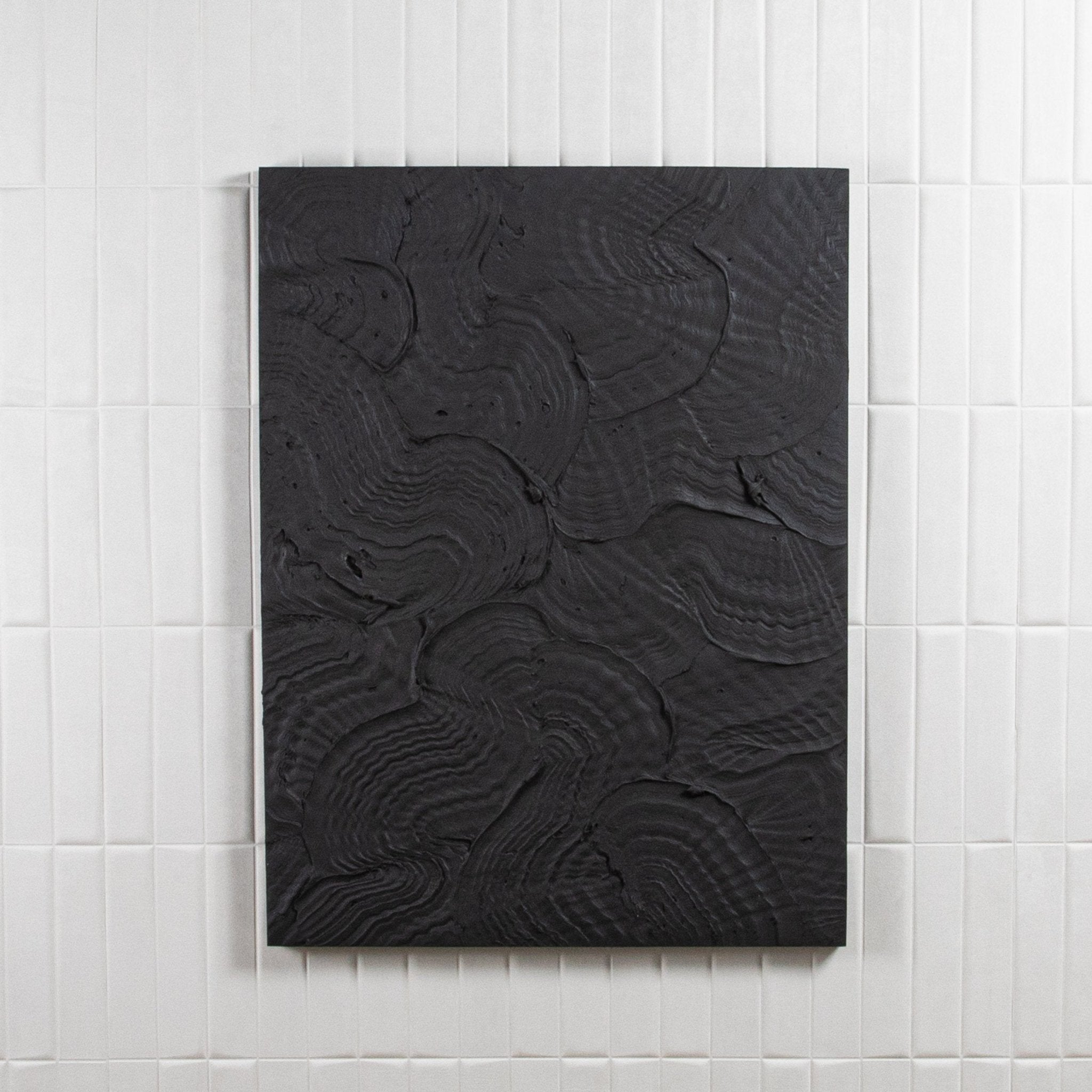 A captivating exploration of depth and dimension, this abstract textural painting by Michael Allen is a striking statement of modern artistry. Executed on a wood panel, the composition features bold, sculptural layers that interplay with light and shadow, creating a dynamic visual rhythm. The monochromatic palette intensifies the tactile quality of the piece, drawing the viewer into its intricately layered surface.