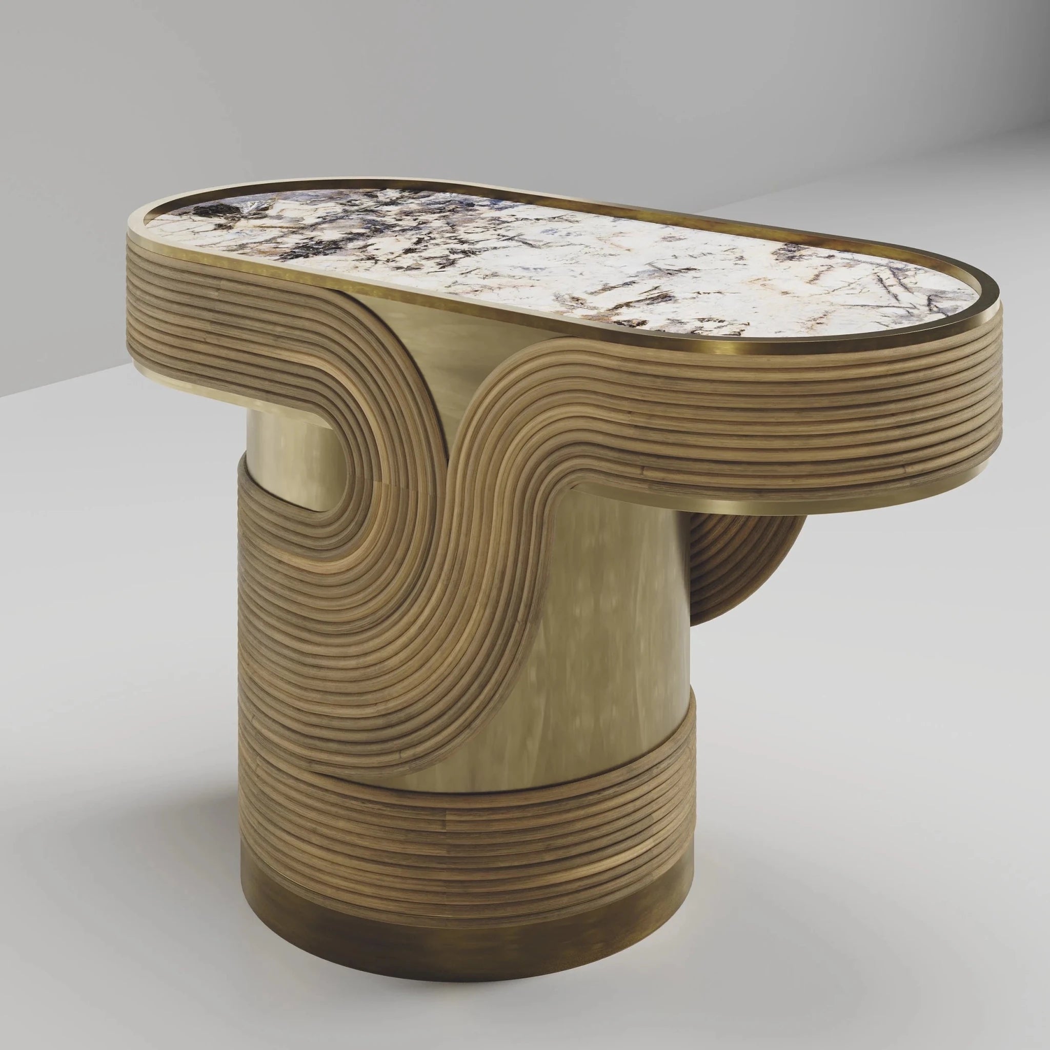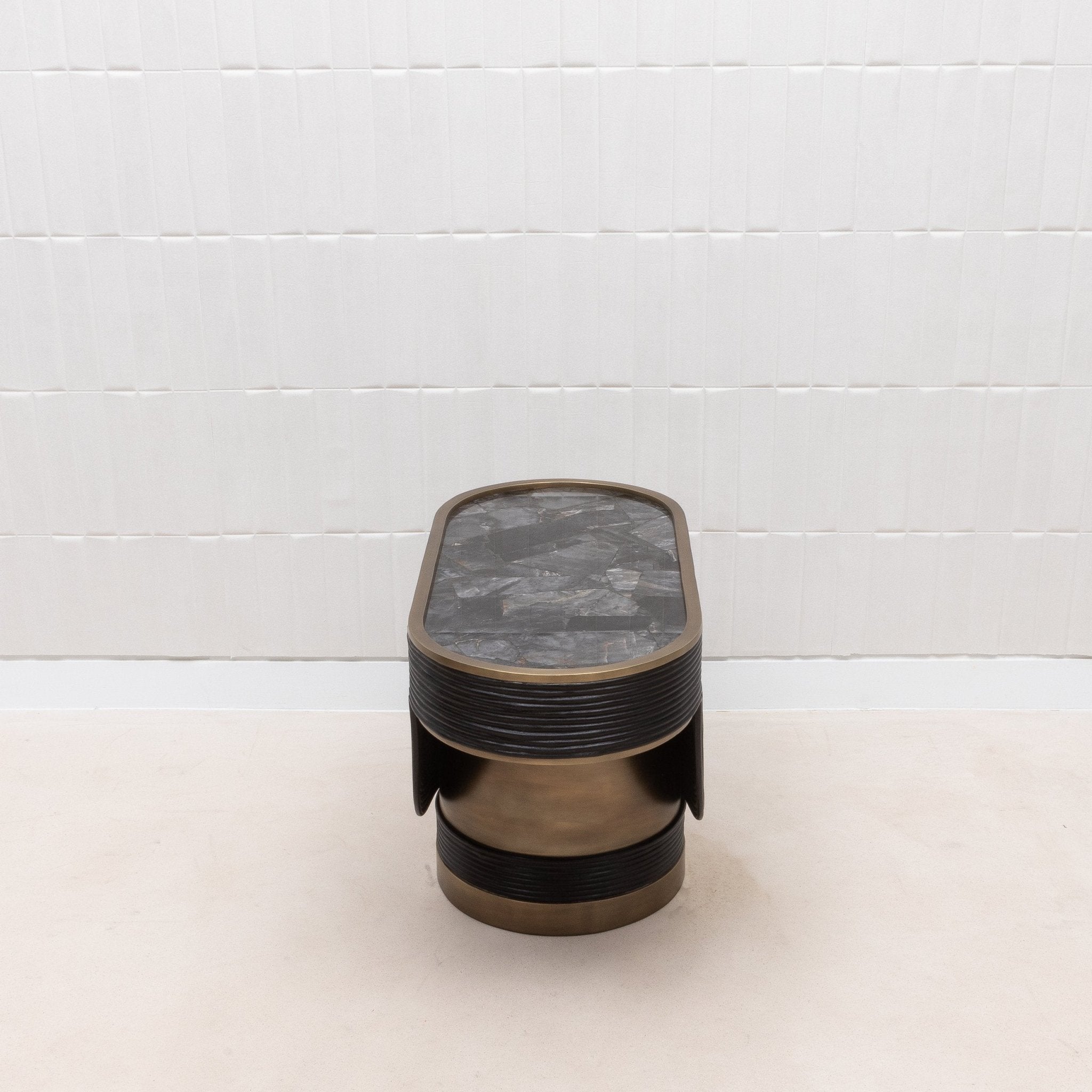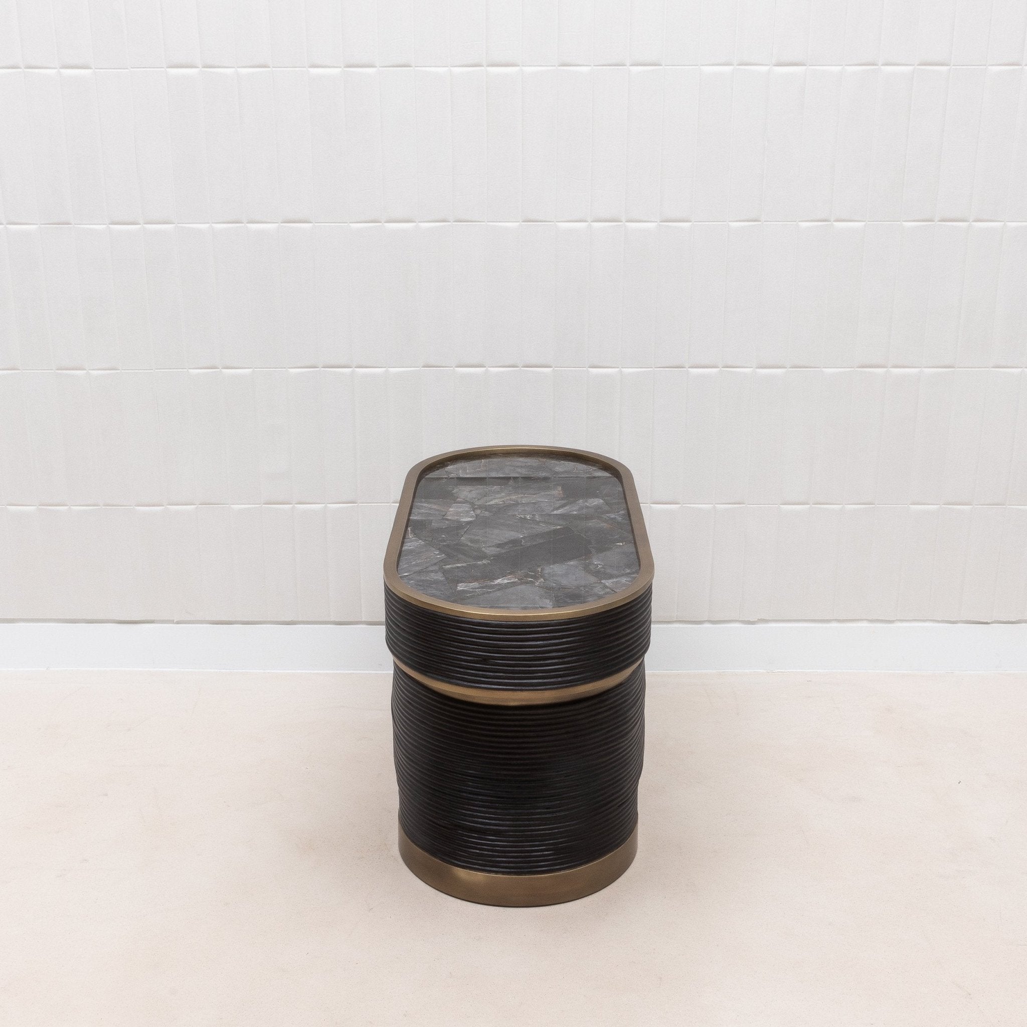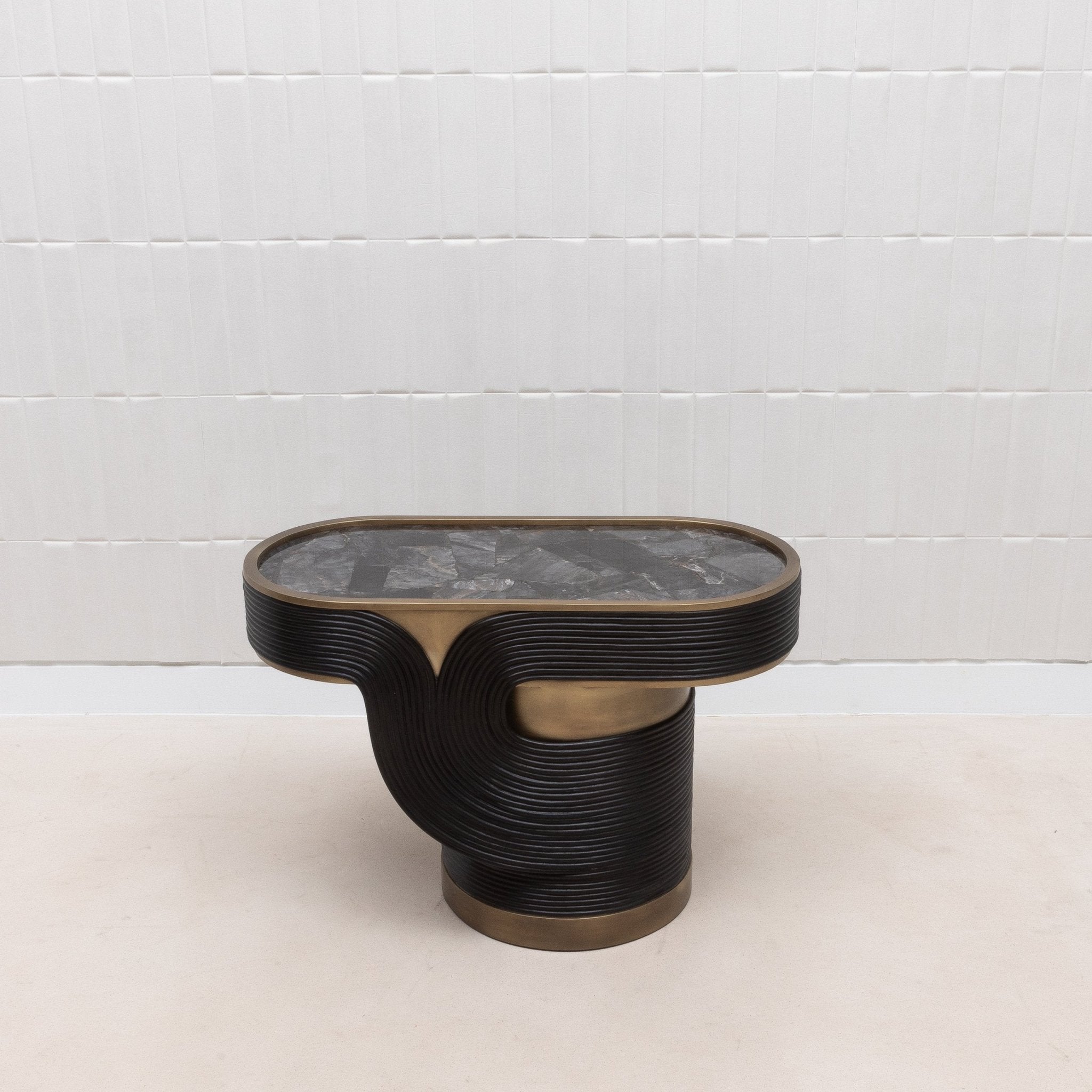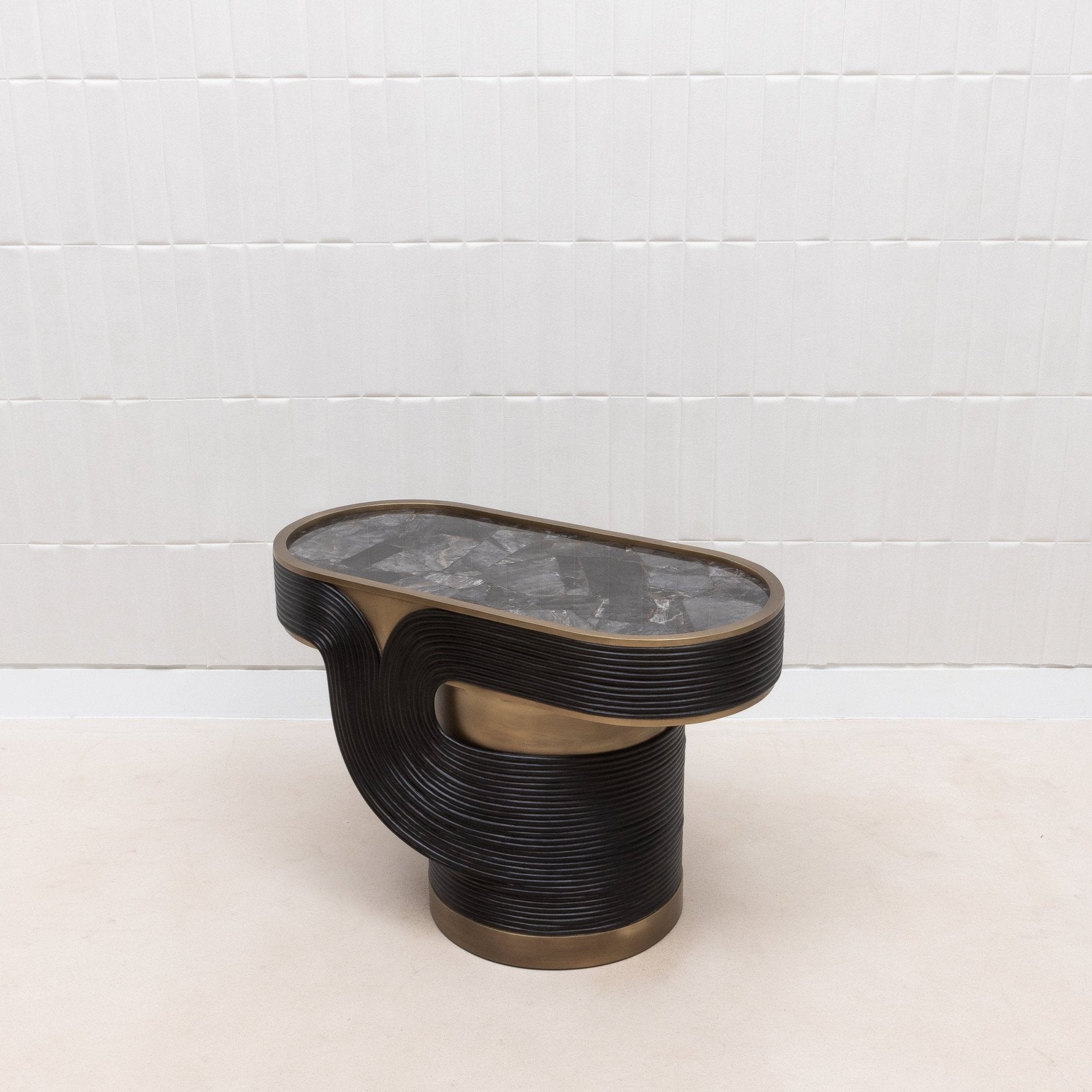 The Licol Side Table is a testament to the artistic finesse of R&Y Augousti, combining the raw beauty of black quartz with the organic elegance of rattan, all encased in a sophisticated bronze patina brass frame. The intricate rattan weaving encircles the table's base, providing a rich, textured contrast to the smooth, reflective surface of the black quartz top. Handcrafted to perfection, this piece is not merely a side table but a sculptural element that adds a touch of refined luxury to any space, embodying the brand’s signature blend of natural materials and artisanal craftsmanship.