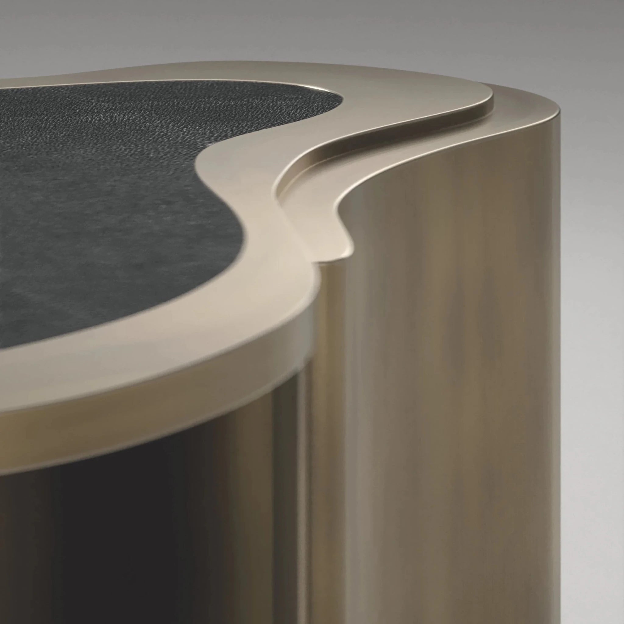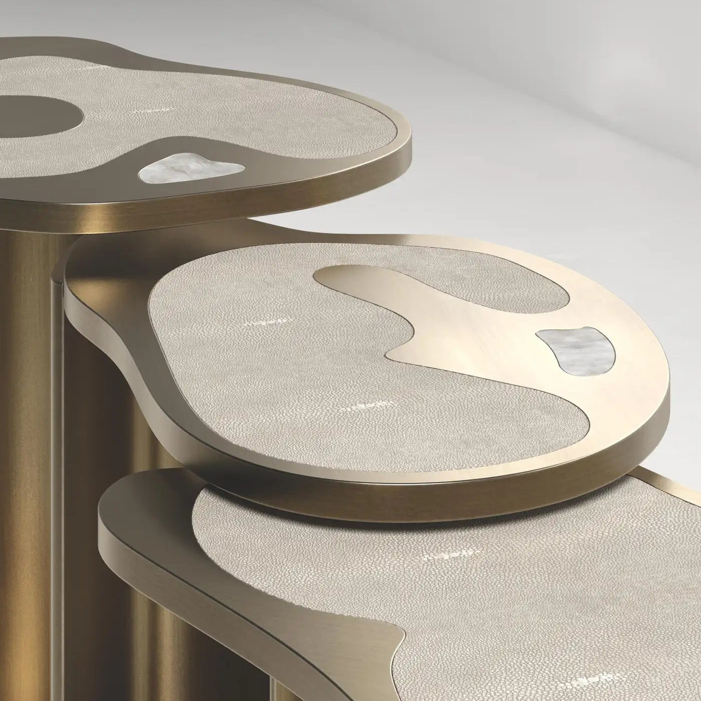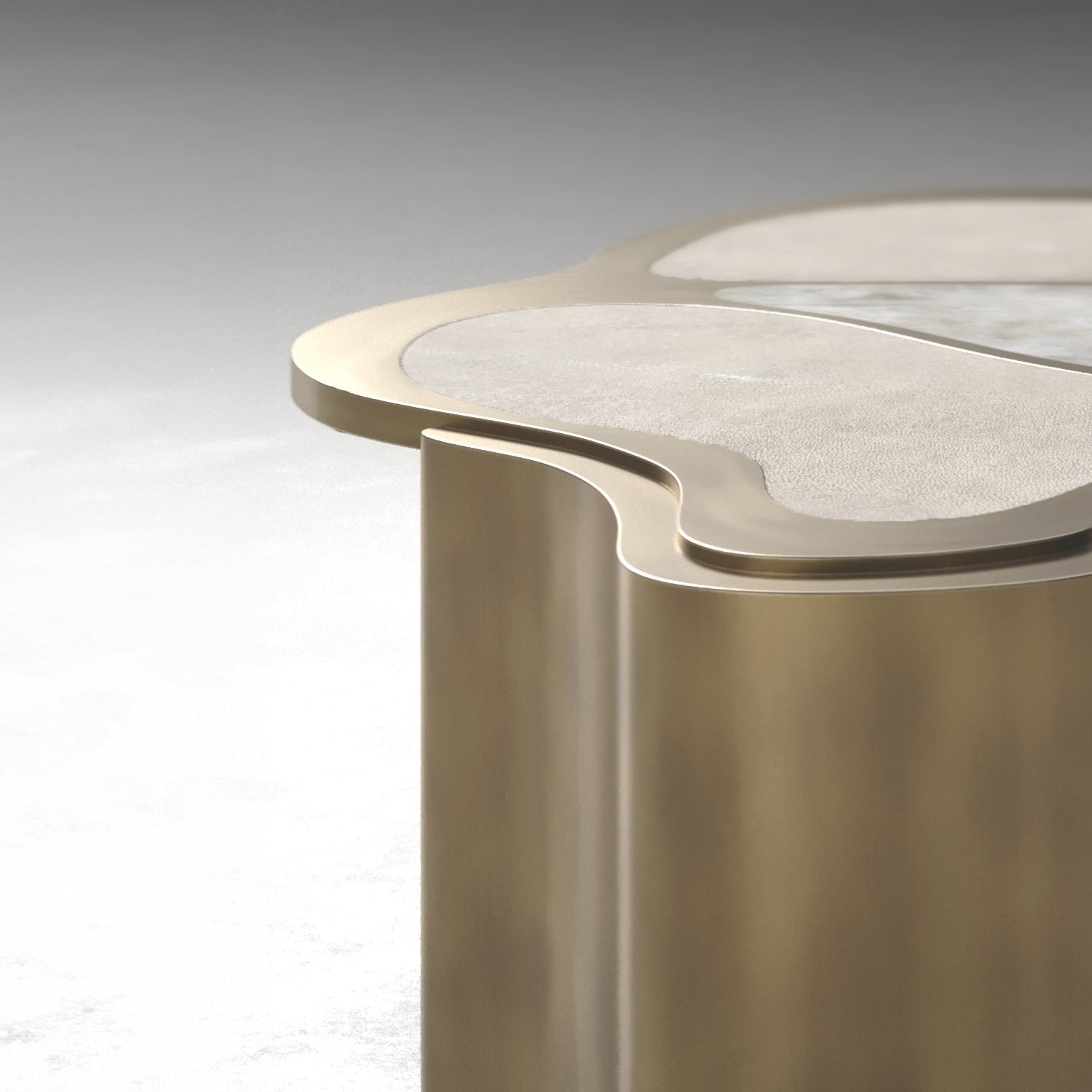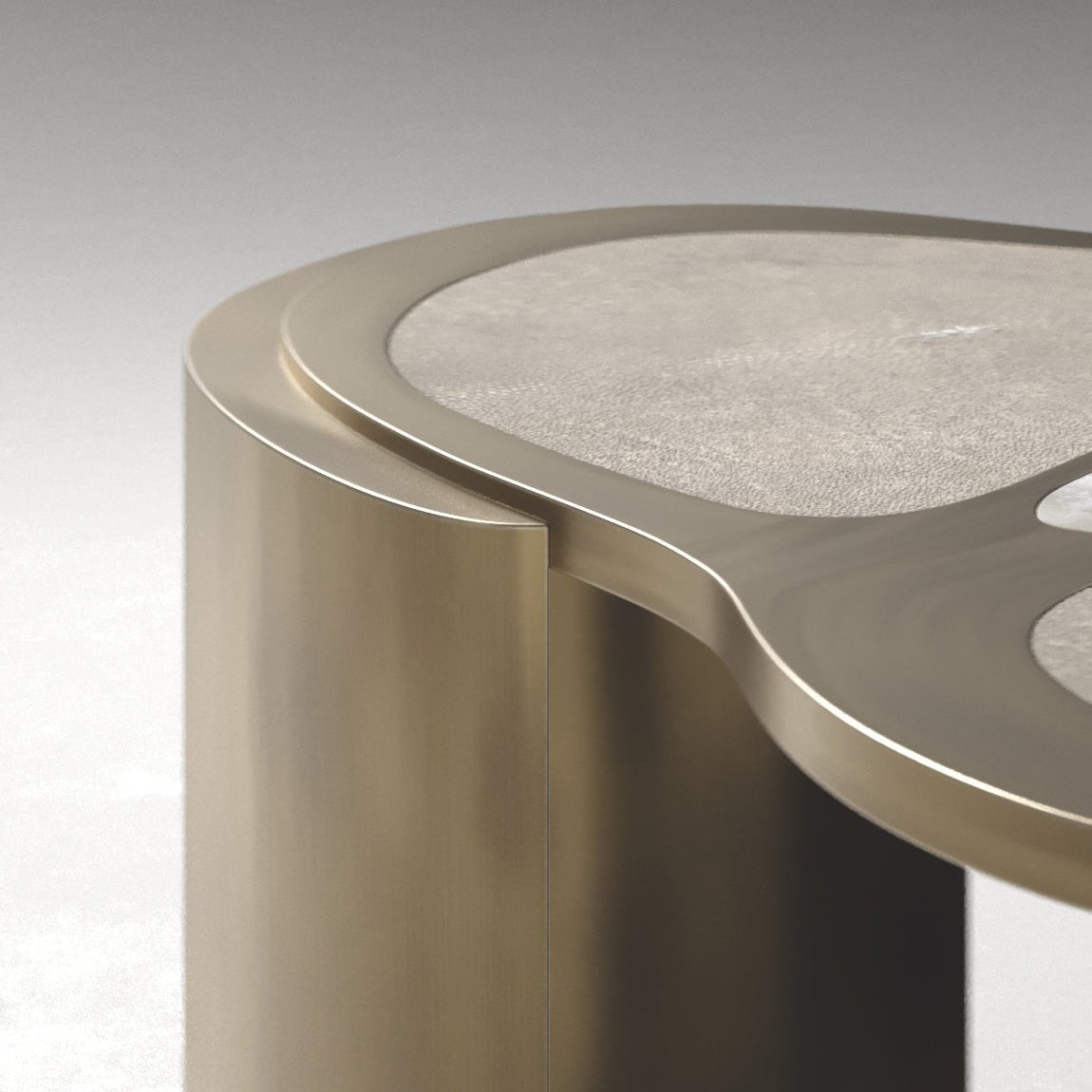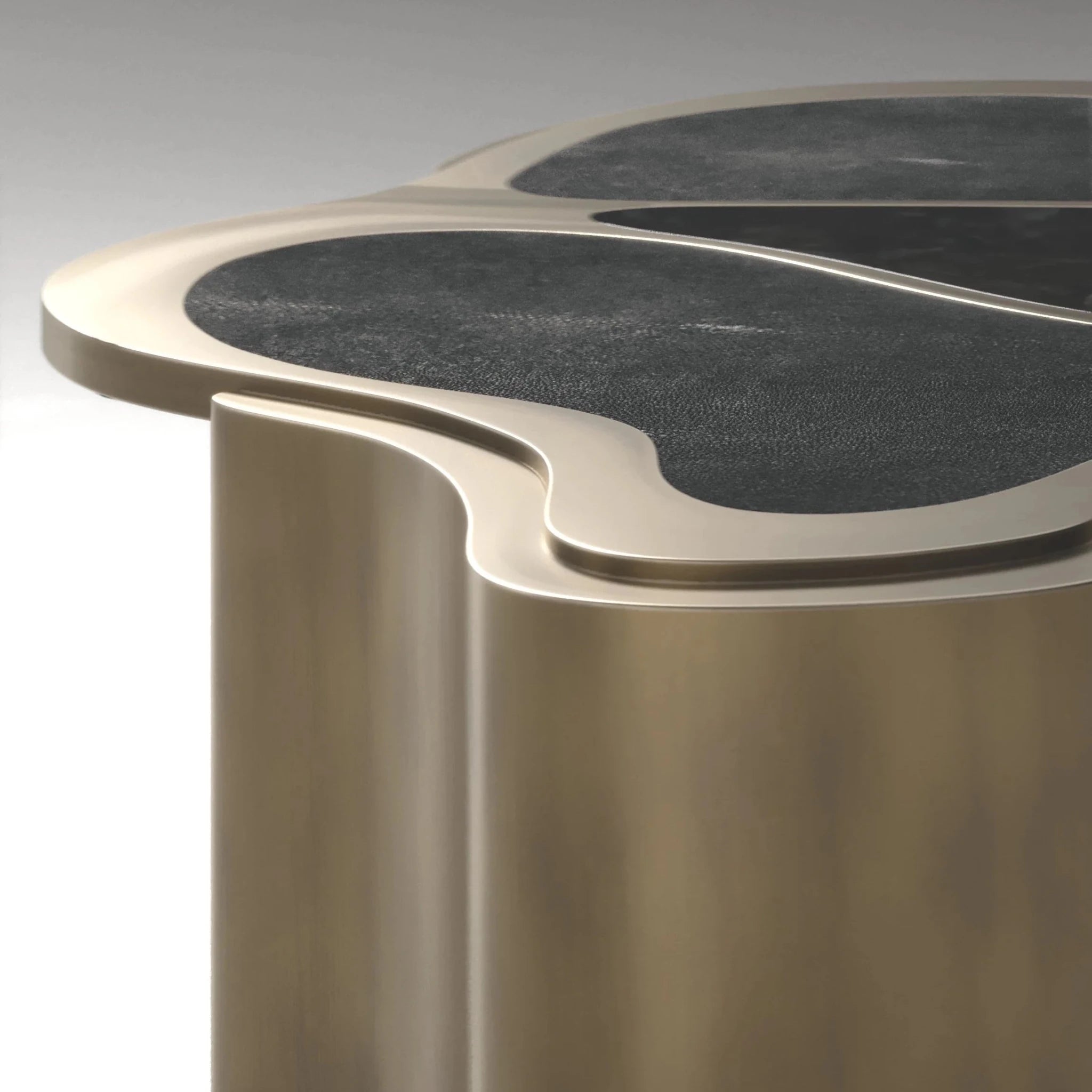The combination of rich textures and soft curves gives the piece a fluid, almost meditative presence. The quartz shimmers gently against the matte shagreen, framed by warm brass in tones that feel aged and artisanal.