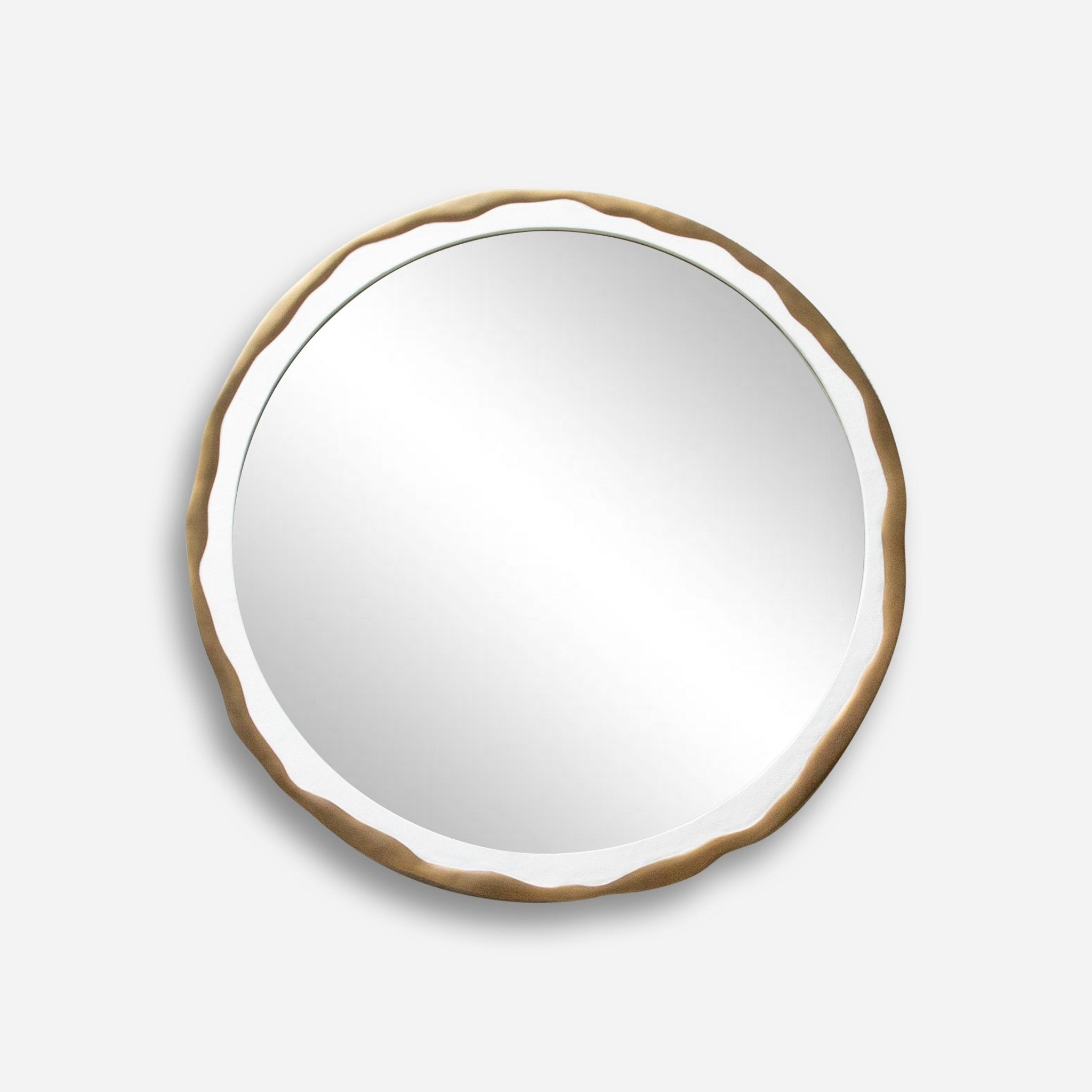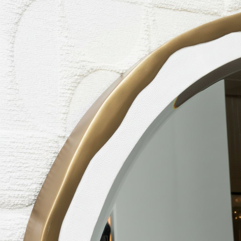The "Melting Mirror" by R&Y Augousti is a testament to innovative luxury and design, embodying the brand's Art Deco-inspired ethos with a contemporary twist. This round mirror is framed with meticulously hand-crafted white shagreen, which offers a textured elegance that is both subtle and sophisticated. A border of bronze patina brass sweeps around the mirror in an organic, melting form, infusing the piece with a dynamic fluidity that contrasts beautifully with the structured texture of the shagreen. This harmonious blend of materials and shapes results in a statement piece that reflects both refined craftsmanship and artistic daring, ideal for enhancing modern luxury interiors with its unique, sculptural silhouette.