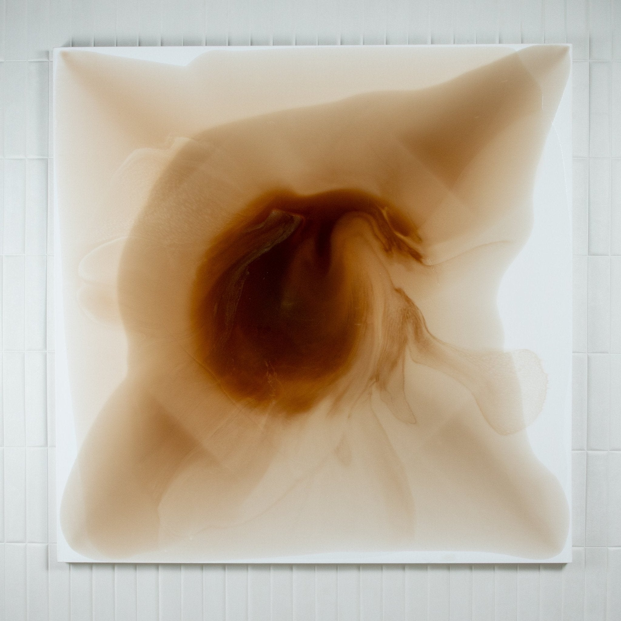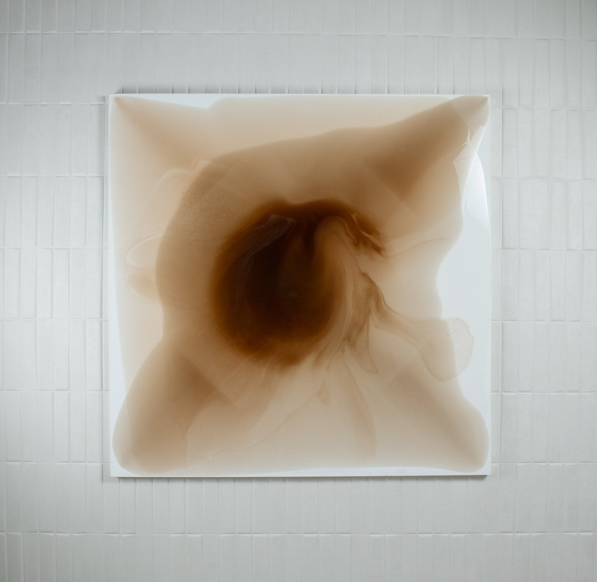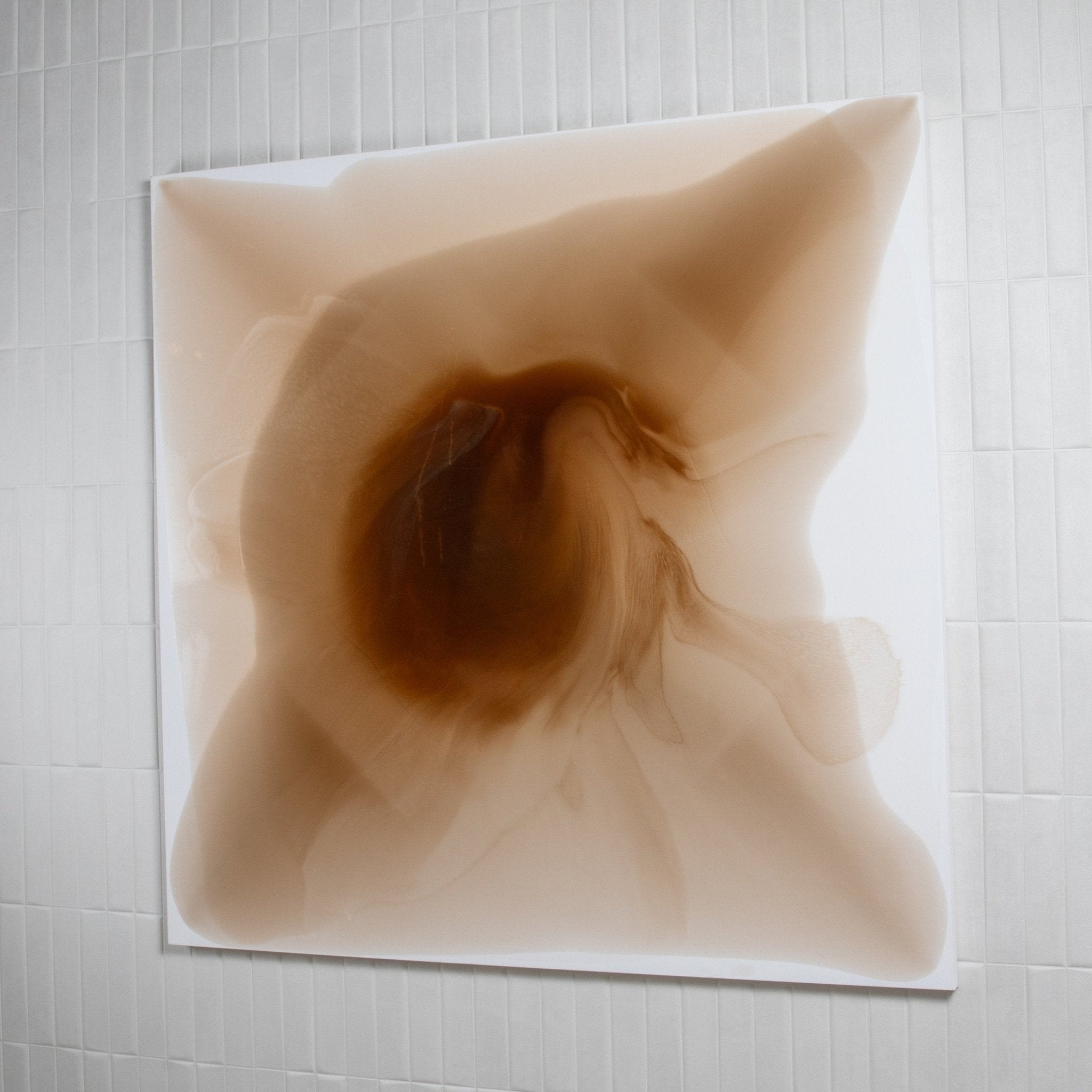 From the series e·the·re·al, this artwork flows in deep amber and clay hues, gently curling into a vortex of soft translucency. Created with ink and resin on canvas, the composition feels alive—its movement reminiscent of smoke caught in still air, or a quiet current beneath a glassy surface. The warm palette evokes a sense of inner warmth and grounding, while the darker center draws the eye inward, inviting contemplation. Light dances through layered tones, revealing intricate textures that shift depending on your perspective. The piece radiates emotional depth—simultaneously serene and stirring, like a quiet memory surfacing. Every curve and gradient is intentional, a slow unfolding of form and feeling. Framed with concealed wood and completely unique, it becomes more than a visual element—it’s a meditative focal point for refined spaces. Perfect for interiors craving calm and soul, it stands as a quiet testament to beauty found in fluid transformation.
