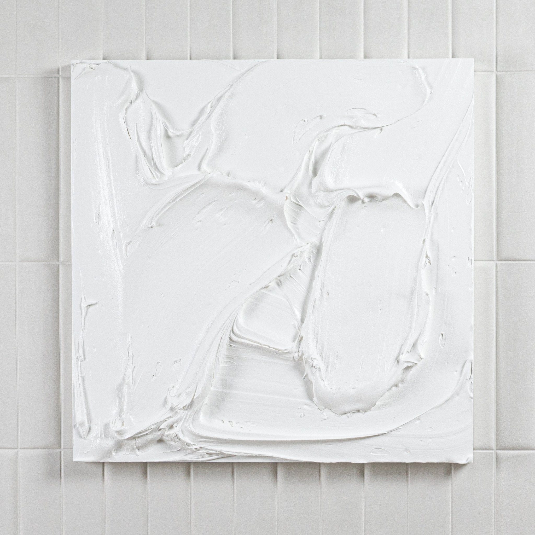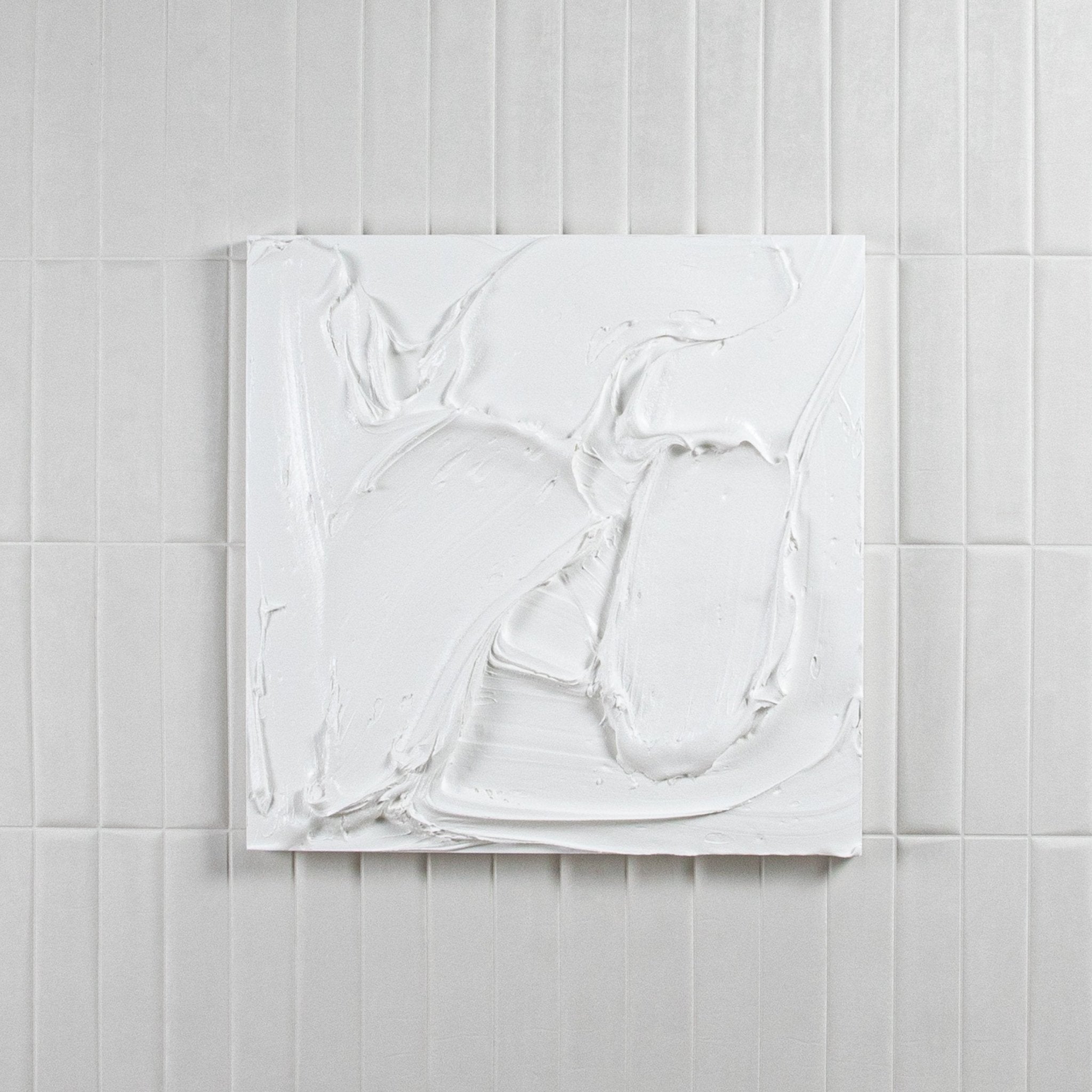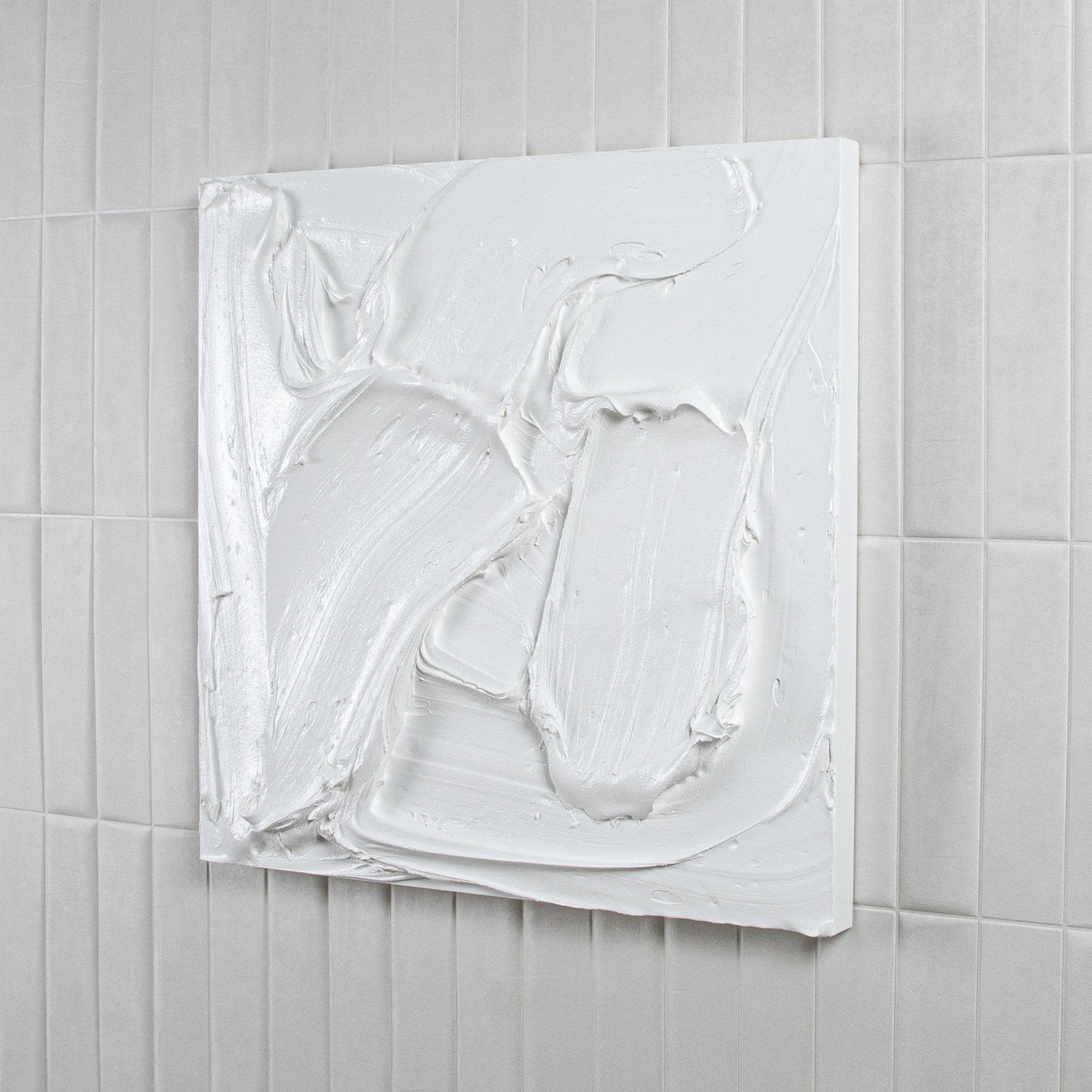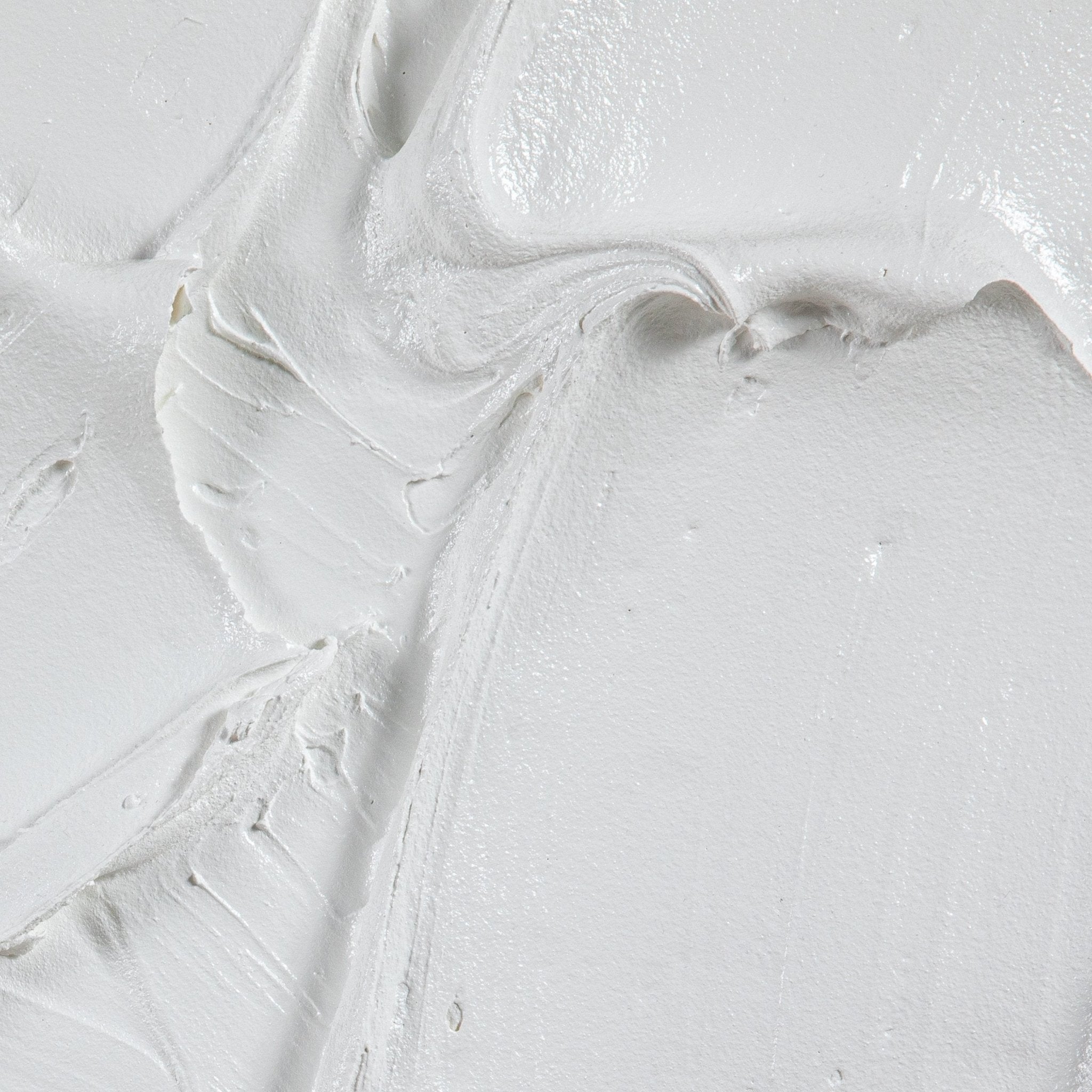 A captivating exploration of depth and dimension, this abstract textural painting by Michael Allen is a striking statement of modern artistry. Executed on a wood panel, the composition features bold, sculptural layers that interplay with light and shadow, creating a dynamic visual rhythm. The monochromatic palette intensifies the tactile quality of the piece, drawing the viewer into its intricately layered surface.
