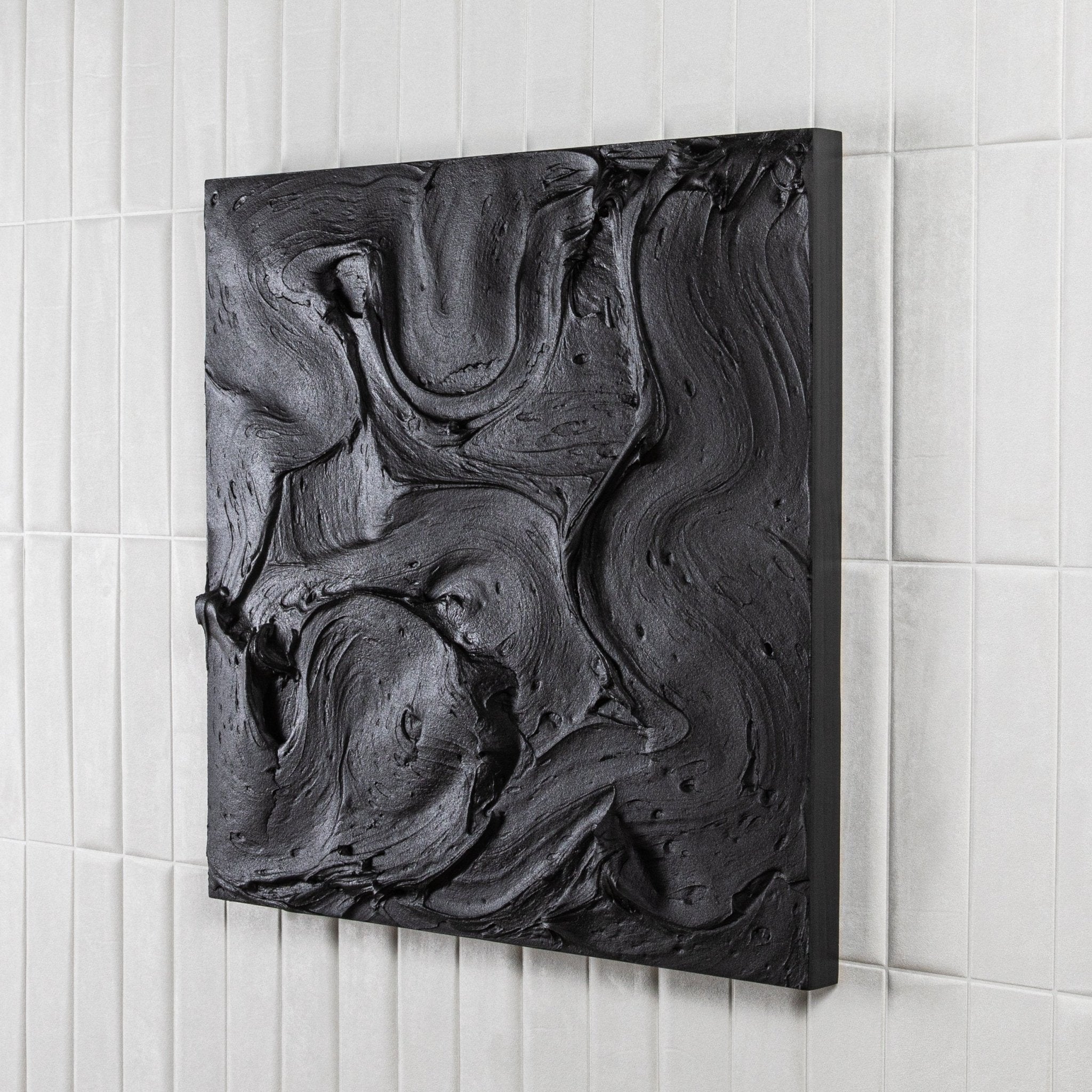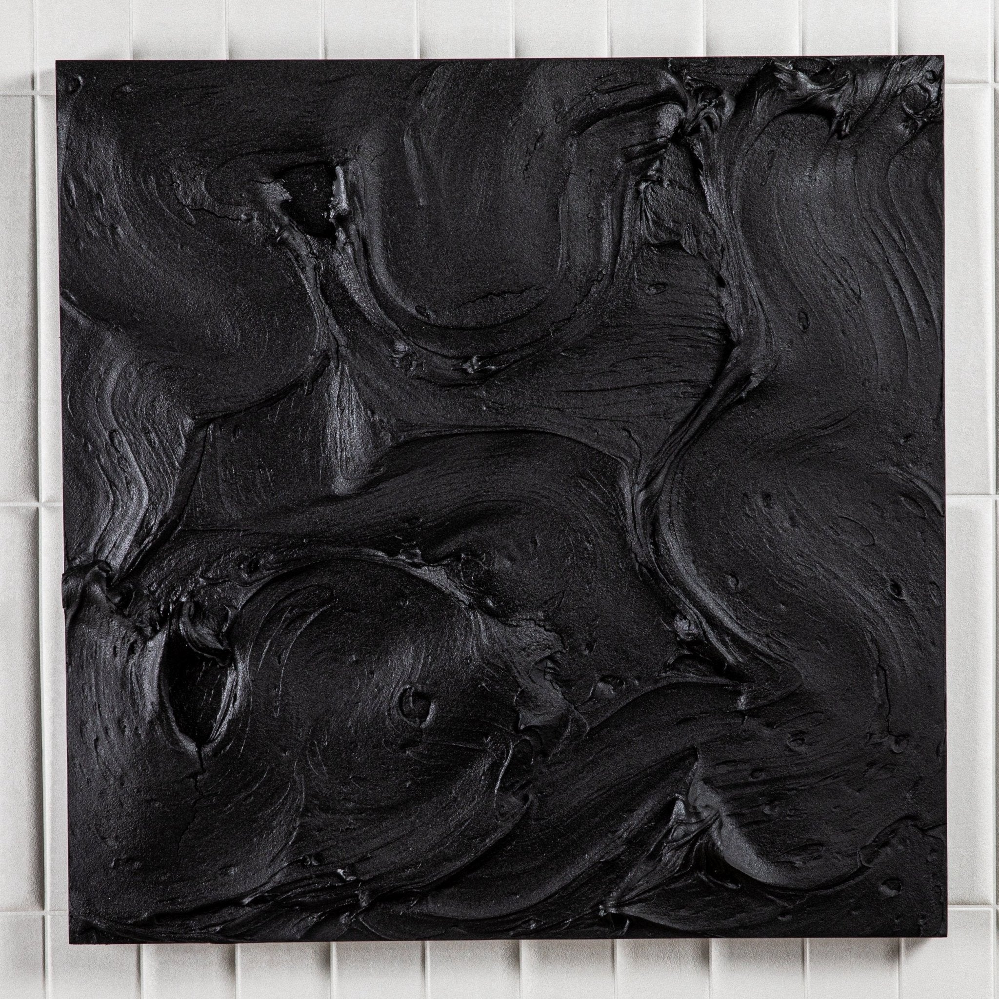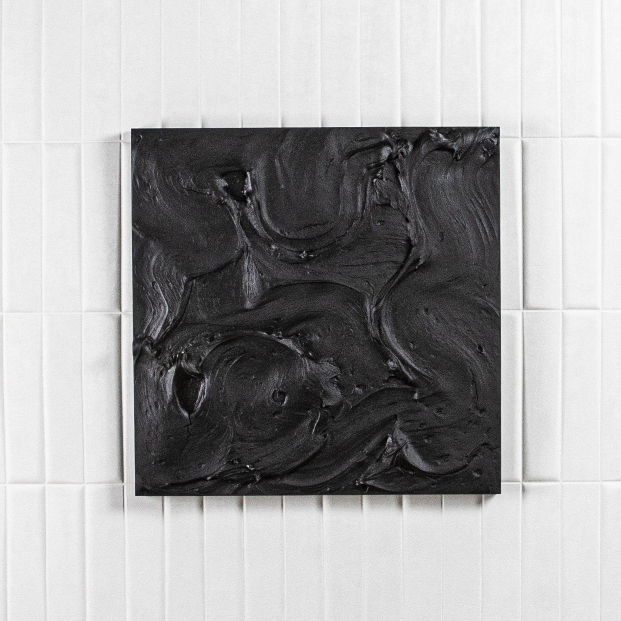 A captivating exploration of depth and dimension, this abstract textural painting by Michael Allen is a striking statement of modern artistry. Executed on a wood panel, the composition features bold, sculptural layers that interplay with light and shadow, creating a dynamic visual rhythm. The monochromatic palette intensifies the tactile quality of the piece, drawing the viewer into its intricately layered surface.