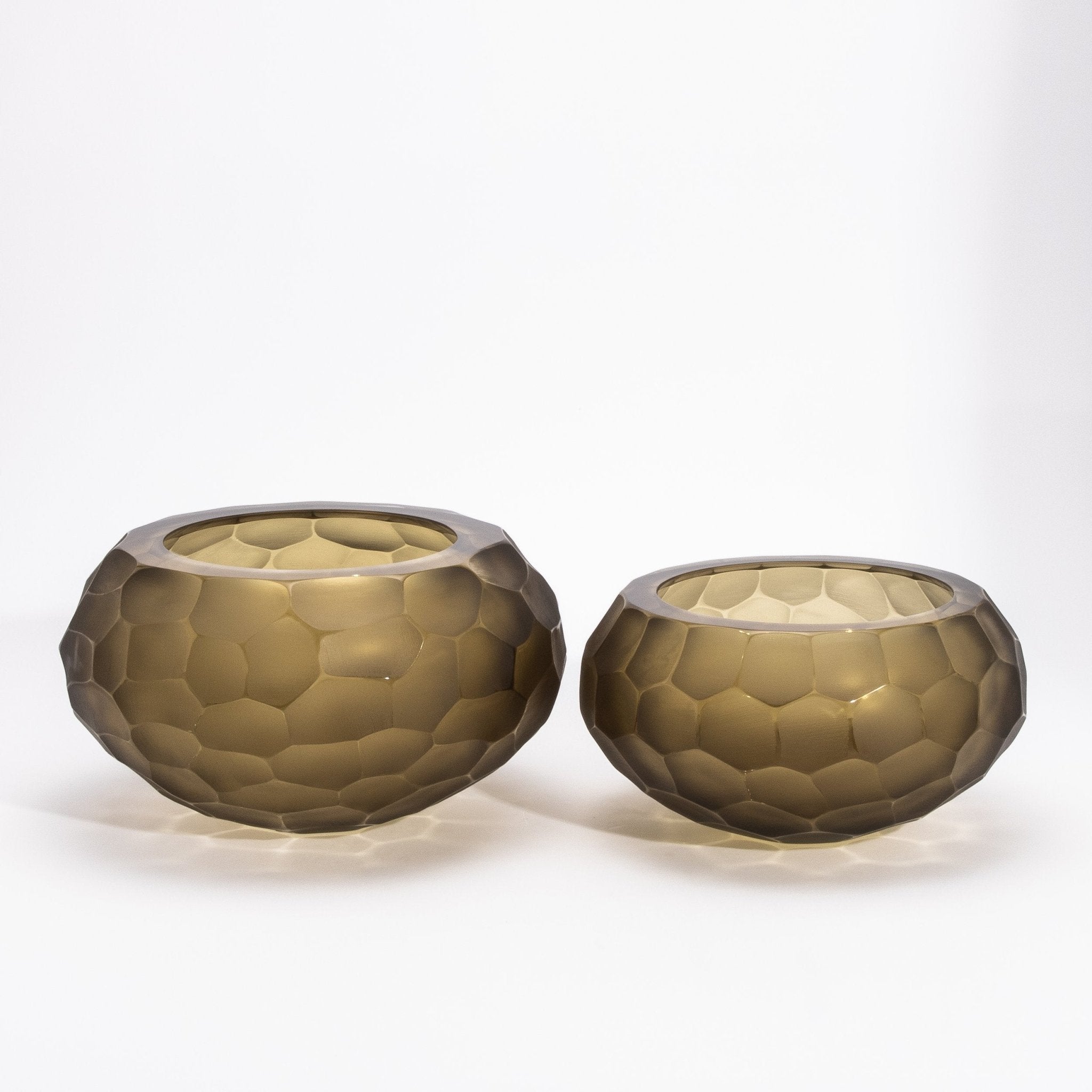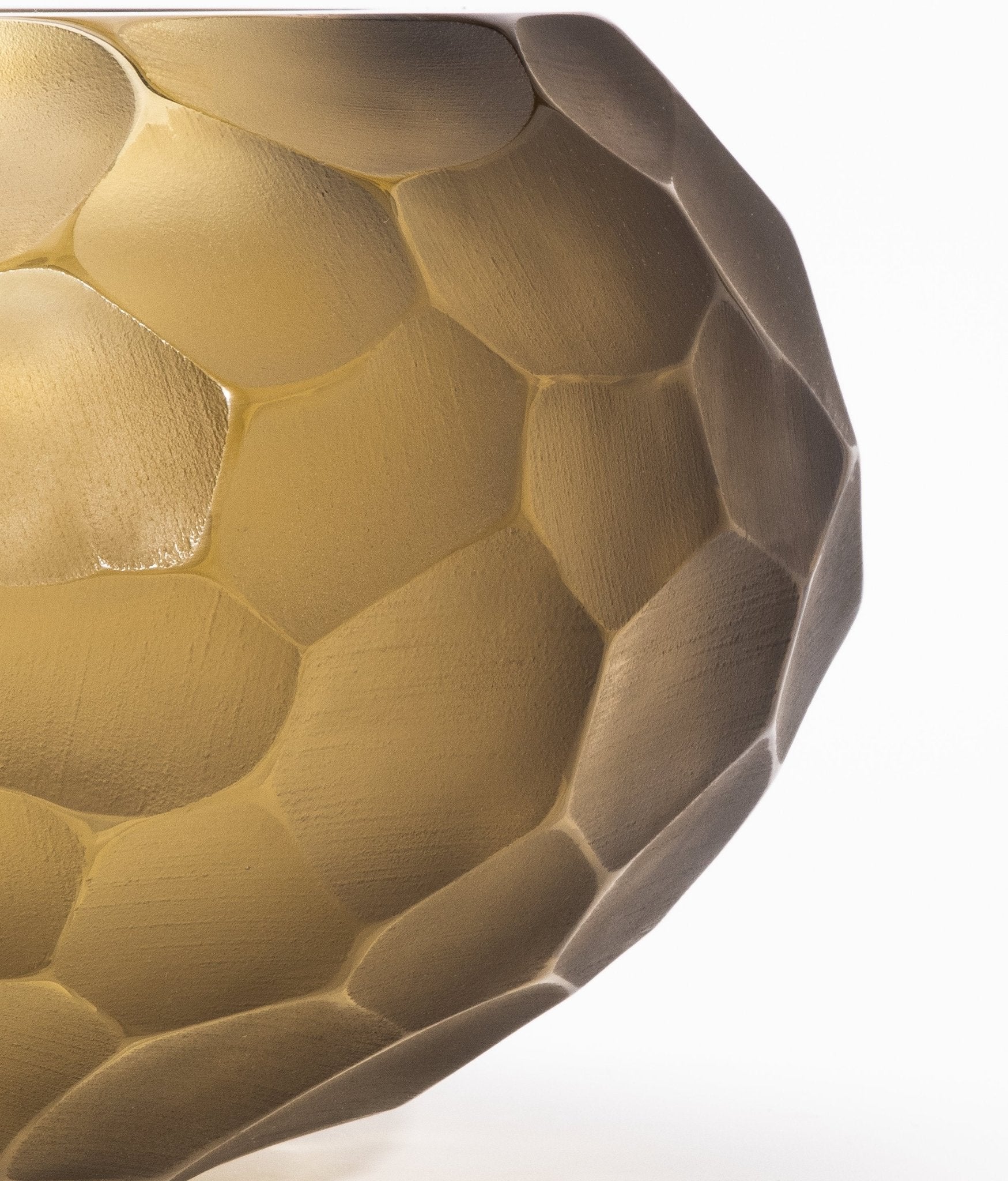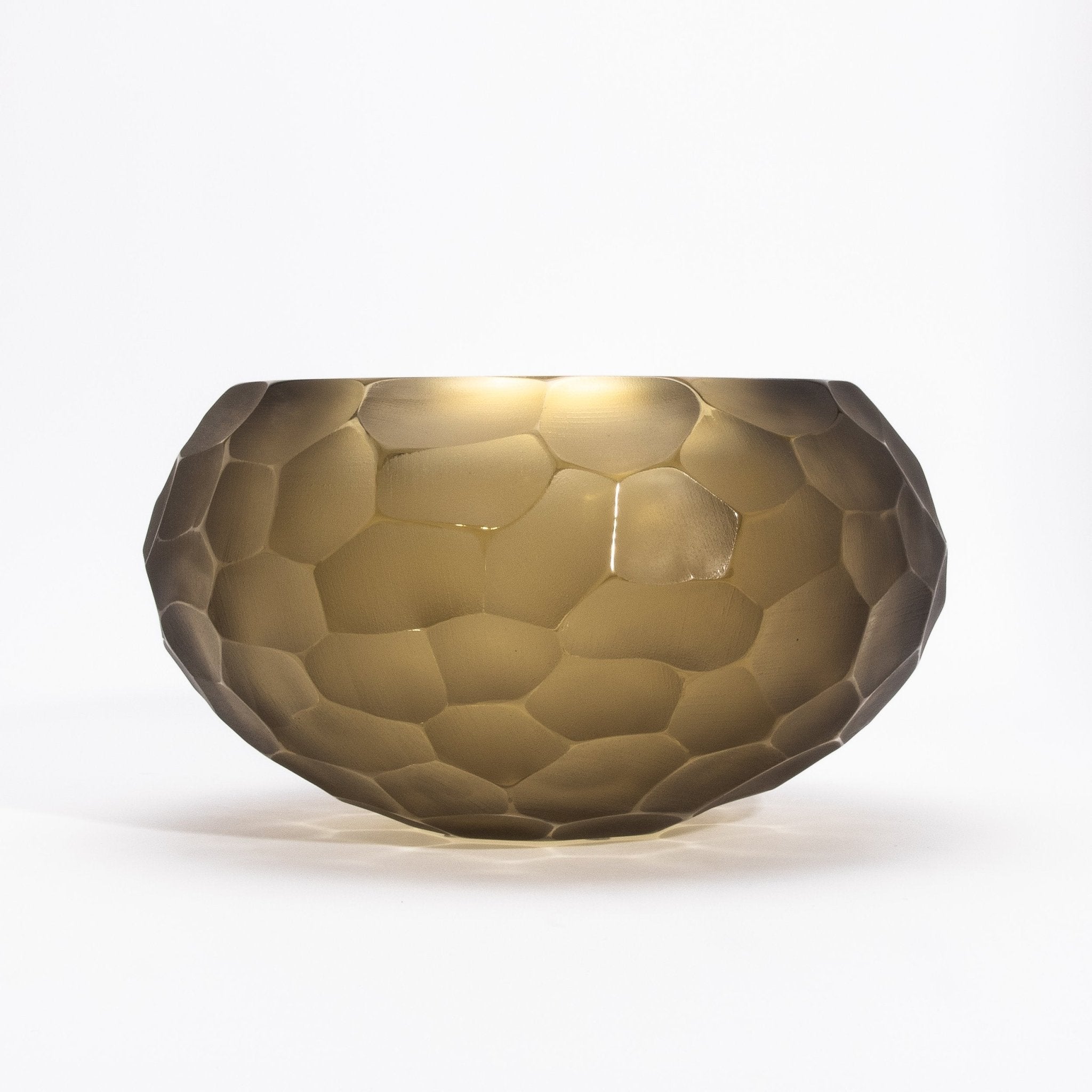 A testament to Venetian mastery, this hand-blown Murano bowl in olive green is an exquisite fusion of artistry and luxury. The Battuto technique creates a sculptural, hammered texture, where the matte-faceted surface meets a polished, luminous rim, offering a dynamic contrast of textures. The rich olive-green hue evokes an organic, earthy elegance, while the interplay of light across its uniquely hewn form accentuates its depth and sophistication. Meticulously crafted by the finest Venetian glass masters, each bowl is a singular expression of contemporary refinement, embodying the timeless allure of Murano glass. Its rounded silhouette and geometric pattern resemble hand-carved stone, lending an artistic edge to any space. Whether displayed as a standalone sculptural piece or integrated into a refined décor arrangement, it exudes an aura of exclusive elegance. Available in medium and large sizes, this exceptional Murano creation also comes as a tall vase, offering versatility in collectible luxury. Signed for MOGUL.