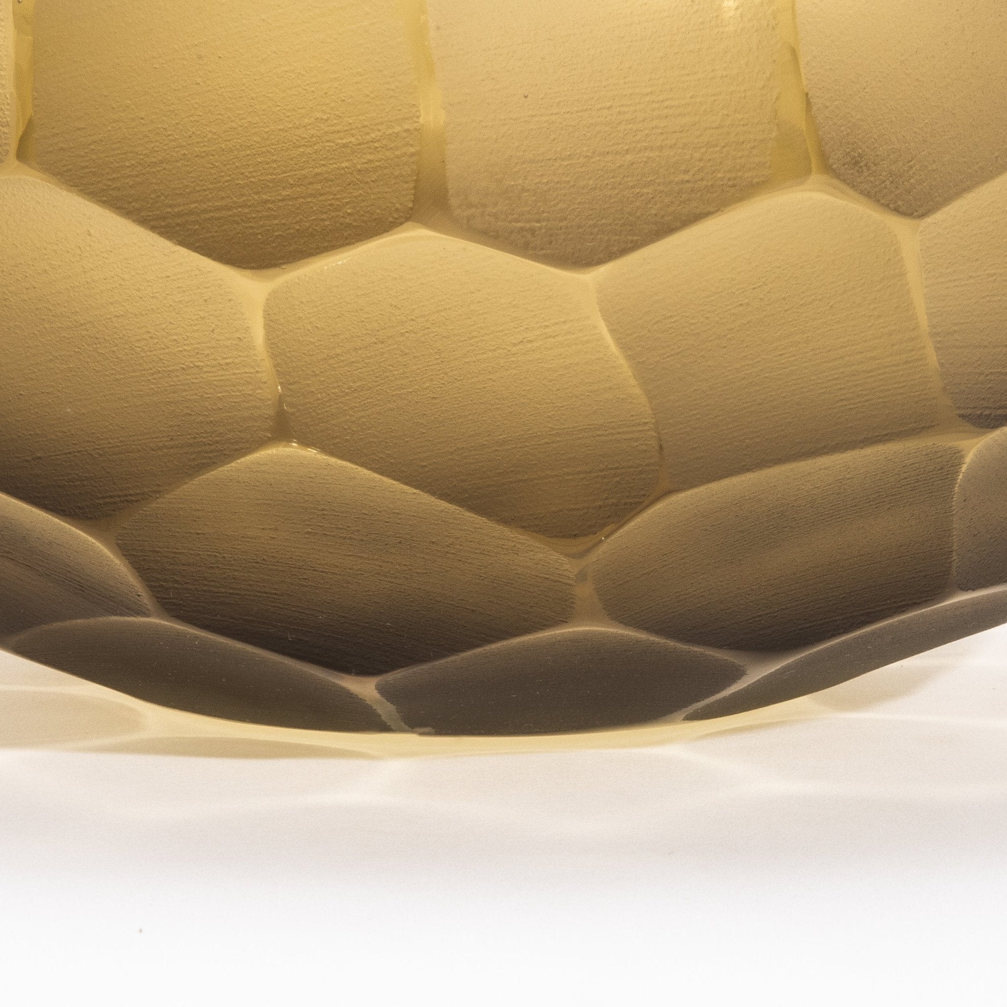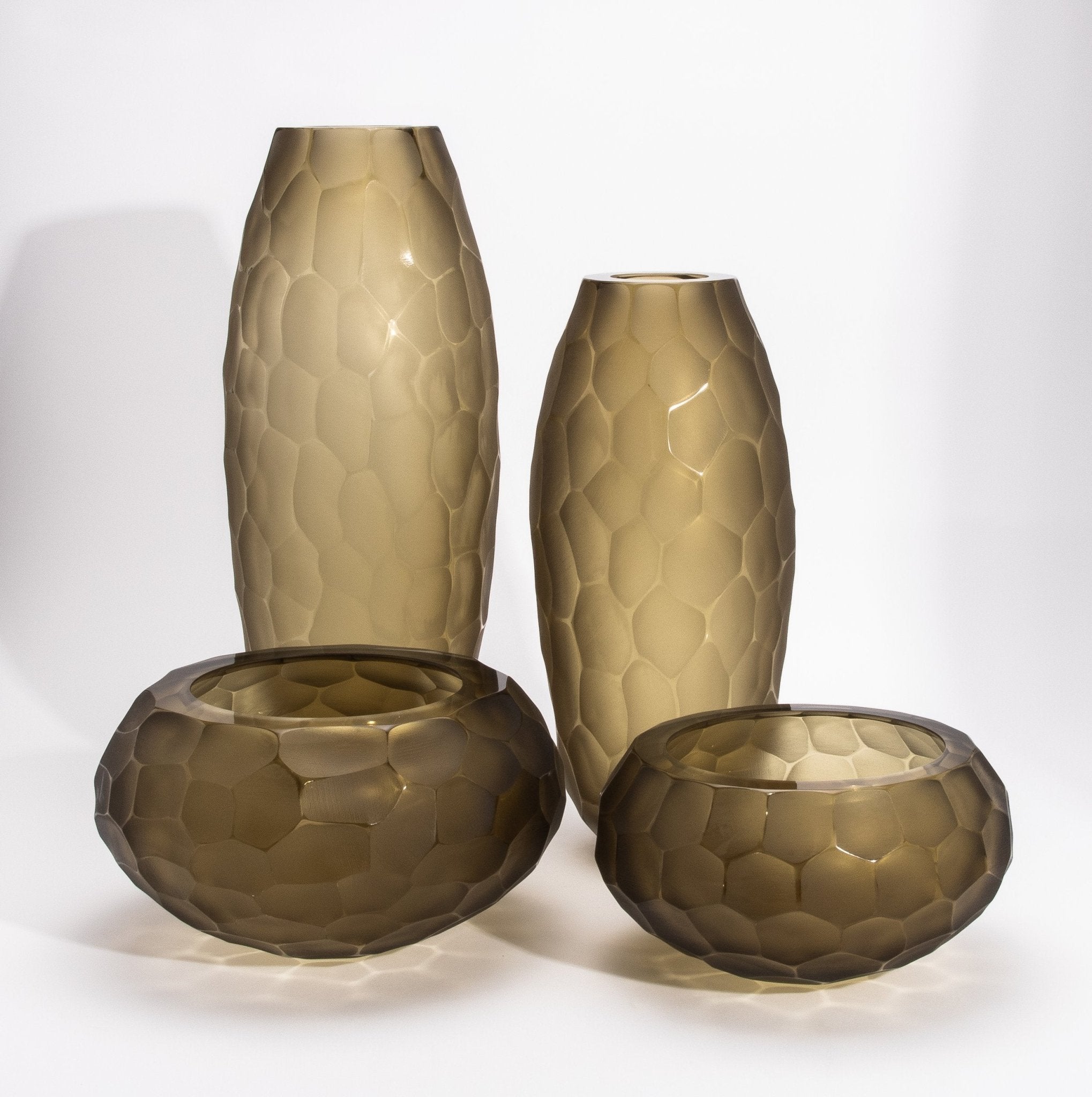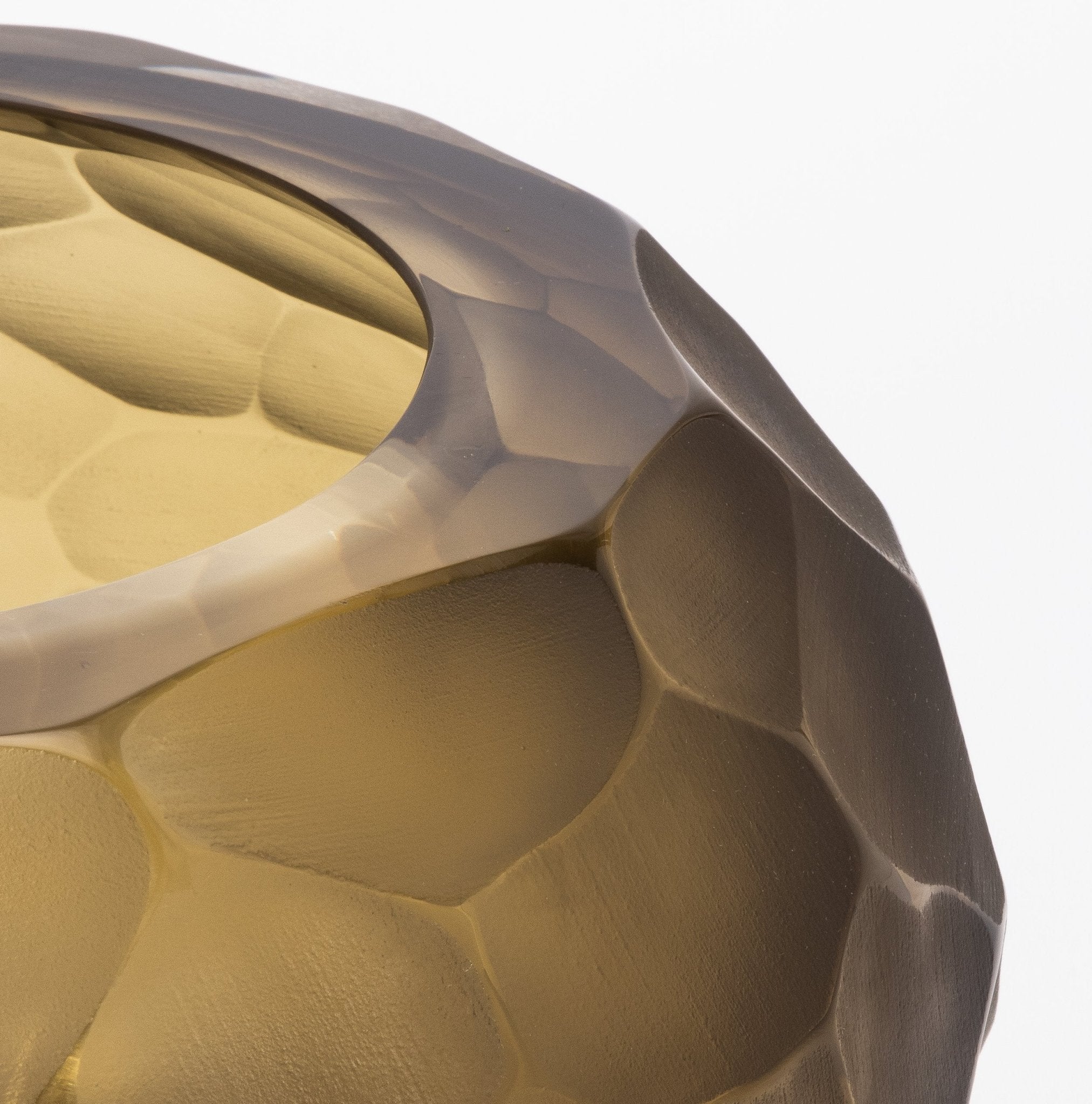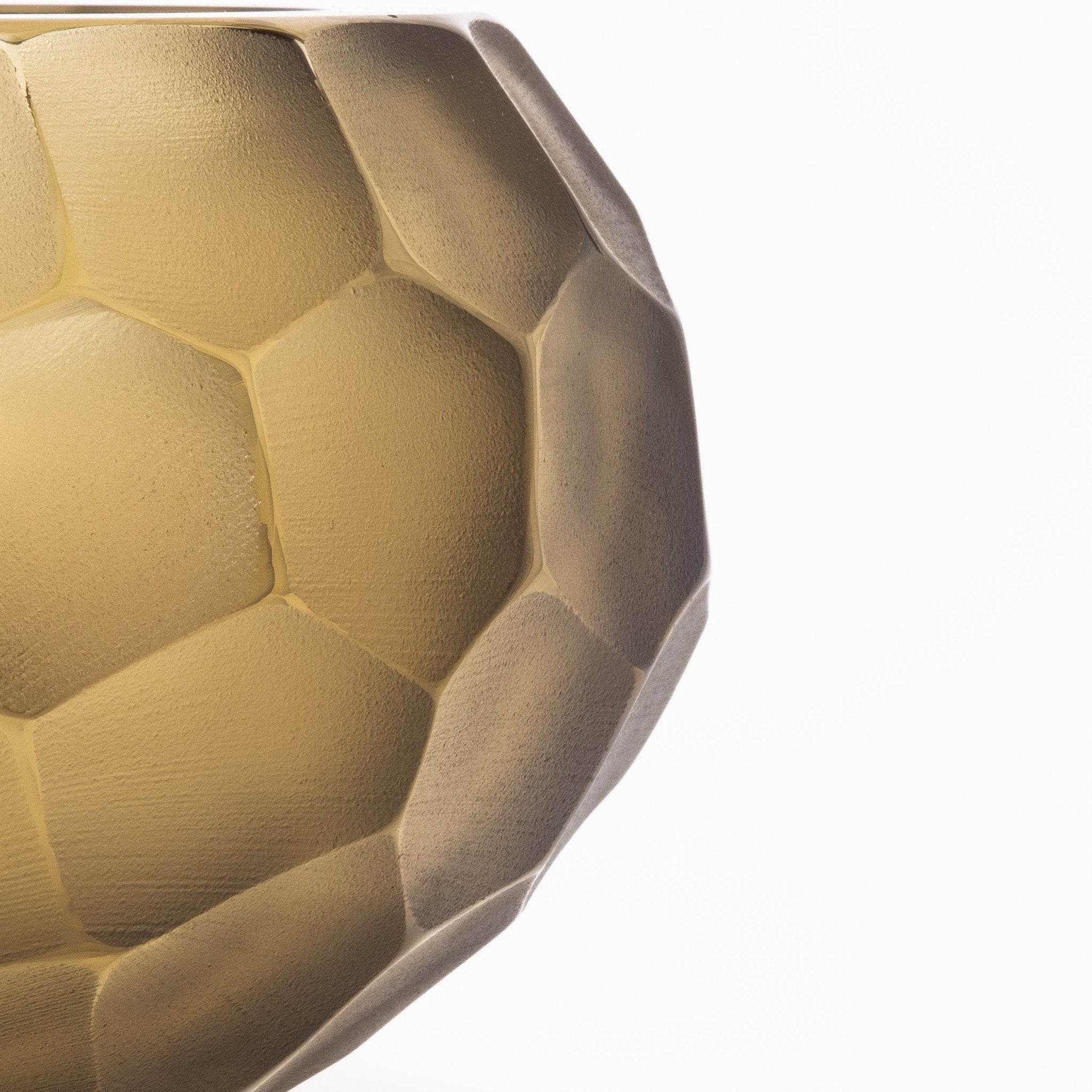 A testament to Venetian mastery, this hand-blown Murano bowl in olive green is an exquisite fusion of artistry and luxury. The Battuto technique creates a sculptural, hammered texture, where the matte-faceted surface meets a polished, luminous rim, offering a dynamic contrast of textures. The rich olive-green hue evokes an organic, earthy elegance, while the interplay of light across its uniquely hewn form accentuates its depth and sophistication. Meticulously crafted by the finest Venetian glass masters, each bowl is a singular expression of contemporary refinement, embodying the timeless allure of Murano glass. Its rounded silhouette and geometric pattern resemble hand-carved stone, lending an artistic edge to any space. Whether displayed as a standalone sculptural piece or integrated into a refined décor arrangement, it exudes an aura of exclusive elegance. Available in medium and large sizes, this exceptional Murano creation also comes as a tall vase, offering versatility in collectible luxury. Signed for MOGUL.