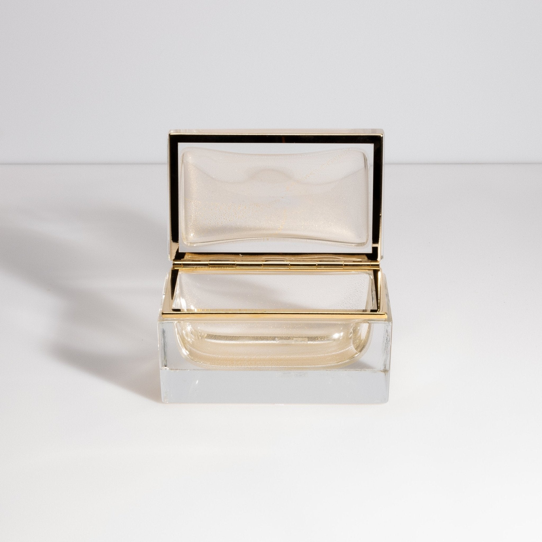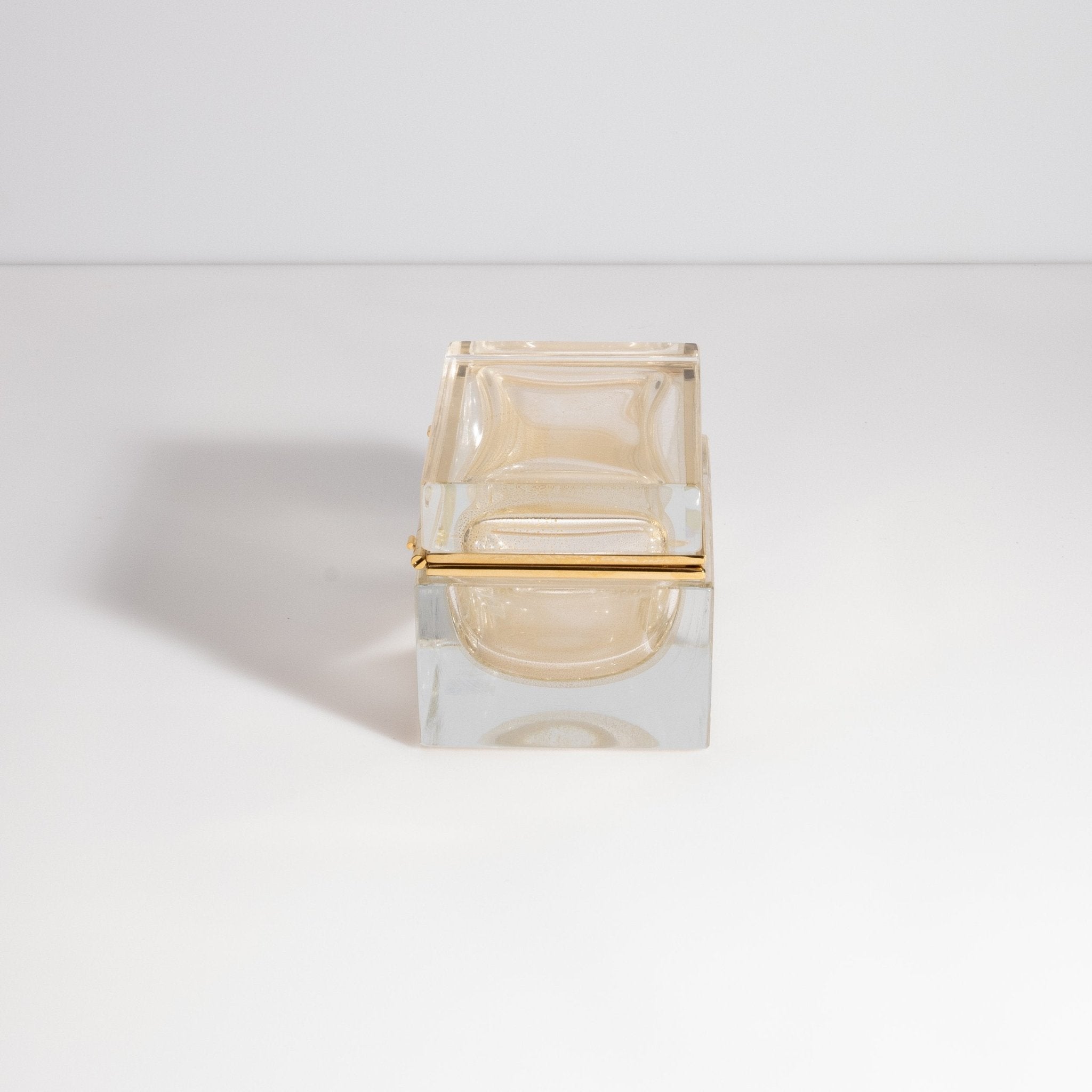 This Murano Glass Jewelry Box in Crystal with 24 Karat Gold Flecks embodies elegance and sophistication with its timeless design and luxurious materials. Handcrafted on the storied island of Murano, this jewelry box is a masterpiece of glass artistry.