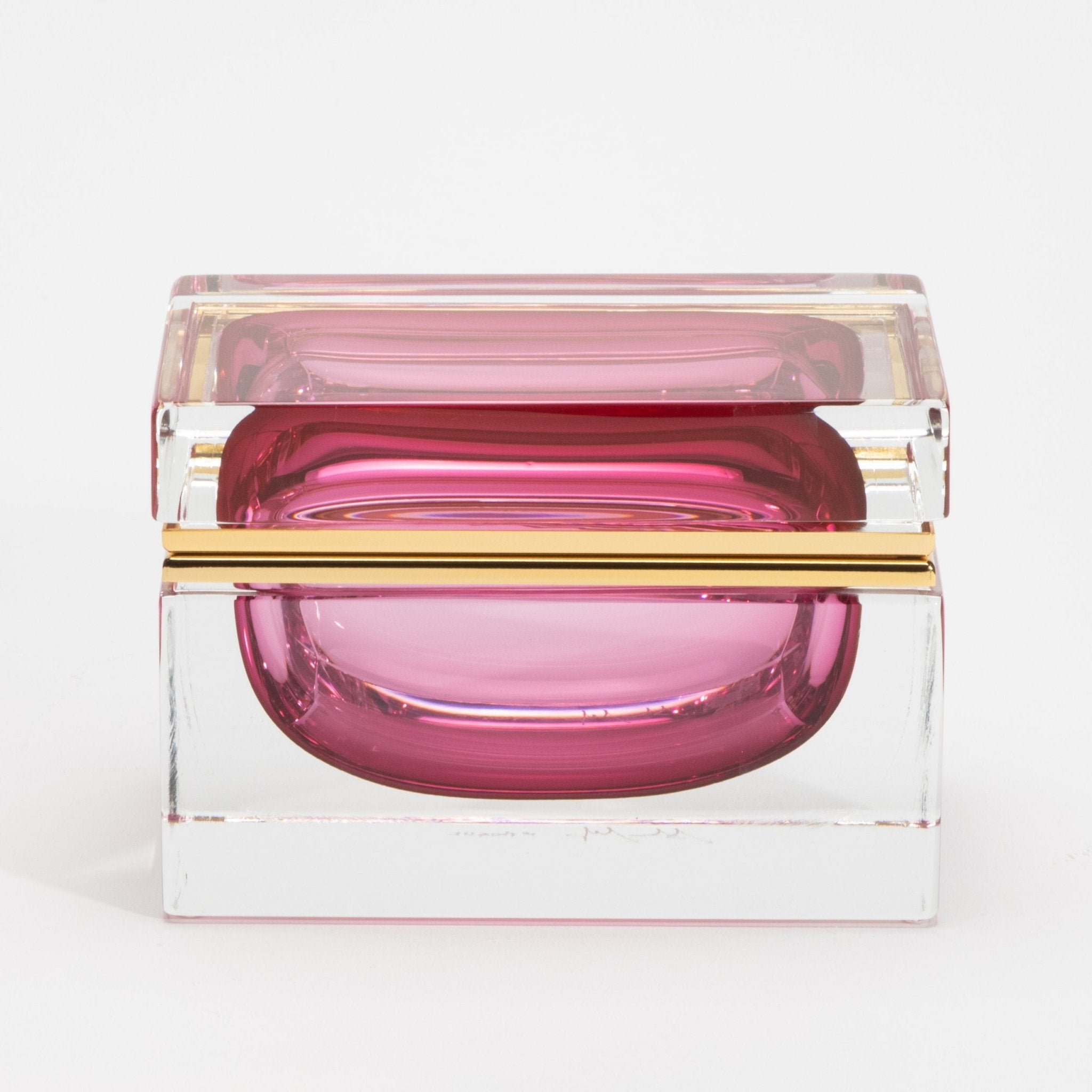 Hand-Blown Murano Box in Ruby with Brass Fittings is a radiant celebration of color, craftsmanship, and Italian elegance. Meticulously hand-blown in Murano, this striking piece showcases a lush ruby-toned glass core, suspended in a clear rectangular form that reveals every nuance of light and depth within. The intense crimson hue glows warmly through the precision-cut facets, offering a luxurious counterpoint to the brilliant clarity of the outer casing.The box is accented with gleaming brass fittings, seamlessly inset to create a refined frame that enhances the sculptural nature of the piece. A soft-close hinge reveals a perfectly contoured interior, echoing the box’s curvature and ensuring it is as functional as it is ornamental. Each detail—from the thickness of the glass to the mirror-like polish of the fittings—demonstrates the unparalleled artistry of Murano’s master glassmakers. Signed by the artist, this is not merely a box but a jewel-like vessel—an heirloom of light, color, and design