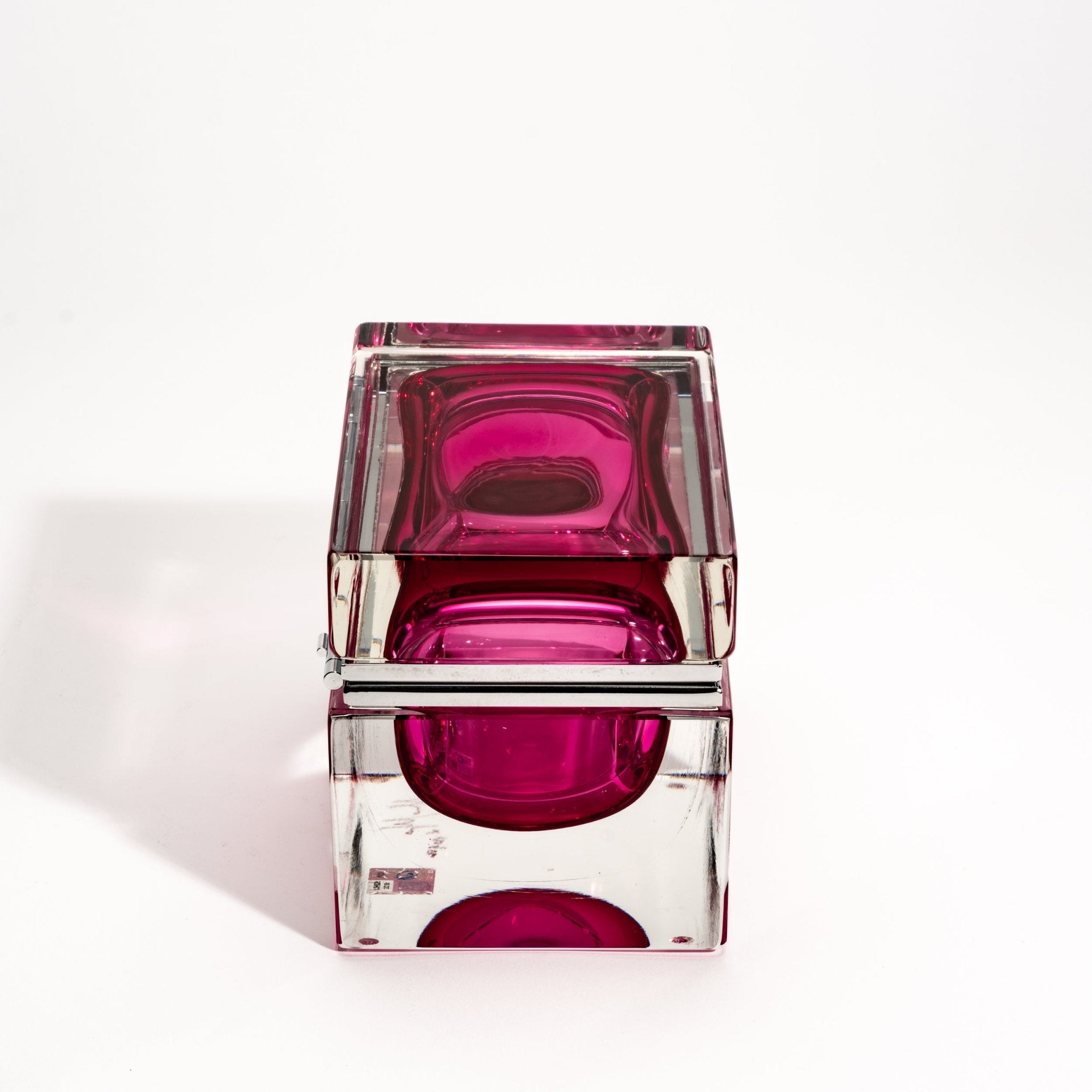 Hand-Blown Murano Box in Ruby with Chrome Fittings is a radiant celebration of color, craftsmanship, and Italian elegance. Meticulously hand-blown in Murano, this striking piece showcases a lush ruby-toned glass core, suspended in a clear rectangular form that reveals every nuance of light and depth within. The intense crimson hue glows warmly through the precision-cut facets, offering a luxurious counterpoint to the brilliant clarity of the outer casing.The box is accented with gleaming chrome fittings, seamlessly inset to create a refined frame that enhances the sculptural nature of the piece. A soft-close hinge reveals a perfectly contoured interior, echoing the box’s curvature and ensuring it is as functional as it is ornamental. Each detail—from the thickness of the glass to the mirror-like polish of the fittings—demonstrates the unparalleled artistry of Murano’s master glassmakers. Signed by the artist, this is not merely a box but a jewel-like vessel—an heirloom of light, color, and design.