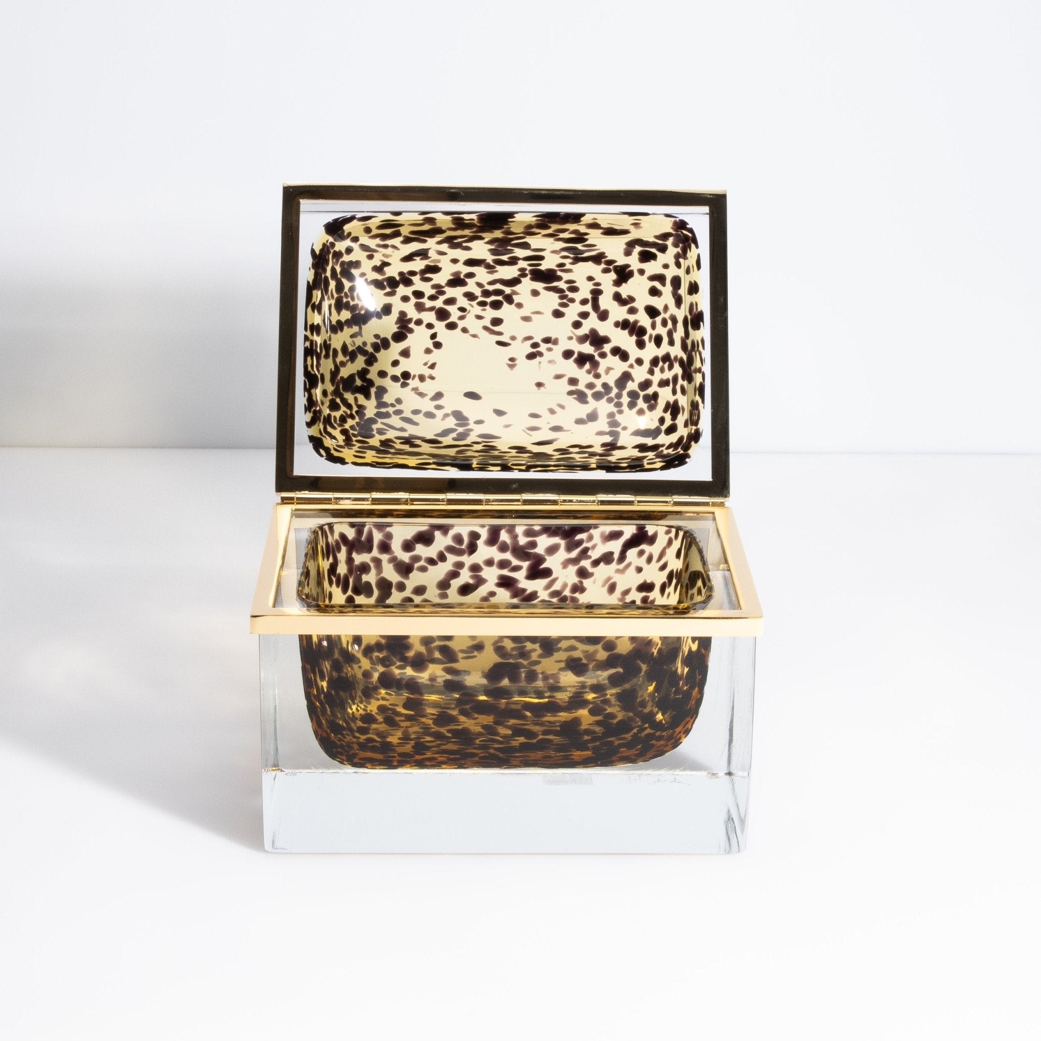 This savant-garde adornment is a unique and eye-catching piece that combines the rich tradition of Murano glassmaking with a contemporary and fashionable design. Handcrafted on the historic Venetian island of Murano, this box features a stunning leopard print pattern that adds a touch of exotic flair to any space.
