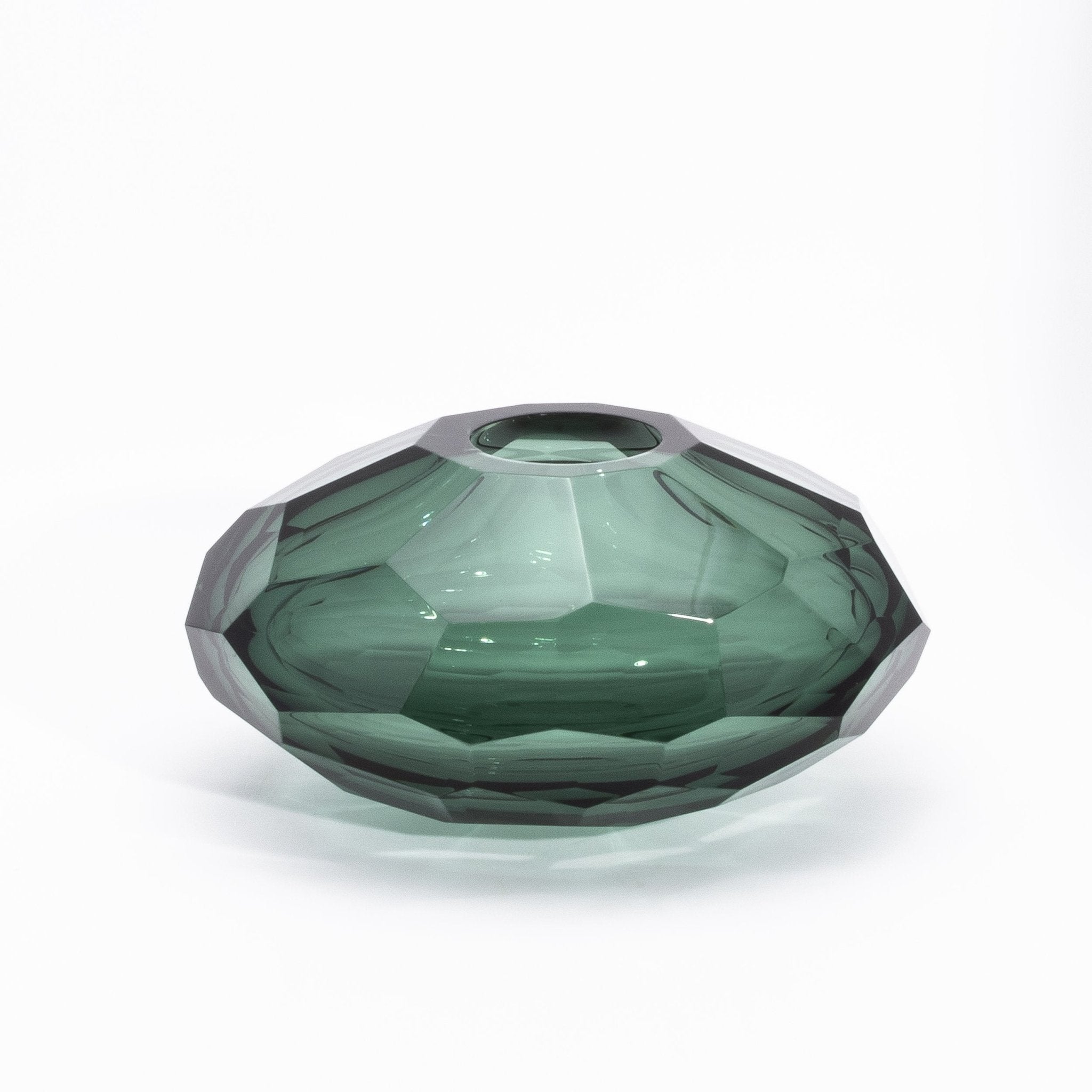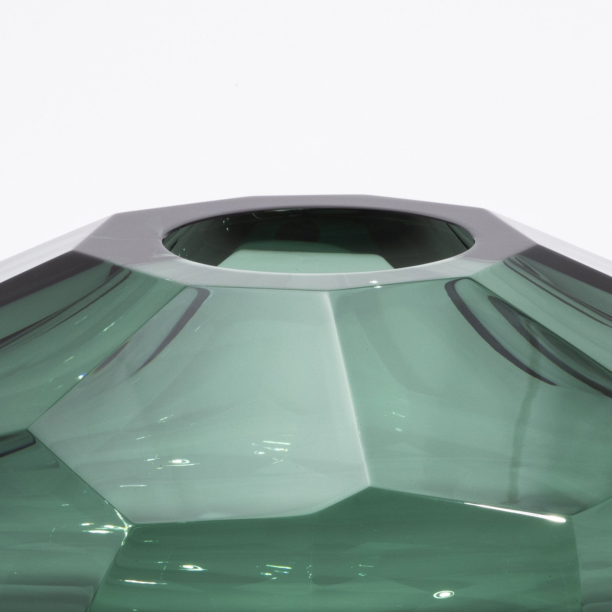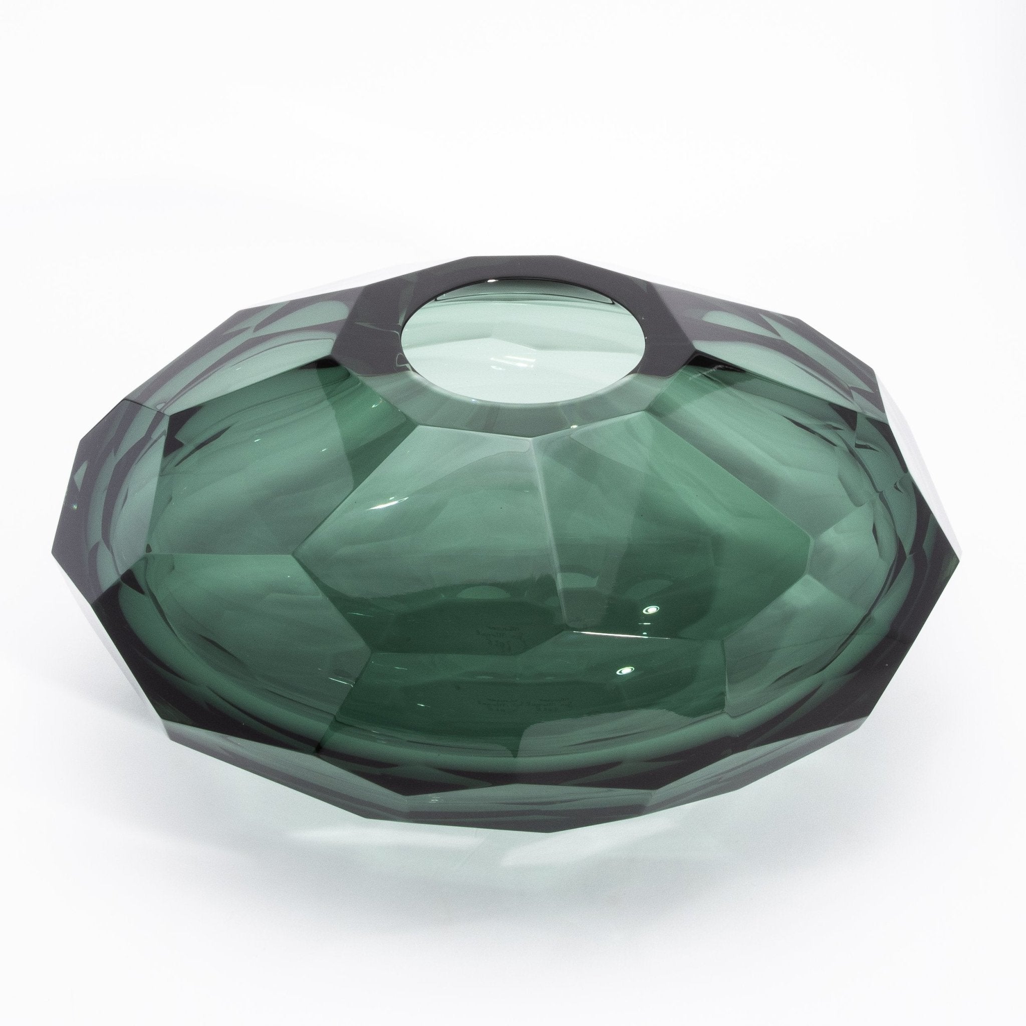 The Hand-Blown Murano Modern Faceted Bowl in Eucalyptus Green is a masterpiece of Italian glass artistry, reflecting centuries of Murano craftsmanship. Its striking, multifaceted surface refracts light with exquisite brilliance, casting a mesmerizing interplay of depth and shadow. The deep emerald hue, reminiscent of the most precious gemstones, enhances its sculptural presence, creating a luxurious statement of sophistication and exclusivity. Each hand-crafted piece is shaped with geometric precision, resulting in a bold yet fluid form that exudes both modernity and timeless appeal. The tactile smoothness of the faceted design invites admiration from every angle, embodying the essence of true artisan craftsmanship. This exceptional piece is also available as a vase, offering versatility in styling while maintaining its captivating allure. Whether displayed as a bowl or a vase, this one-of-a-kind Murano creation transforms any space into an exhibition of light, color, and impeccable artistry.