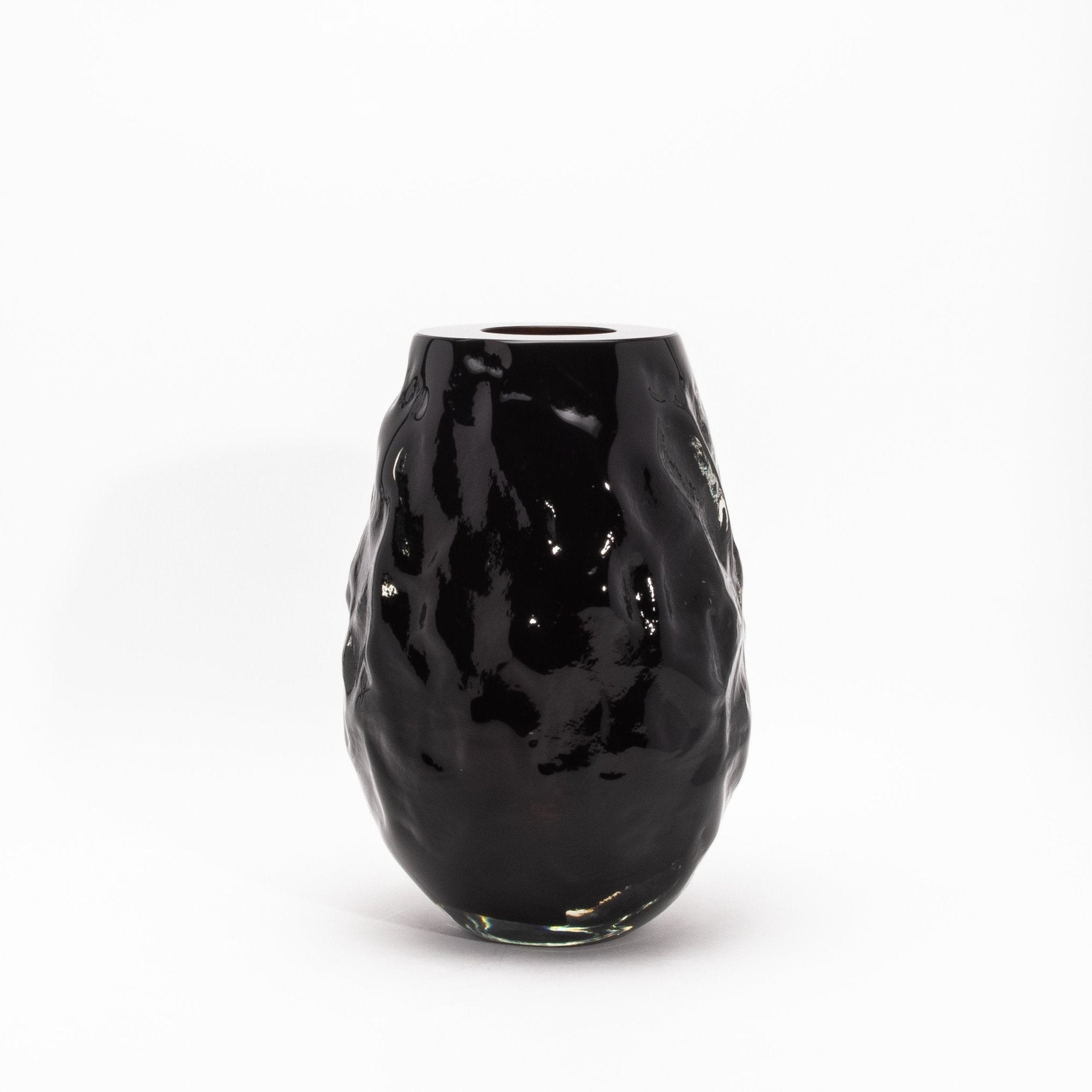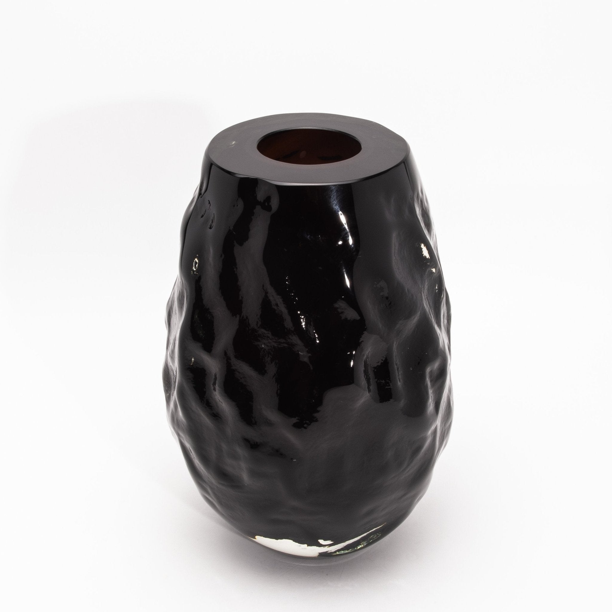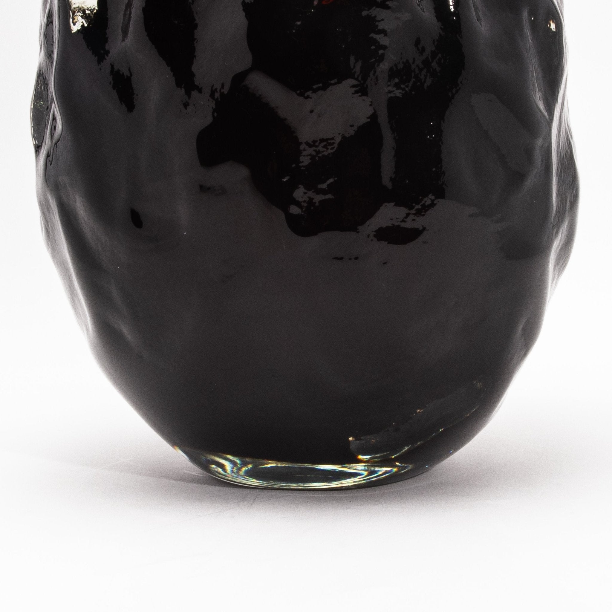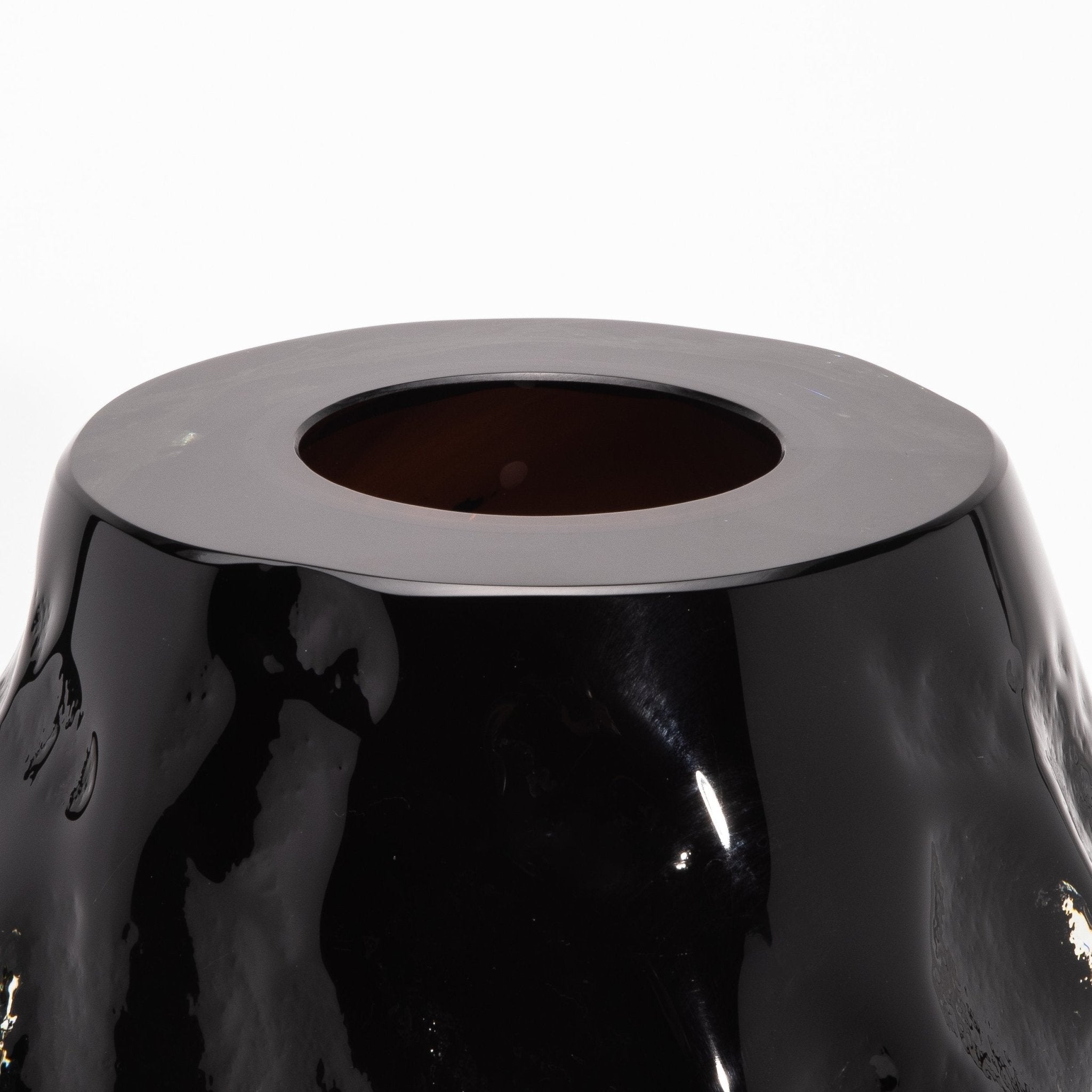 This hand-blown Murano sculptural vase in Onyx Black is a celebration of modern craftsmanship, where traditional glassmaking meets contemporary design. Its surface is richly textured, with an organic, almost volcanic form that feels both raw and refined—like a natural element shaped by fire and time. The deep, glossy black finish captures and reflects light with a mesmerizing sheen, while subtle transparencies near the base reveal the exceptional clarity of the Murano glass. The irregular silhouette evokes a sense of fluid movement, as if the vase itself is in a state of elegant transformation. Each piece is individually crafted, ensuring no two are exactly alike, making it a true collector’s treasure. Bold and sculptural, this vase adds a striking dimension to any space—whether placed as a standalone art piece or used to enhance floral arrangements with a touch of dramatic flair. It's a bold design statement for the most sophisticated interiors.