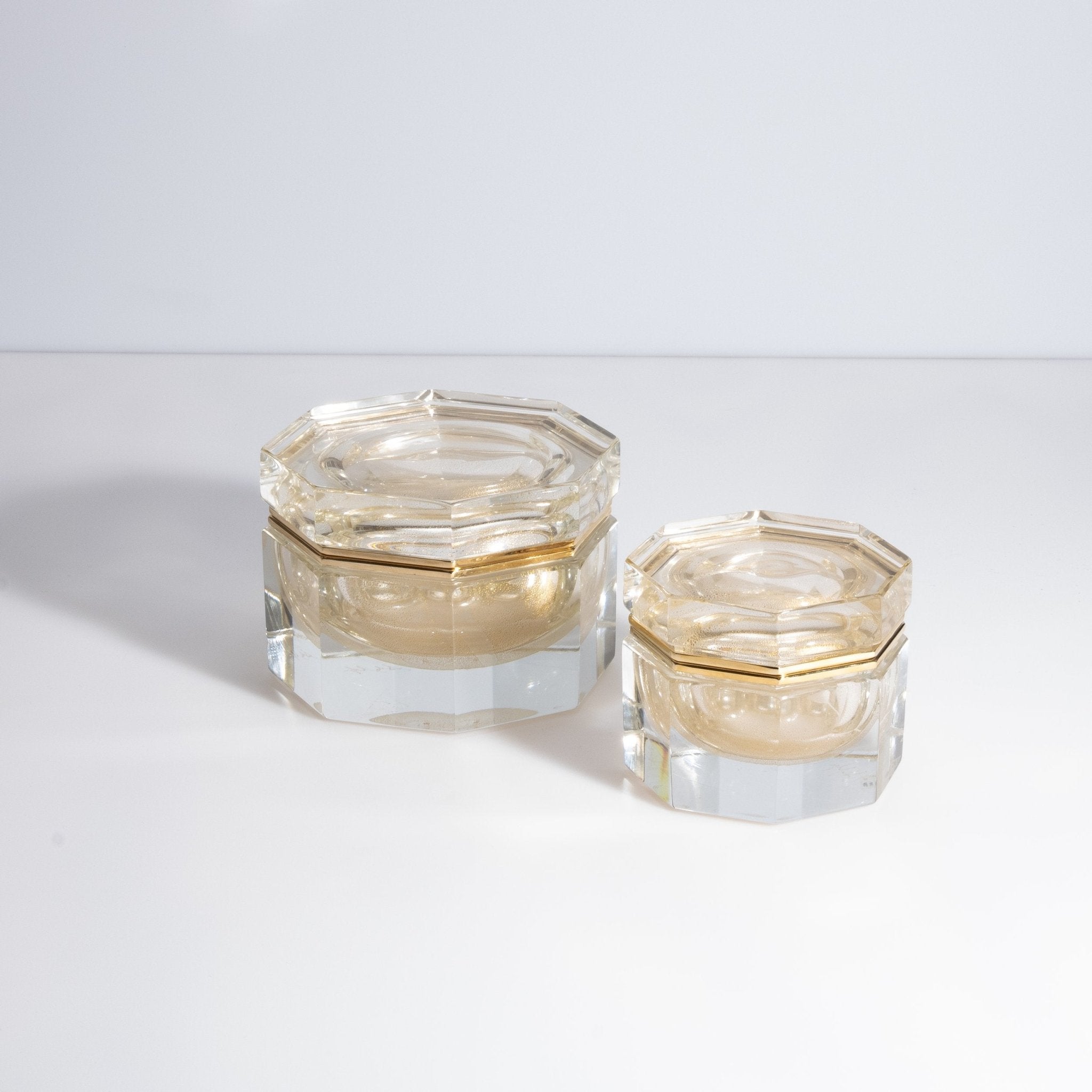 The exquisite octagonal jewel box in crystal with 24-karat gold flecks is a captivating blend of traditional craftsmanship and luxurious aesthetics. Handcrafted on the historic island of Murano, this box exemplifies the artistry and skill that define Murano glassmaking.