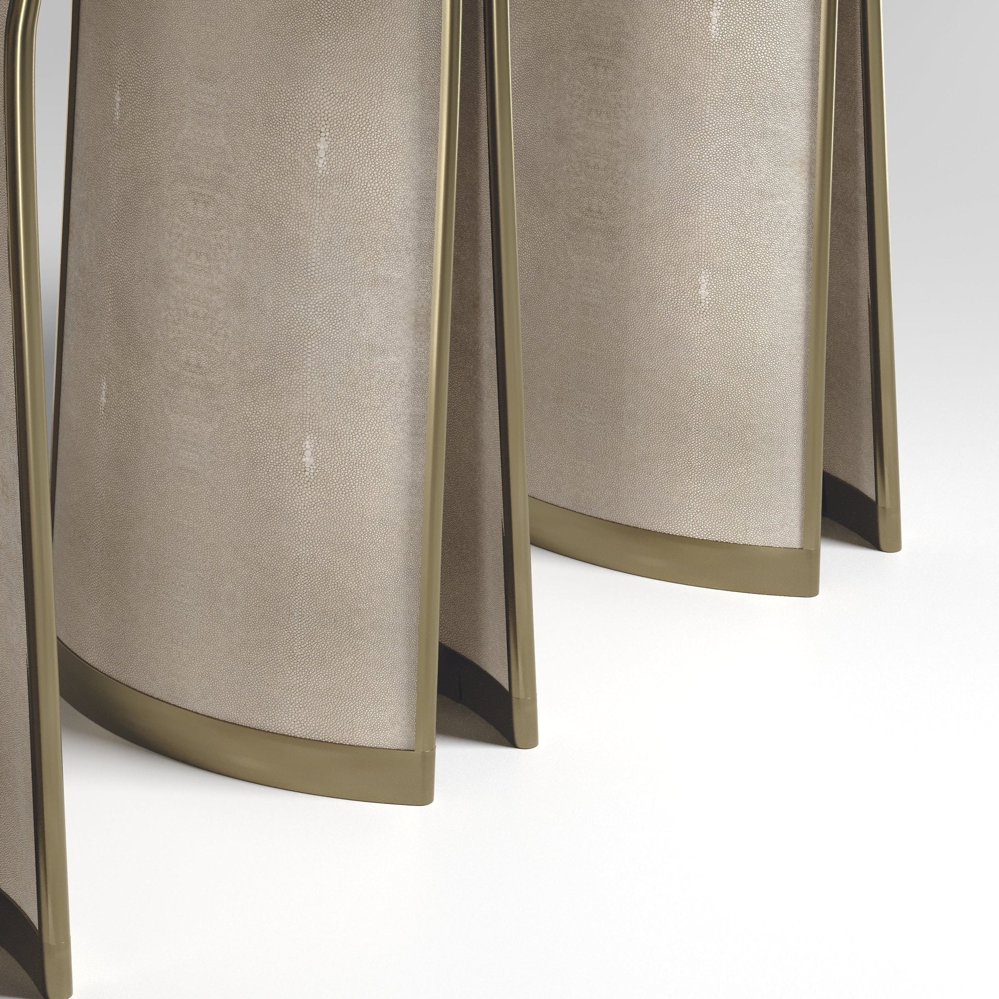 Available in a variety of finishes and custom configurations. The design can be produced entirely in shagreen in multiple colorways with brass detailing, entirely in shell with brass accents, or with a shagreen or shell top paired with sculptural brass rod legs. Custom sizing and finishing available upon request.