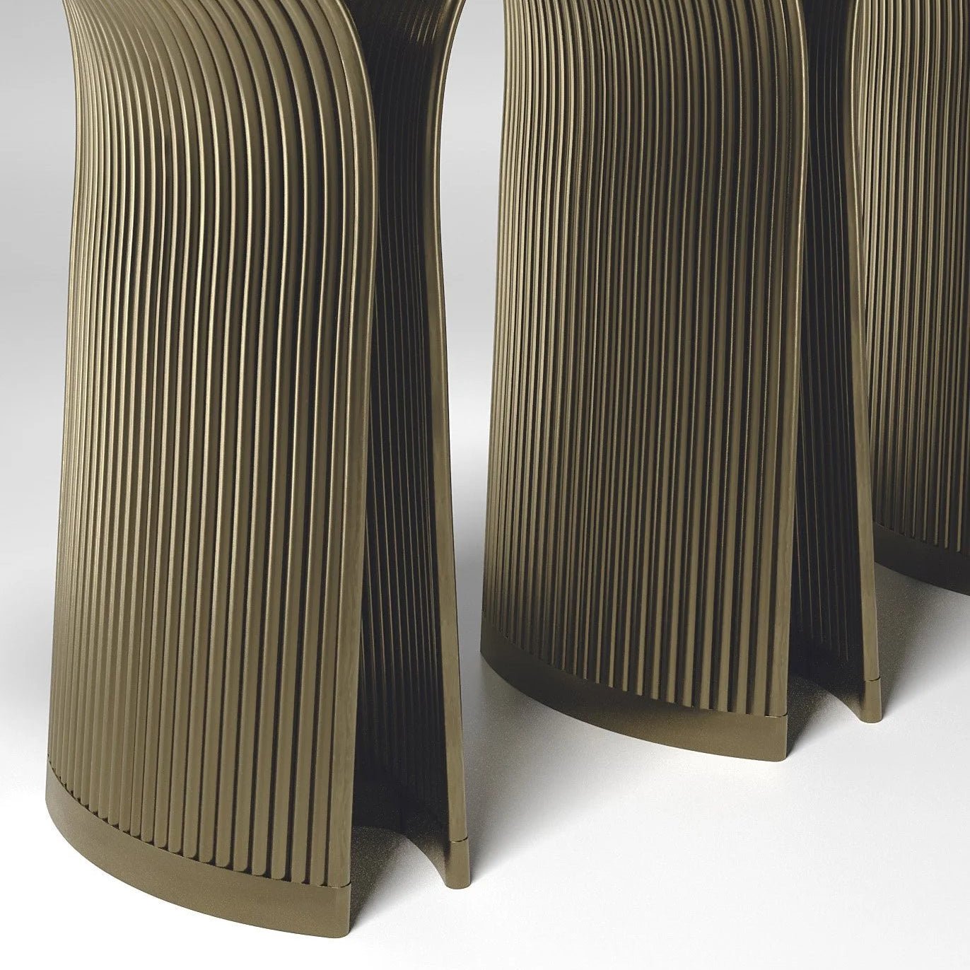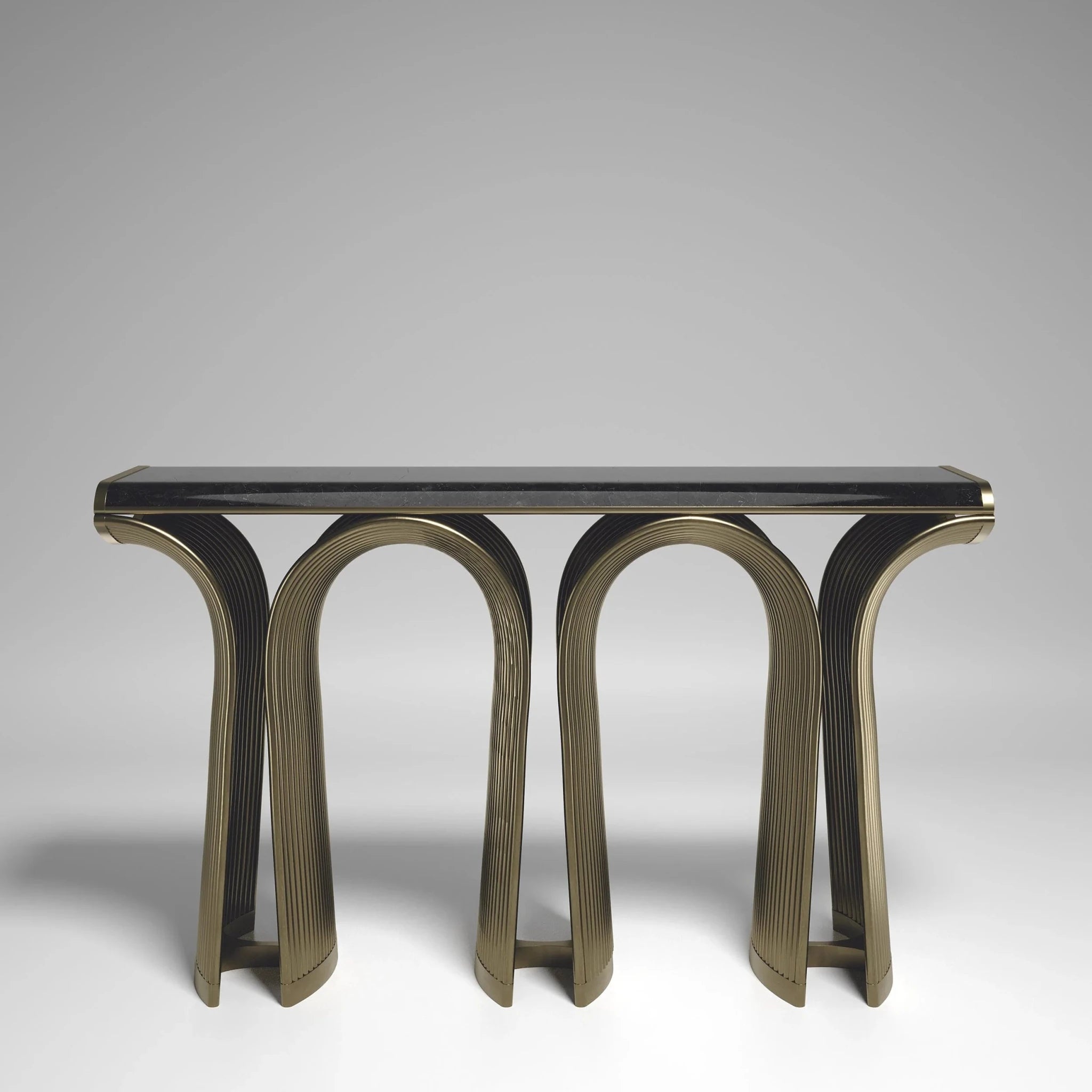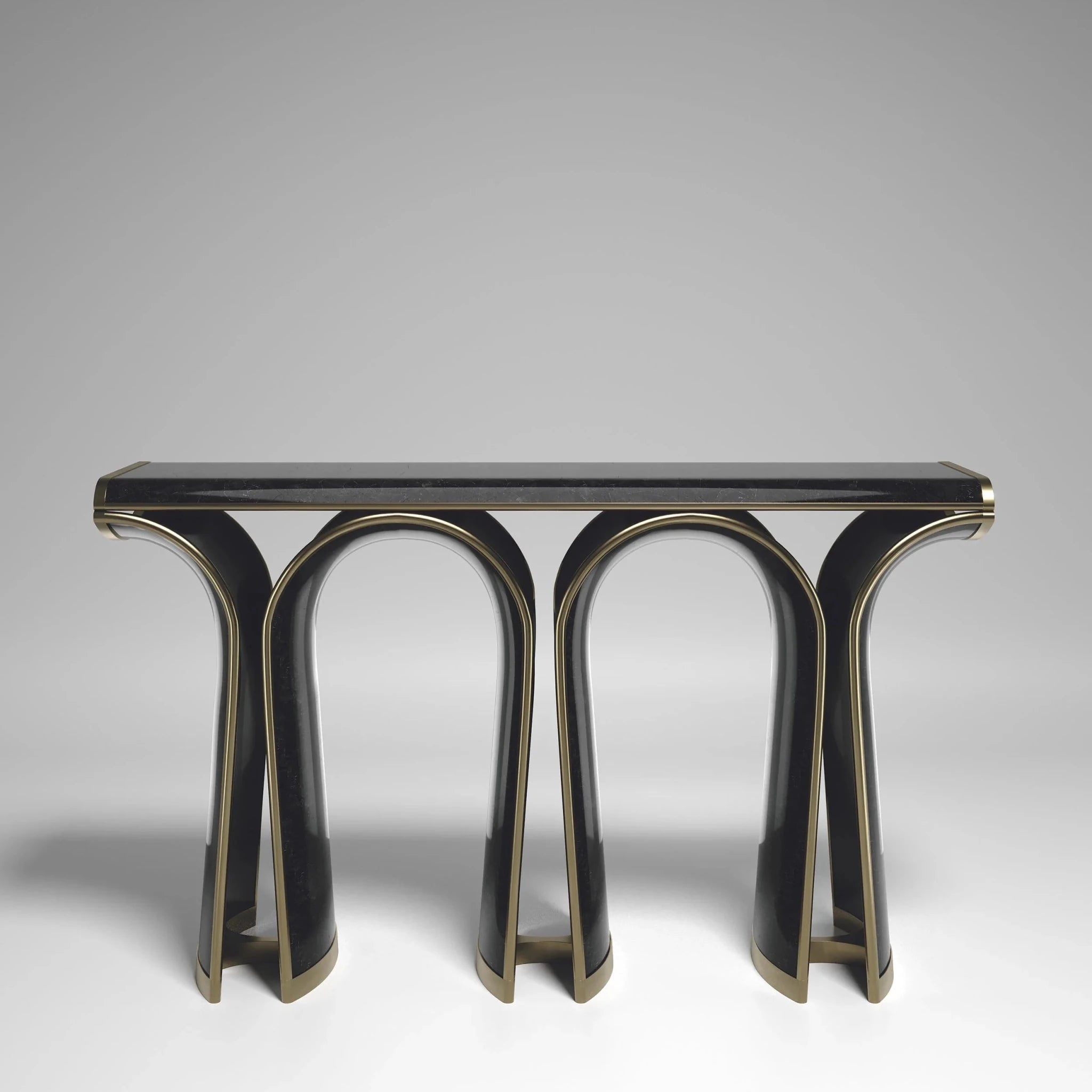 The Nymphea Console by R&Y Augousti is a sculptural statement that embodies the house’s signature dialogue between heritage craftsmanship and contemporary refinement. Wrapped in hand-inlaid shagreen and framed with bronze patina brass detailing, the piece reveals a rhythmic sequence of arched forms that create both structure and visual lightness. The silhouette is architectural yet fluid, with each curve meticulously outlined in brass to emphasize proportion and precision.