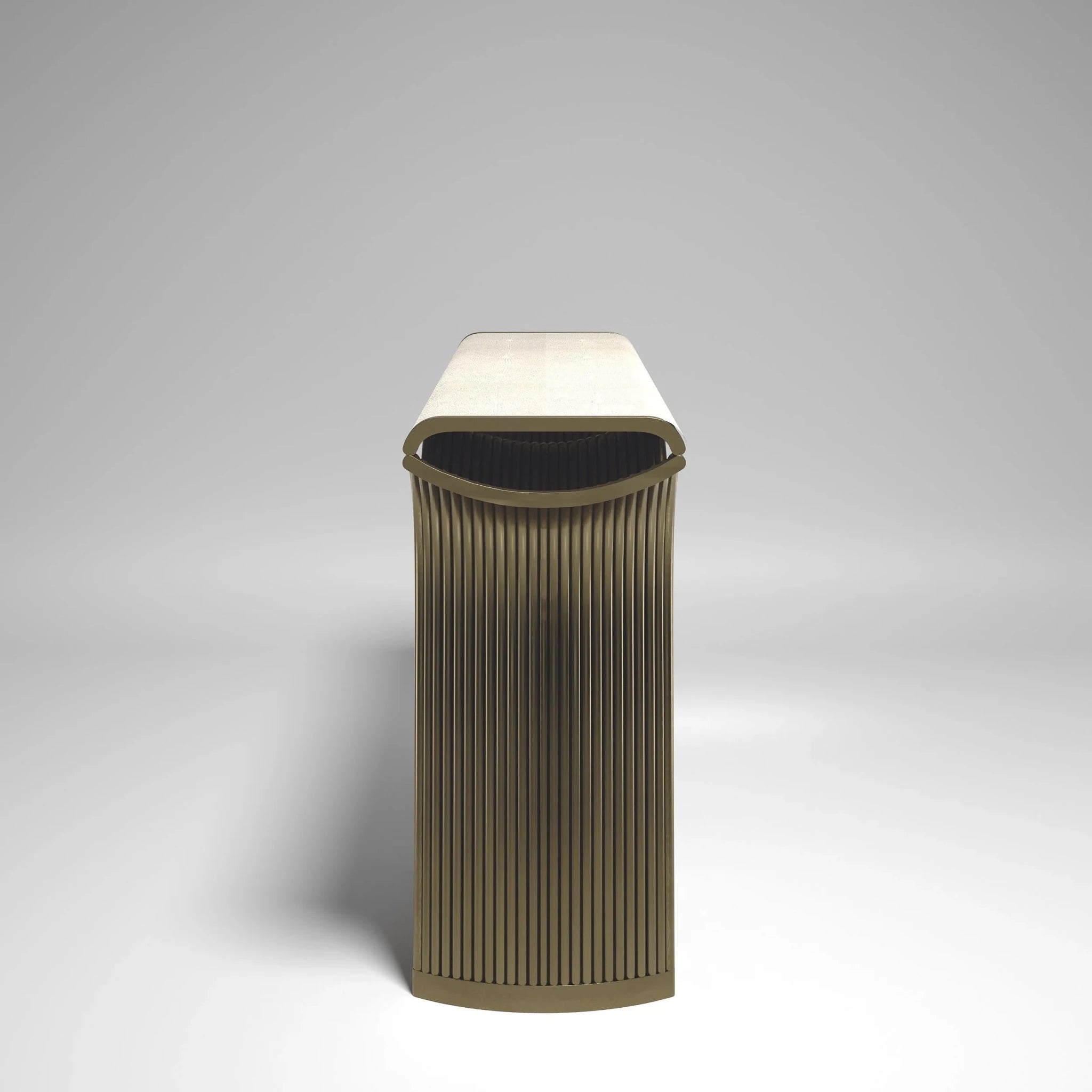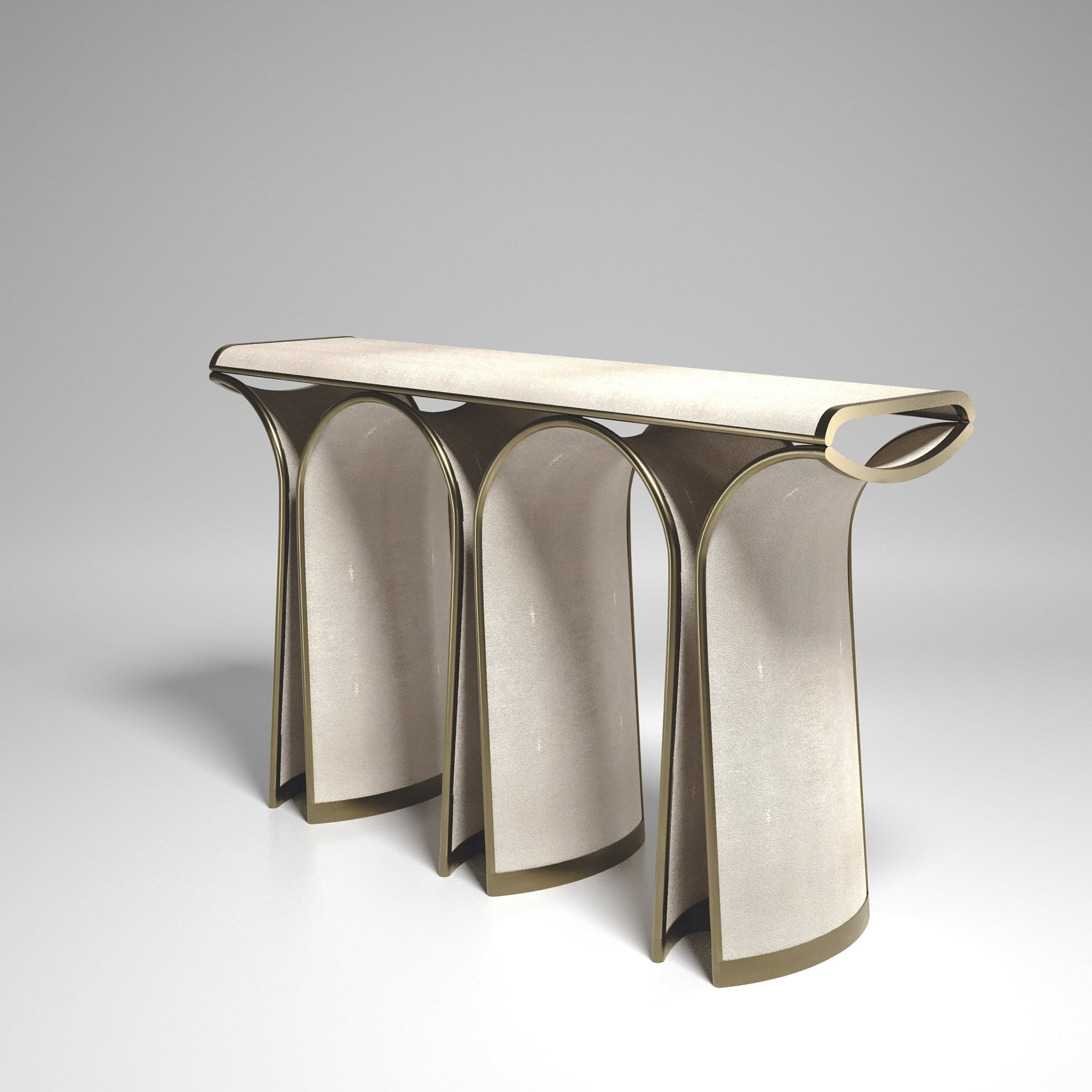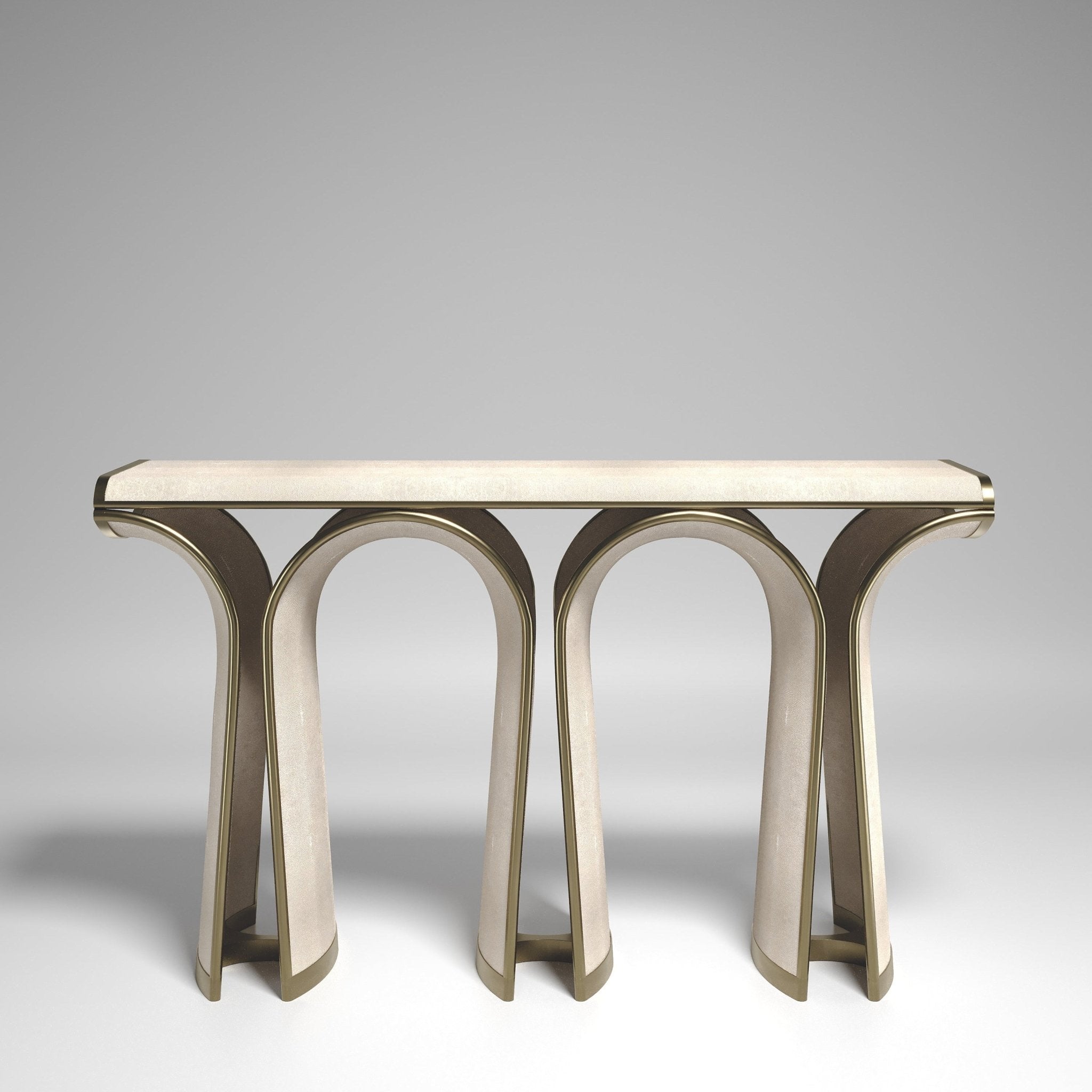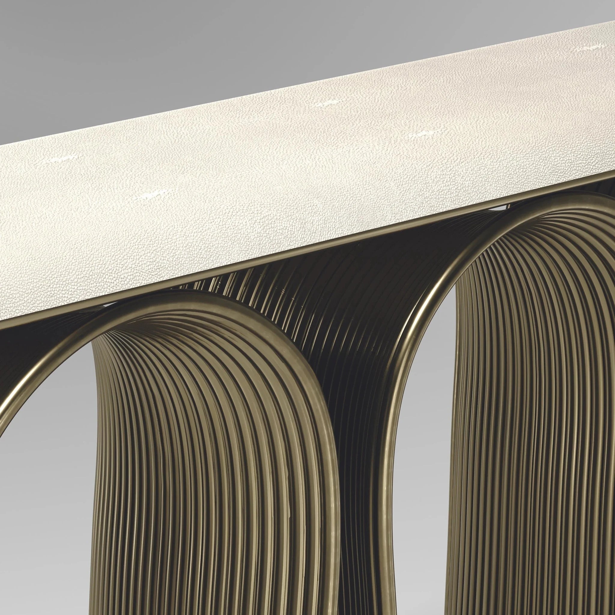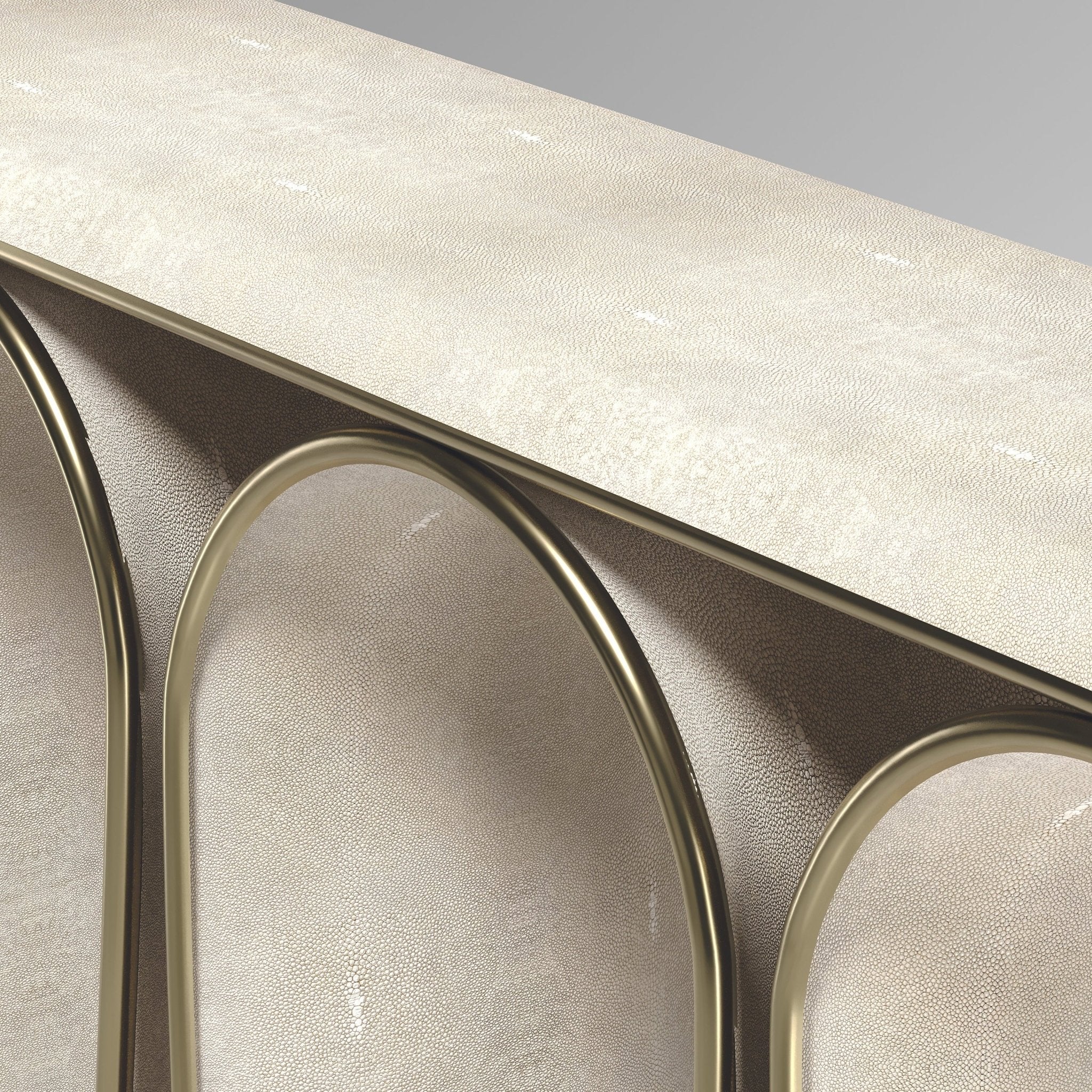 The softly textured shagreen surface lends organic depth and warmth, contrasting beautifully with the rich tonal variation of the bronze patina brass. The elongated top appears to float above the repeating arches, creating a sense of balance and movement. Substantial yet elegant, this console anchors an entryway, corridor, or living space with quiet authority while maintaining an unmistakably refined presence.