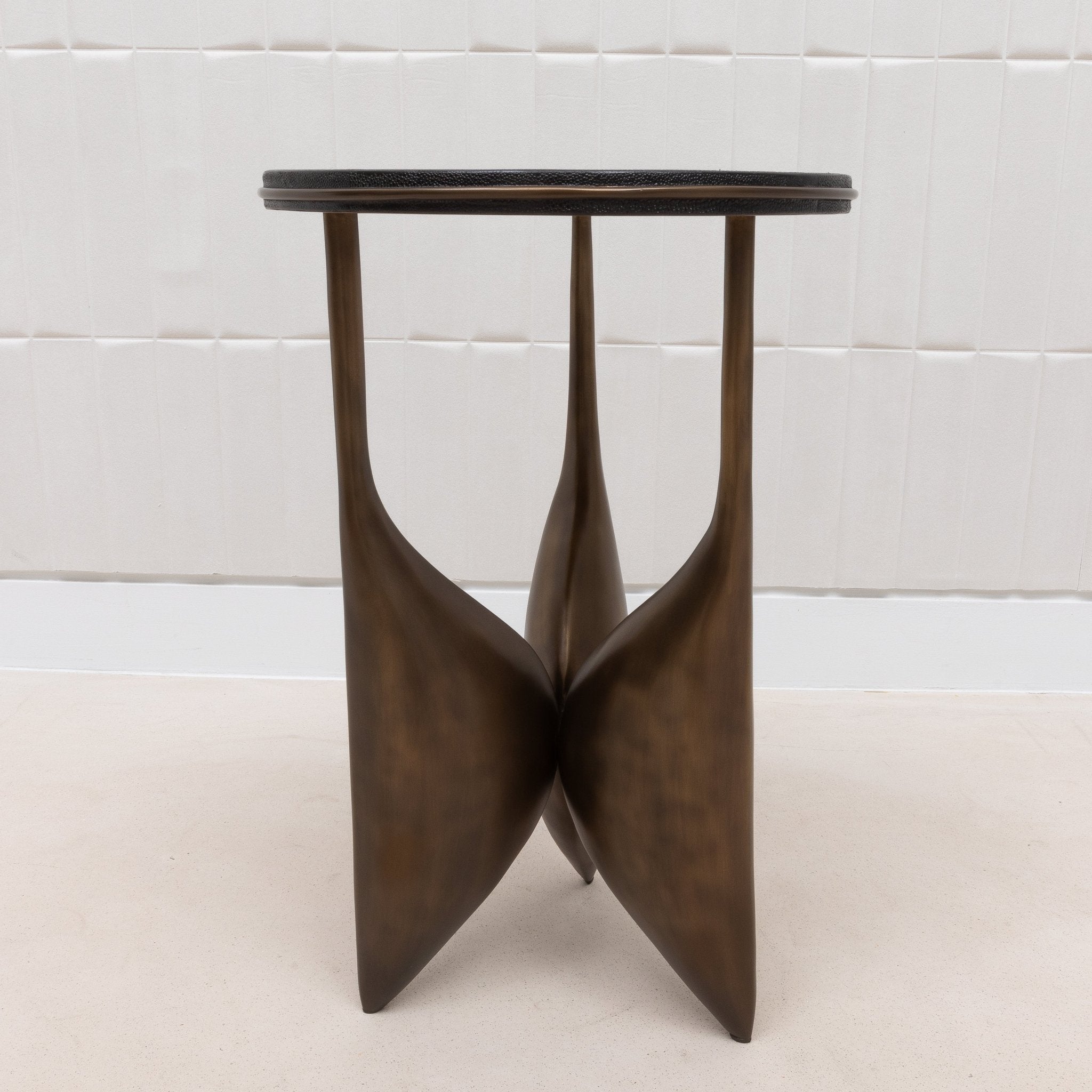 The top, wrapped in hand-inlaid shagreen, evokes the subtle ripples of water, its texture offering a tactile contrast to the deep bronze base. A fine indentation of bronze-patina brass encircles the edge, like a glint of sunlight dancing along the shoreline - an understated but impactful detail that anchors the piece in quiet sophistication.