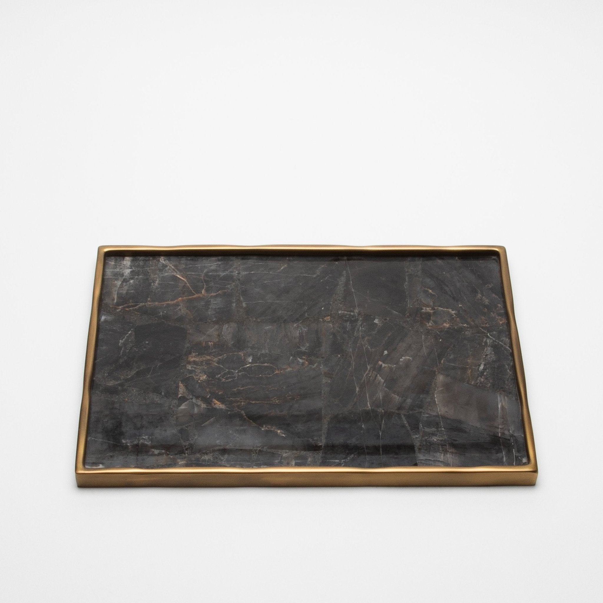 The Rectangular Melting Tray in Black Quartz with Bronze Patina Brass by R&Y Augousti is a stunning example of artistry and craftsmanship. The deep, textured surface of the black quartz, hand-cut and polished to perfection, offers a unique, natural pattern that draws the eye in with its earthy elegance. Encased in a bronze patina brass frame, the organic melting edges of the tray give it a fluid, sculptural quality, making it both a functional object and a piece of art. Each tray is meticulously handcrafted, ensuring that no two pieces are alike, embodying the luxurious and bespoke ethos of R&Y Augousti.