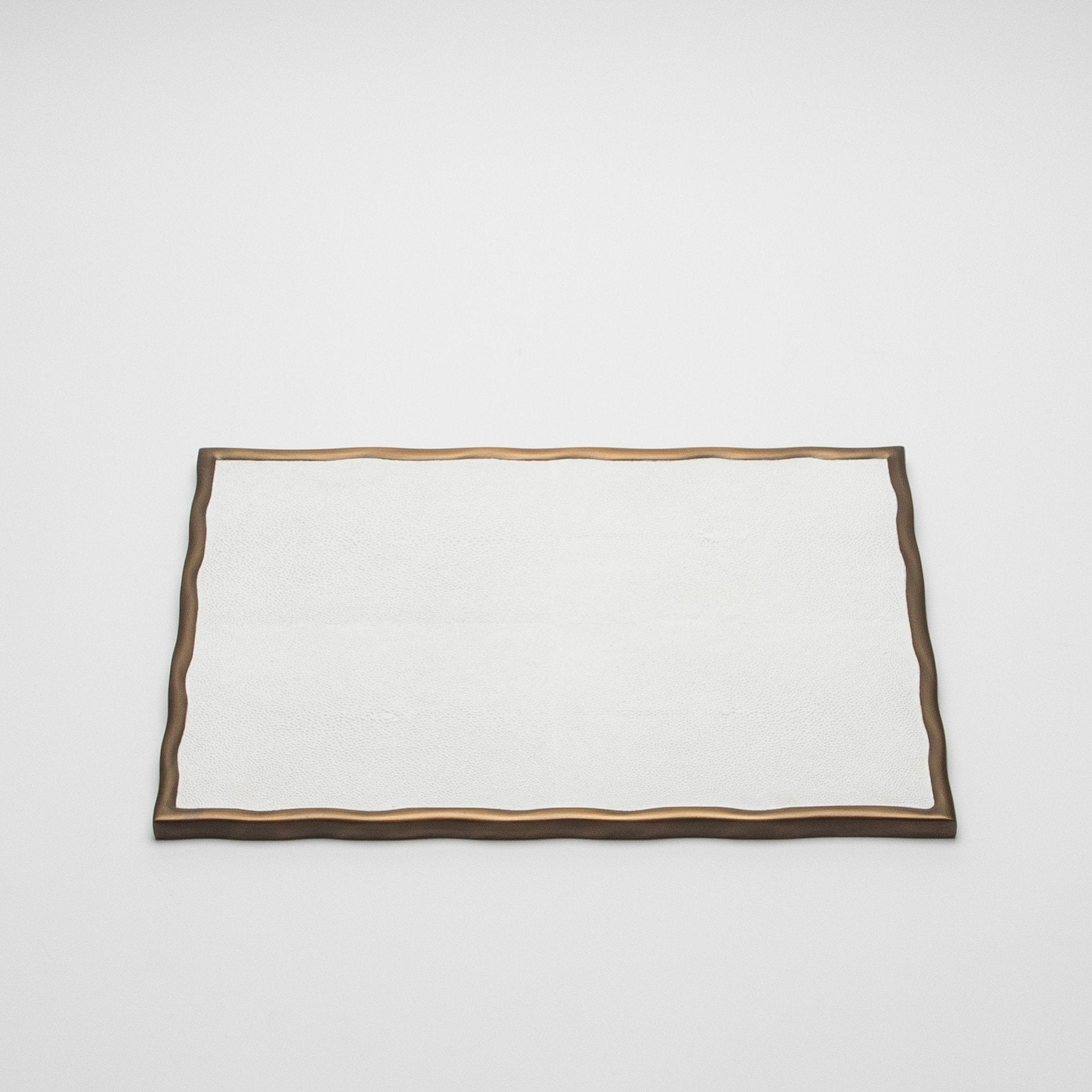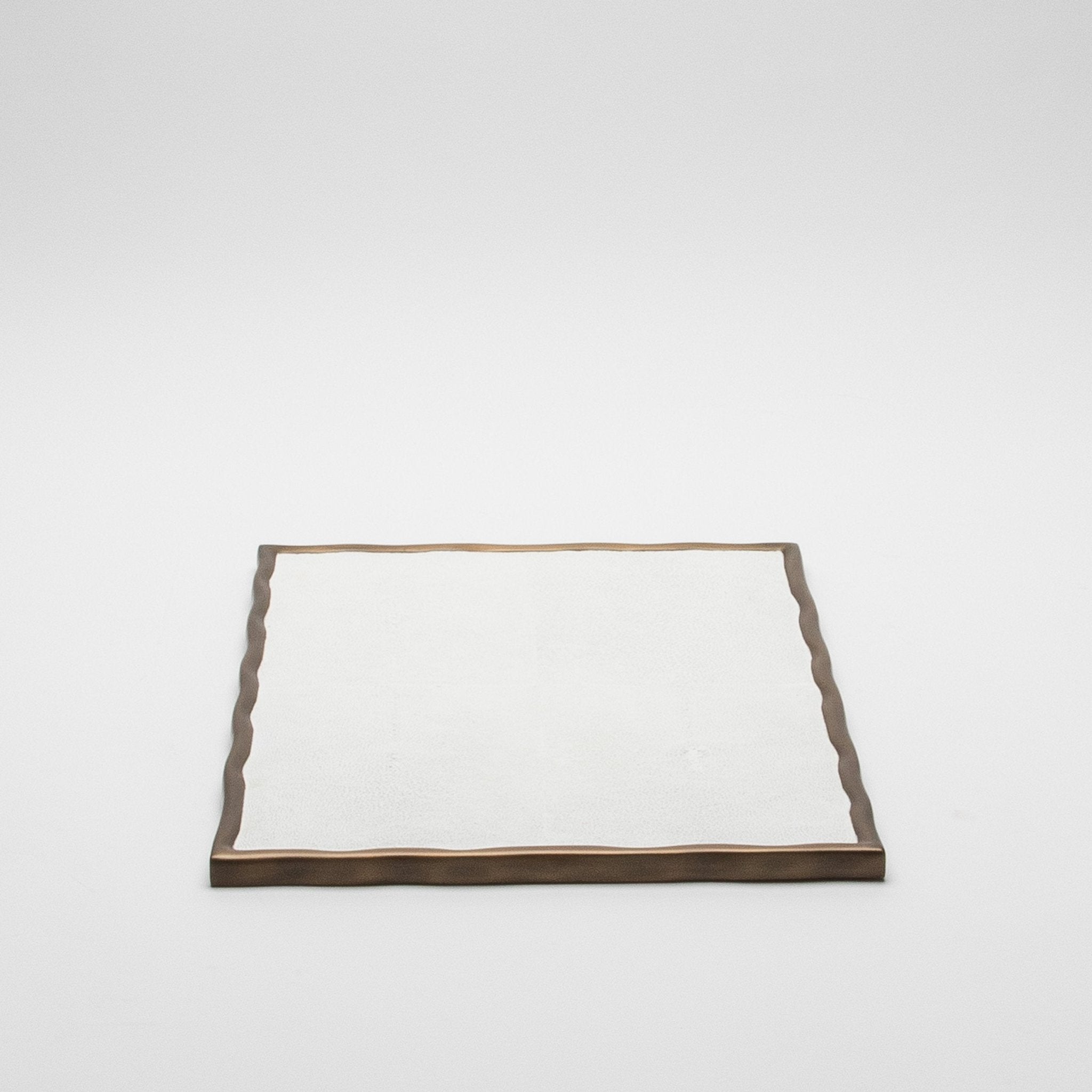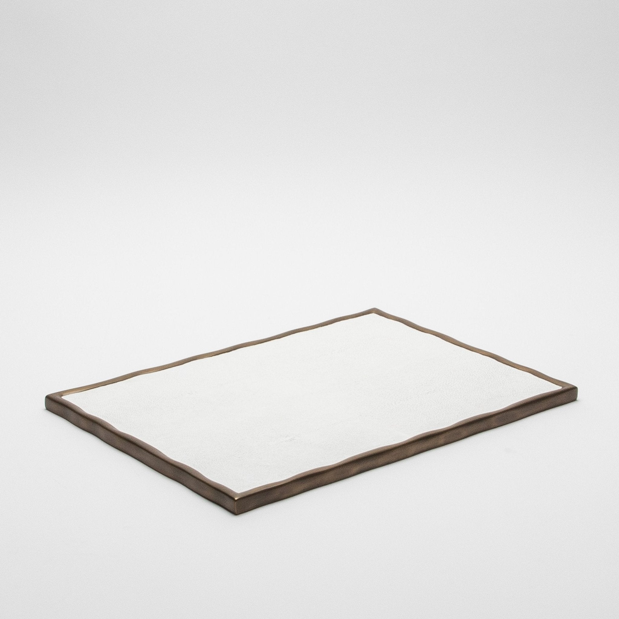 The Rectangular Melting Tray by R&Y Augousti in white shagreen exudes refined sophistication and meticulous craftsmanship. Encased in bronze patina brass with an organically flowing melting border, this tray merges timeless elegance with modern artistry. The shagreen's subtle texture paired with the brass frame creates a luxurious contrast, offering both aesthetic appeal and functional grace. Ideal for elevating a space with understated opulence, this hand-crafted piece is a testament to impeccable design and unparalleled artisanship.