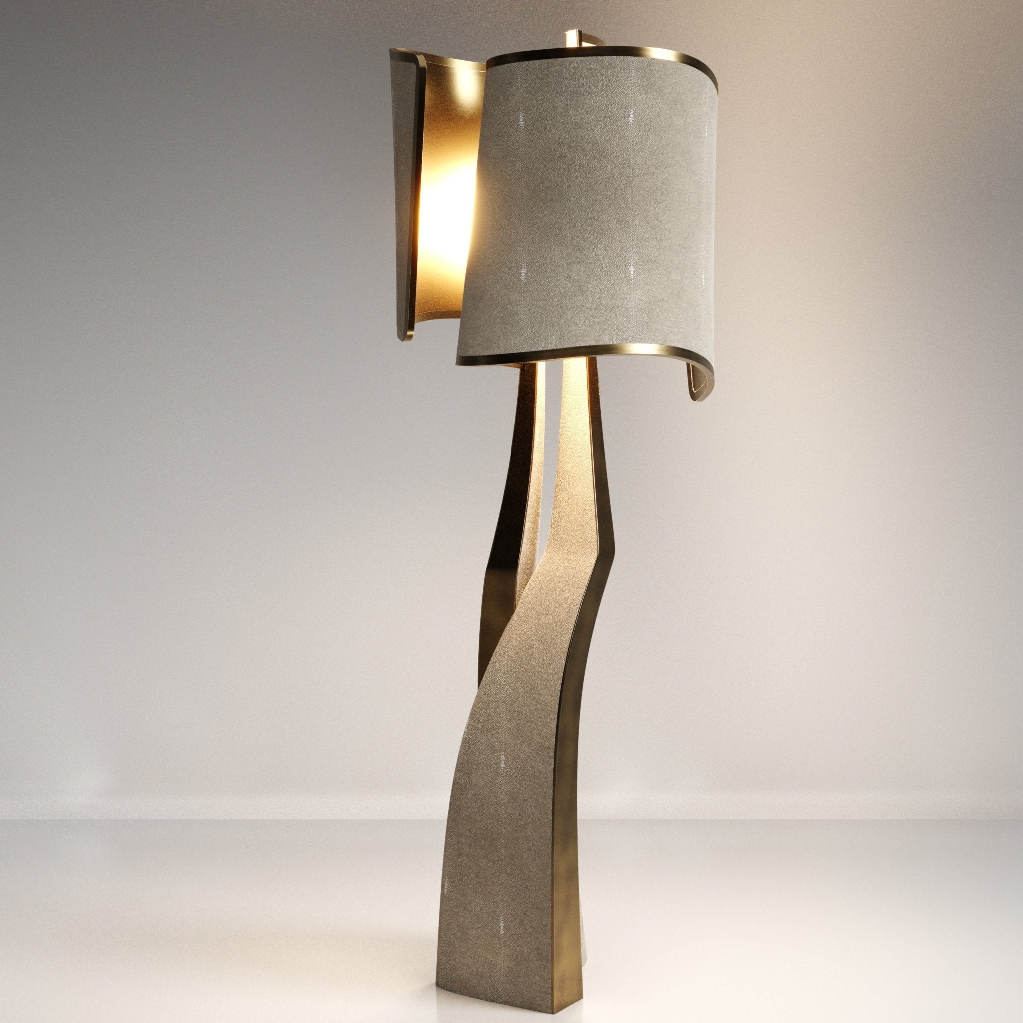 Executed in shagreen inlay with bronze patina brass, the lamp is distinguished by its rich material contrast and exceptional craftsmanship. The textured surface of the shagreen lends a quiet, tactile elegance, while the bronze patina brass adds warmth, depth, and a softly luminous finish that enhances the lamp’s dramatic presence.
