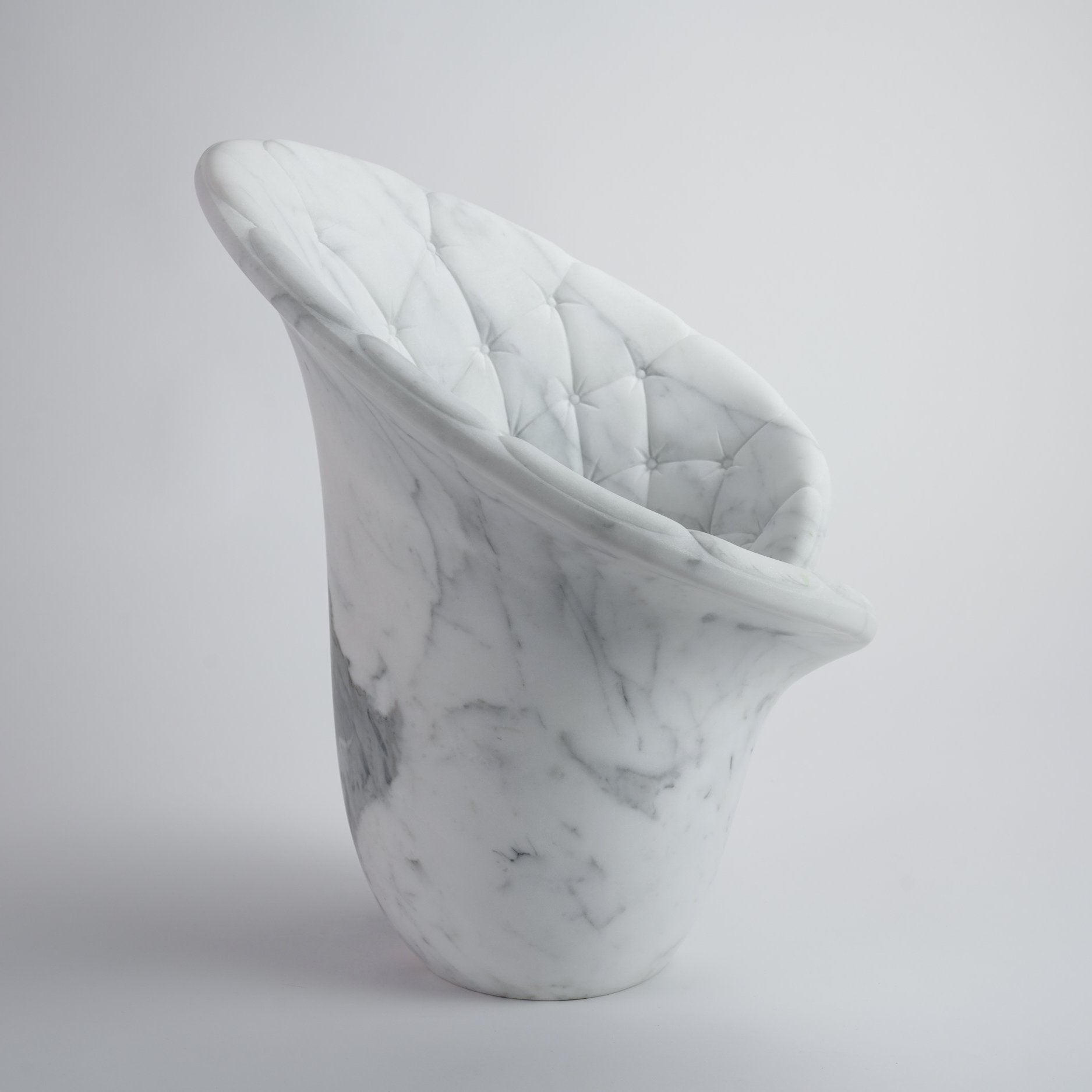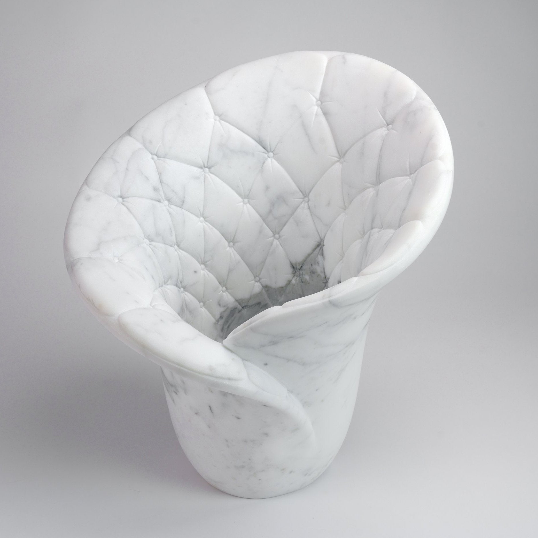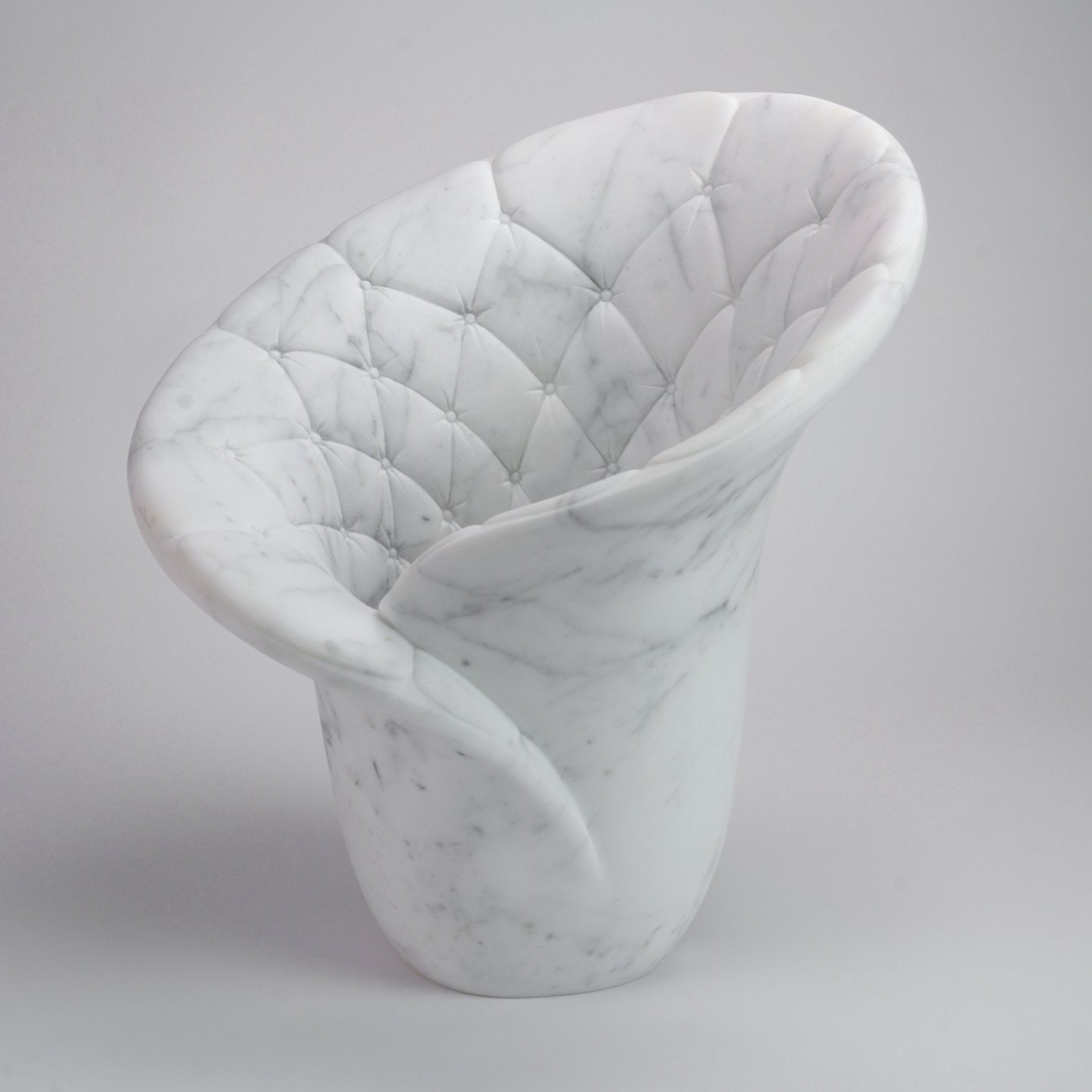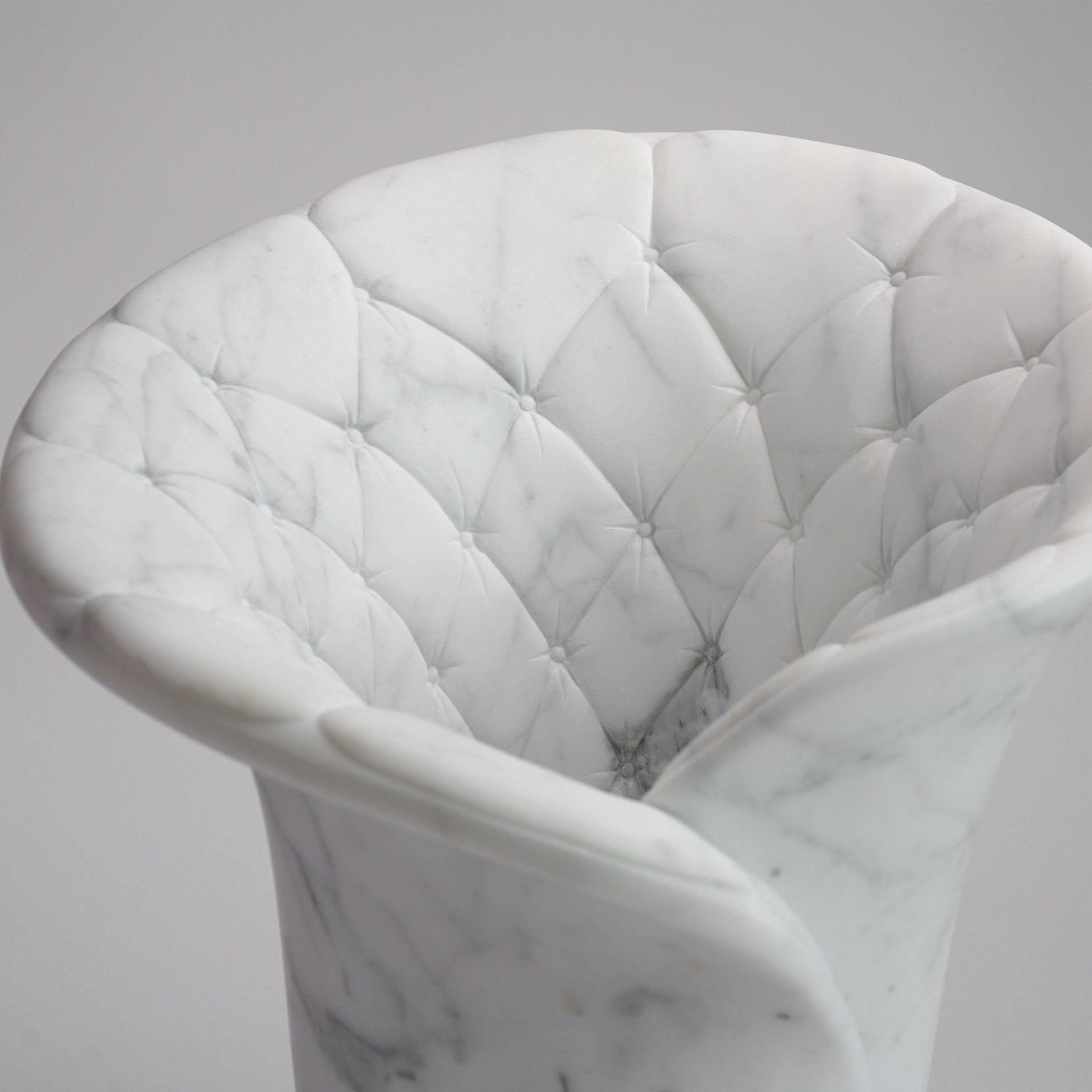 The "Capitonné" Vase by Barberini & Gunnell, hand-carved from statuary marble, is a captivating fusion of timeless craftsmanship and innovative design. Its quilted texture, reminiscent of the luxurious tufted upholstery technique, transforms the natural beauty of marble into a soft, sculptural form, inviting tactile exploration. Each curve of this vase exudes elegance, with its sinuous, organic shape resembling a flower in bloom. The intricate detail of the marble, expertly shaped and polished to perfection, highlights its luminous veining, adding a sense of movement and life to the piece. A limited edition of only 30, this vase is a true testament to the artistry of Barberini & Gunnell, where marble is not just a medium but a canvas for creating sculptural masterpieces. Signed and numbered, each piece is unique, a work of art meant to grace the most sophisticated interiors.