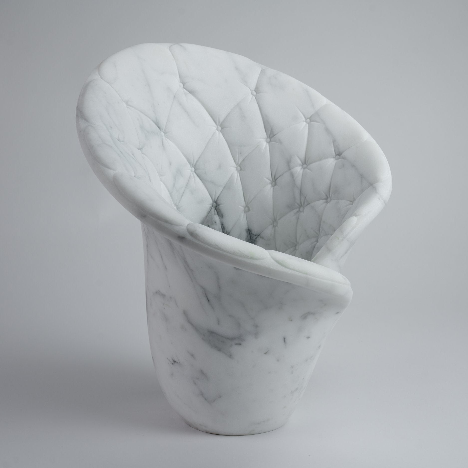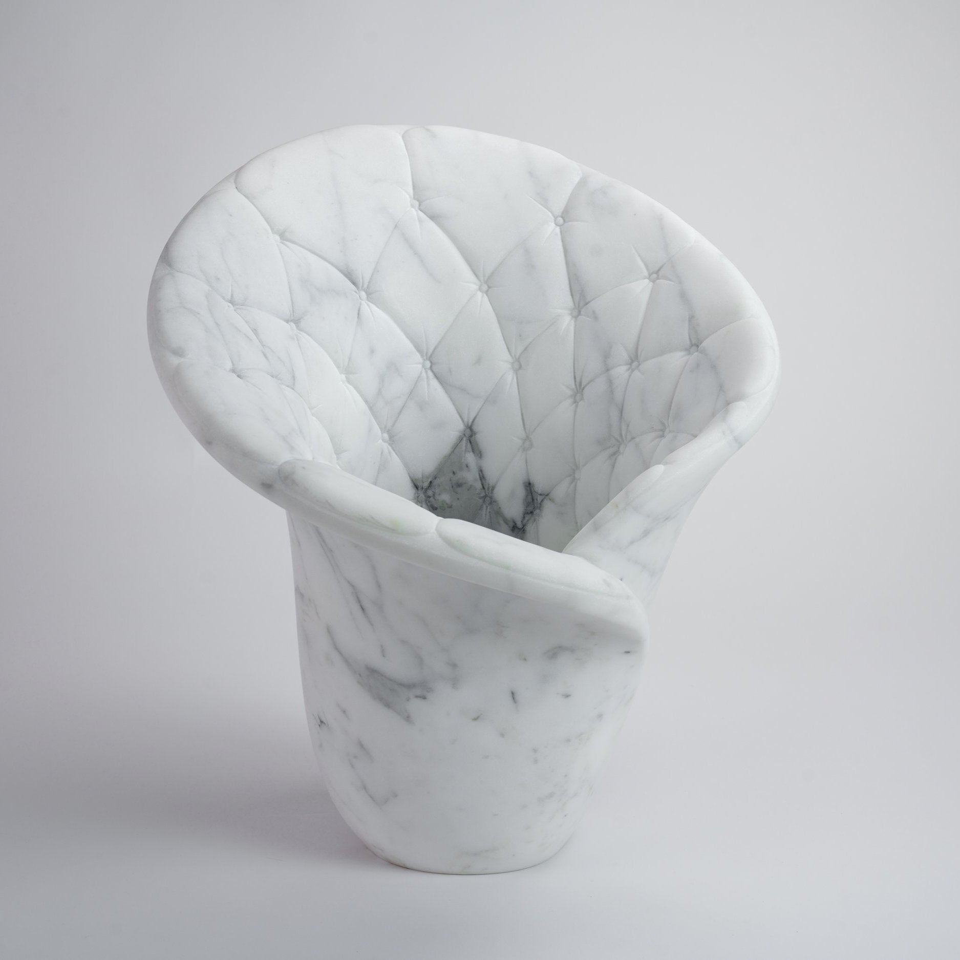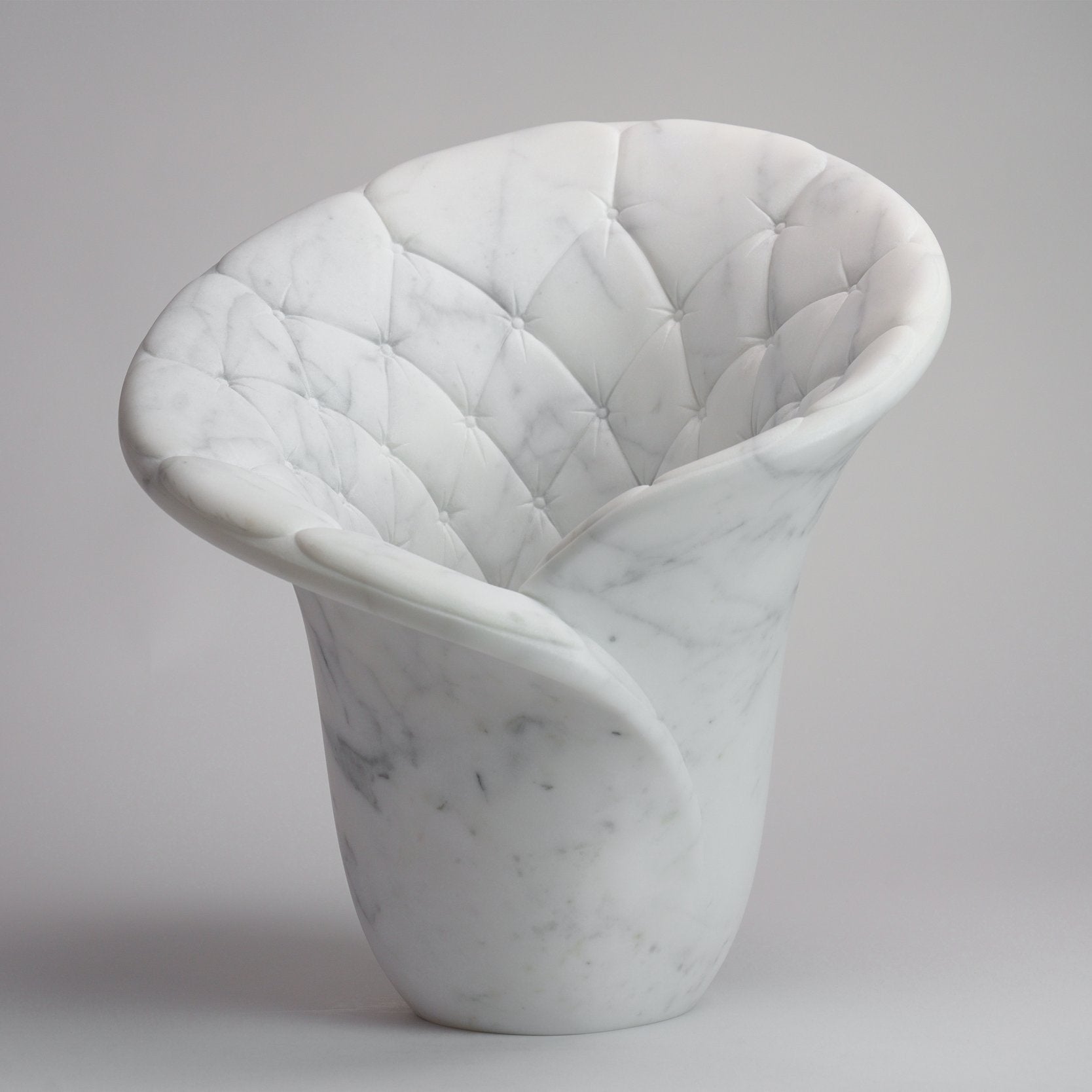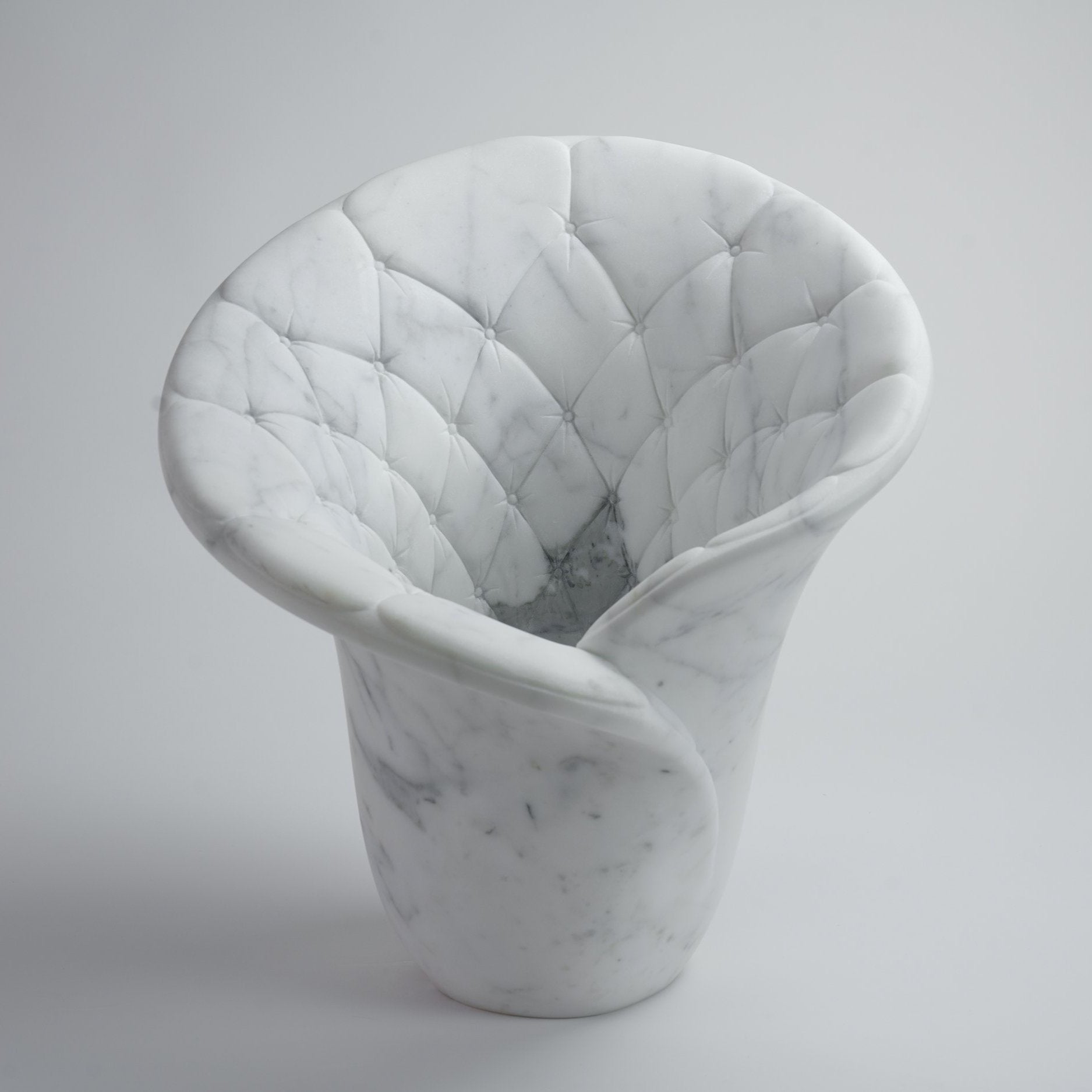 The "Capitonné" Vase by Barberini & Gunnell, hand-carved from statuary marble, is a captivating fusion of timeless craftsmanship and innovative design. Its quilted texture, reminiscent of the luxurious tufted upholstery technique, transforms the natural beauty of marble into a soft, sculptural form, inviting tactile exploration. Each curve of this vase exudes elegance, with its sinuous, organic shape resembling a flower in bloom. The intricate detail of the marble, expertly shaped and polished to perfection, highlights its luminous veining, adding a sense of movement and life to the piece. A limited edition of only 30, this vase is a true testament to the artistry of Barberini & Gunnell, where marble is not just a medium but a canvas for creating sculptural masterpieces. Signed and numbered, each piece is unique, a work of art meant to grace the most sophisticated interiors.