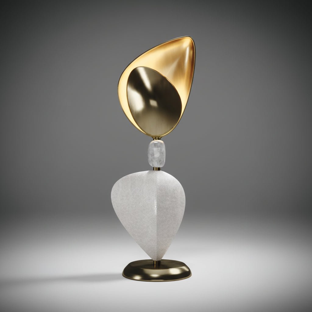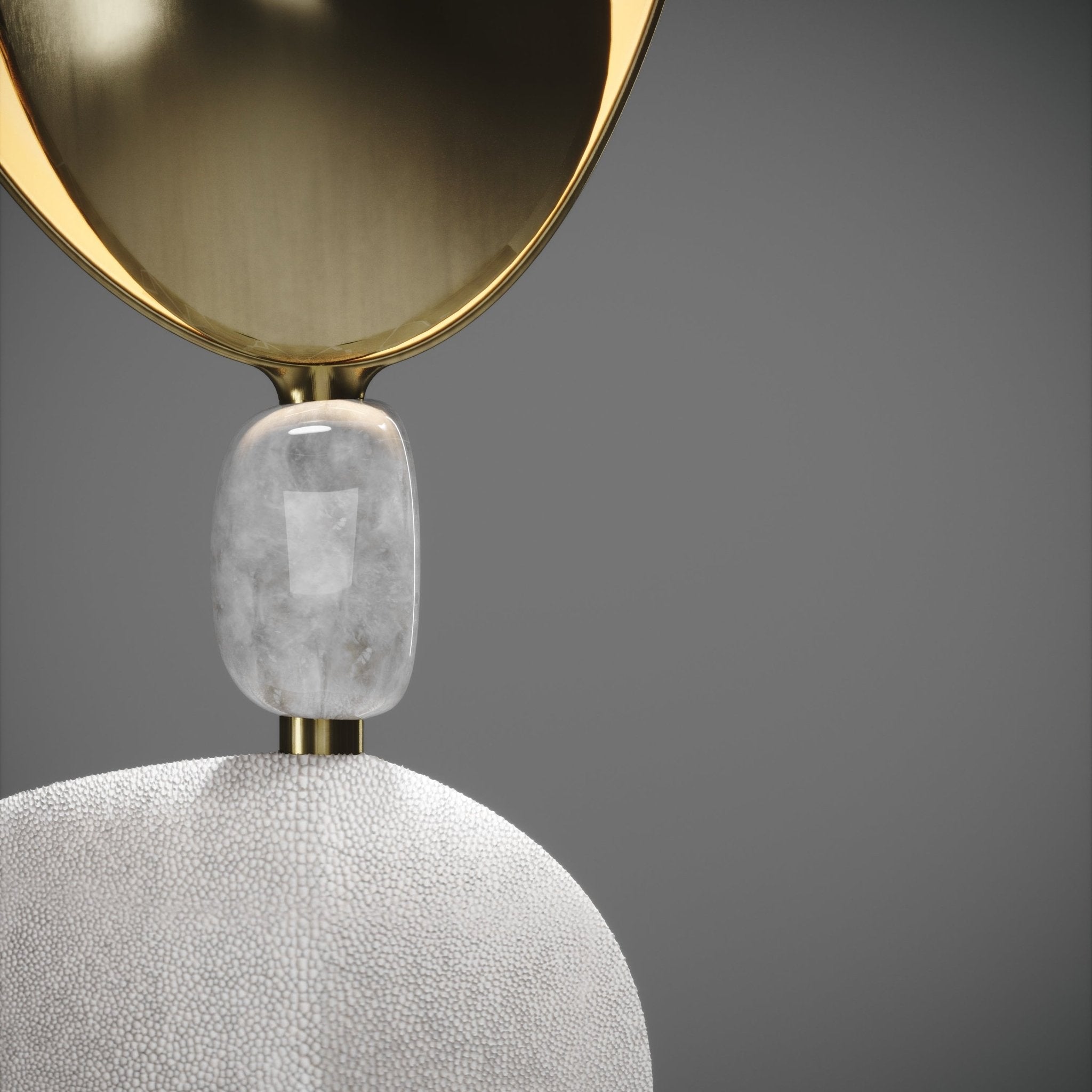 Crafted in cream shagreen with a smoky white quartz detail and bronze patina brass, this design is rich in texture and contrast. The softness of the shagreen, the luminous stone, and the warm metallic finish create a composition that feels both collectible and deeply luxurious. The shagreen and quartz elements can also be moved around, adding a dynamic quality to the lamp’s sculptural form.