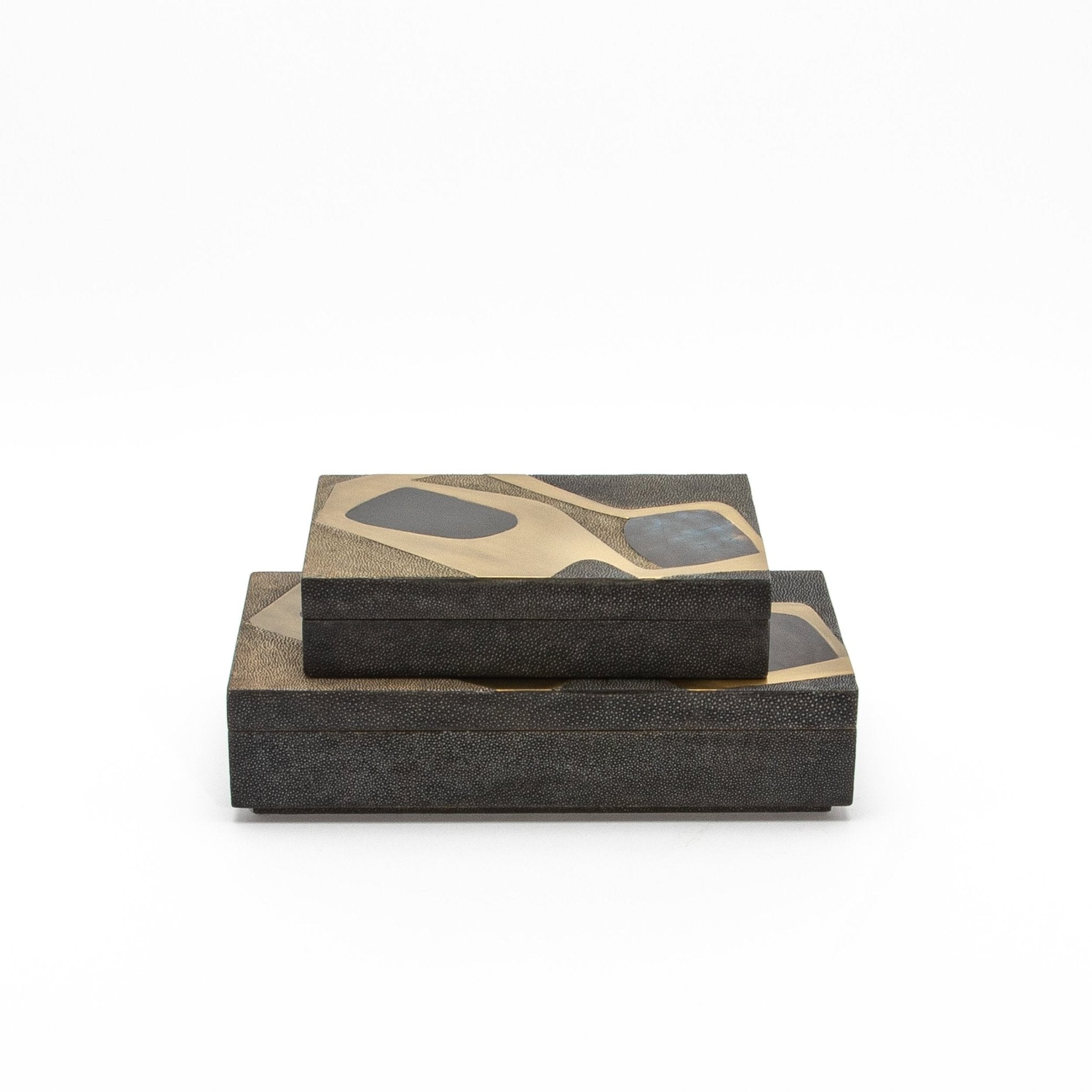 Set of 2 Rectangular Boxes in Coal Black and Brown Shagreen with Black and Blue Shell and Brass Cosmos Pattern Insert by R&Y Augousti