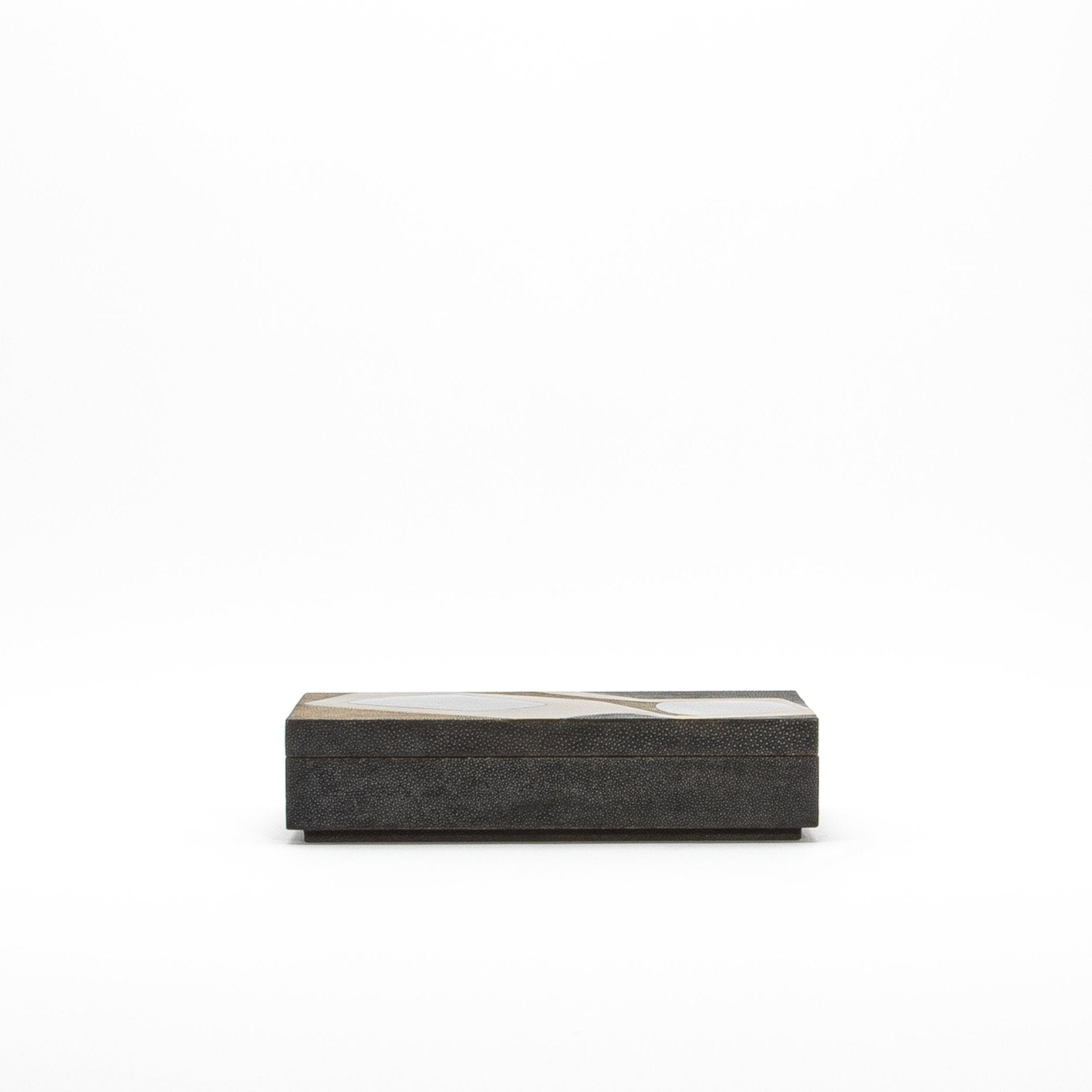 The bold elegance of the R&Y Augousti rectangular box set in coal black and brown shagreen offers a statement of modern luxury with a touch of artistic flair. The rich shagreen surface is elevated by striking inlays of black and blue shell, artfully framed in smooth brass, creating a captivating cosmos-inspired pattern. The blend of textures and materials exudes a sense of sophistication, making these boxes a true centerpiece for any space. Handcrafted with meticulous attention to detail, these pieces are as functional as they are ornamental, perfect for those who appreciate design that merges the timeless with the contemporary.