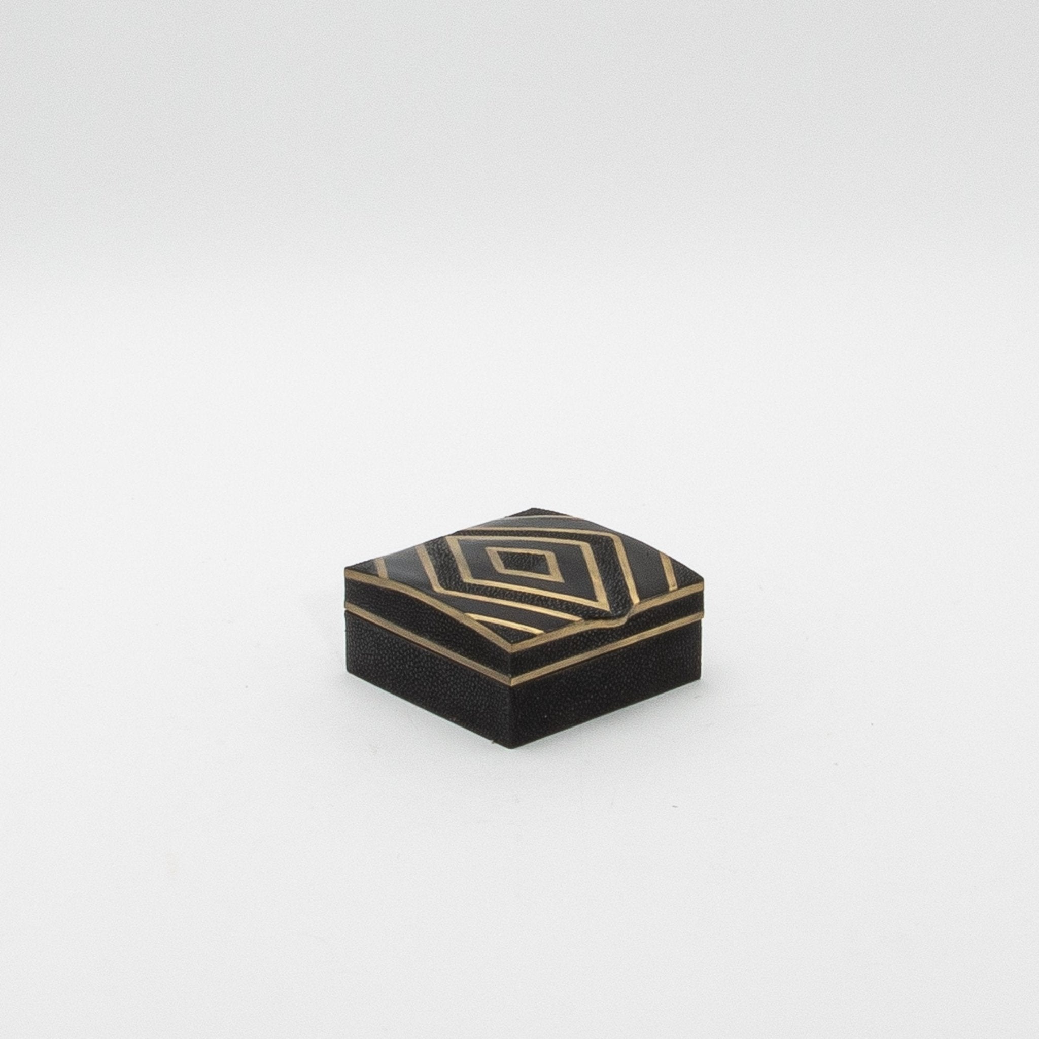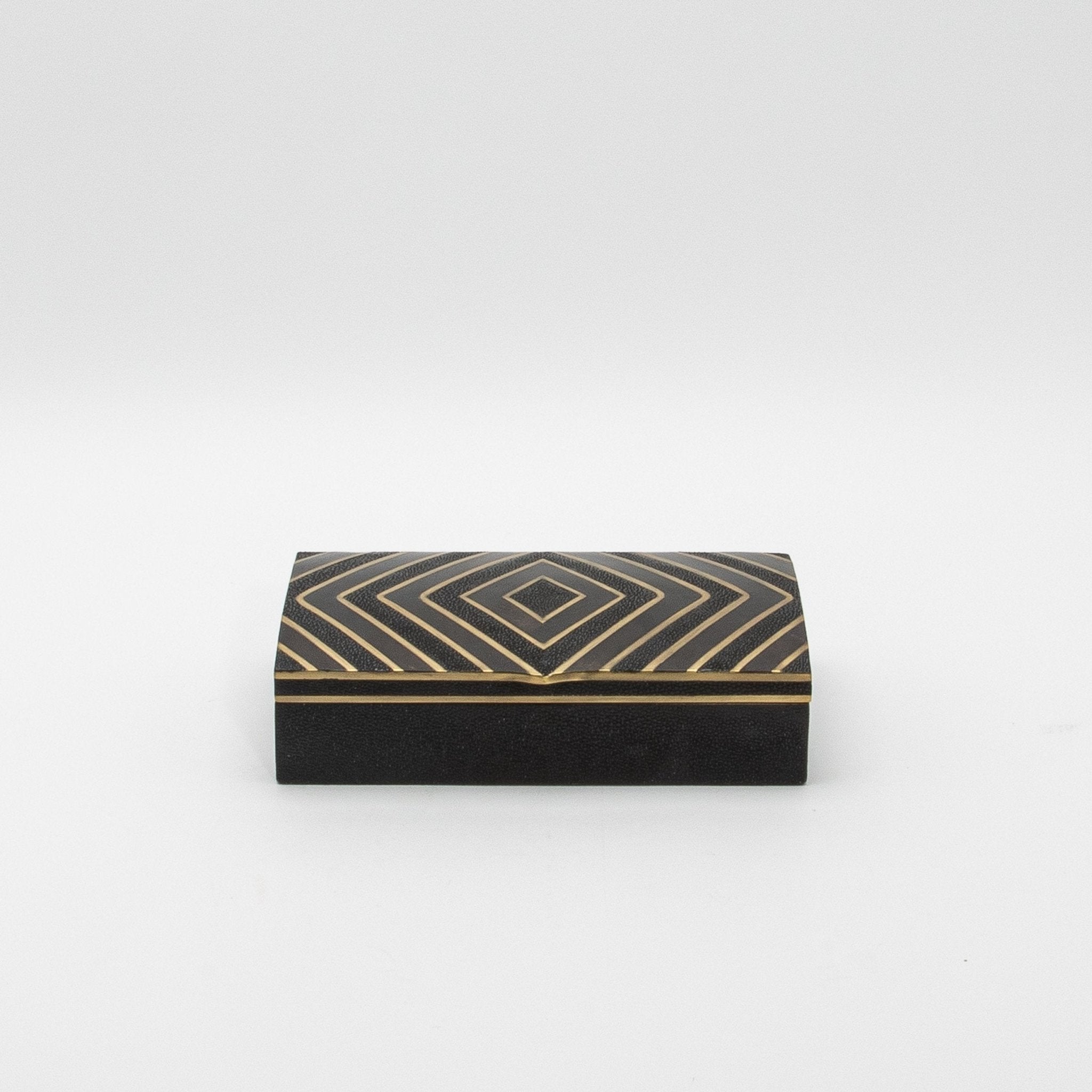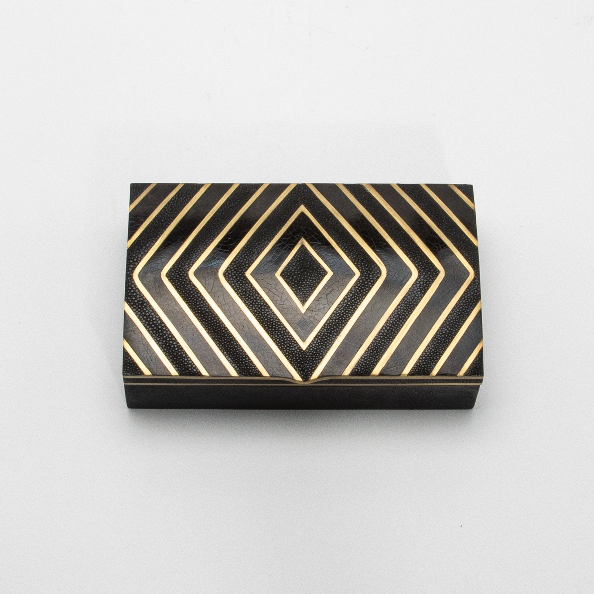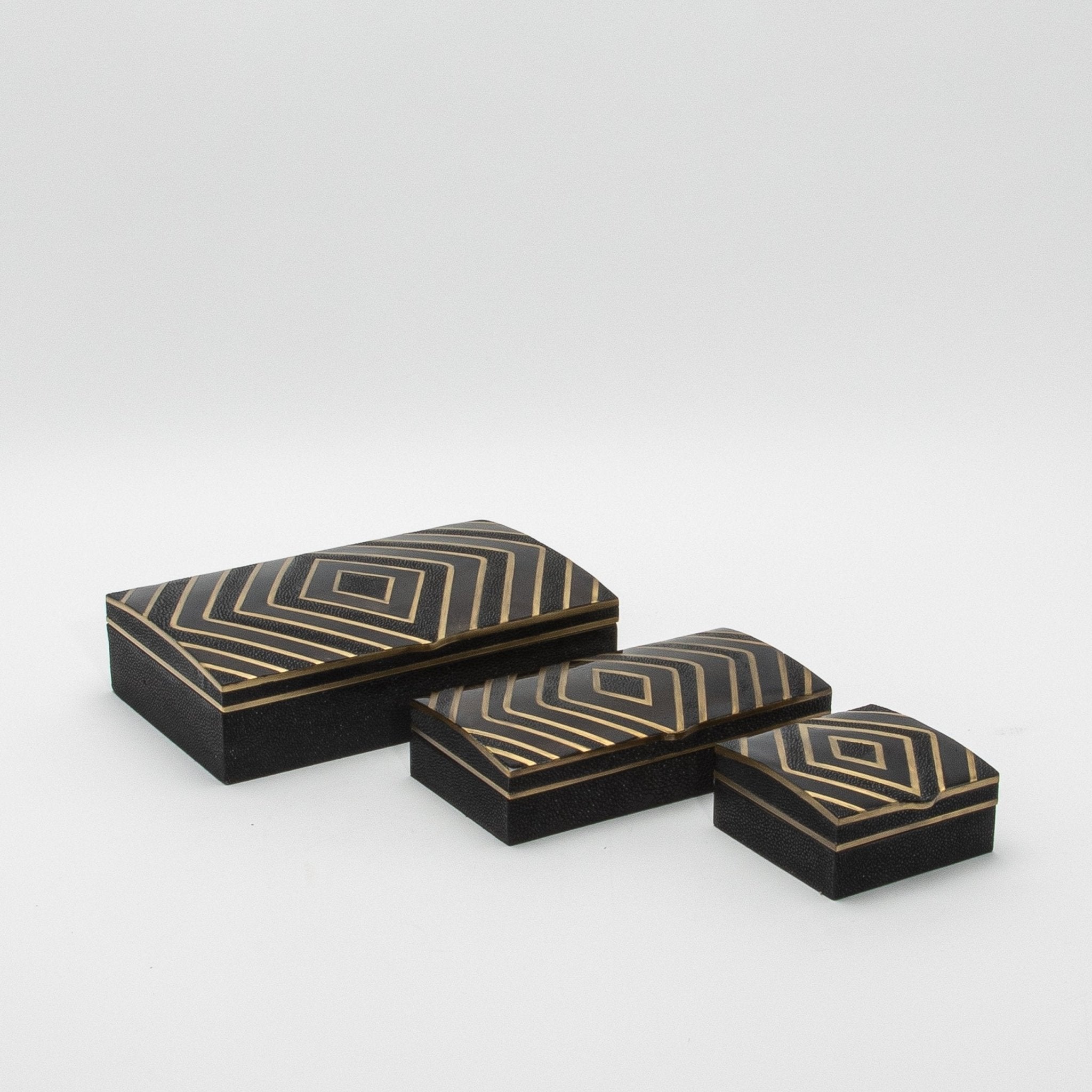 The set of 3 boxes by R&Y Augousti in black shagreen with black shell and brass details embodies timeless sophistication with a modern edge. Each box features a mesmerizing zig-zag pattern in a harmonious blend of bronze patina brass, black shell, and shagreen, creating a rich visual texture that evokes a sense of geometric luxury. The black shagreen exterior, with its textured finish, enhances the intricate craftsmanship, making these boxes not only functional but a statement in refined design. Handcrafted with the finest materials, these boxes seamlessly combine artistry with practicality, making them an exquisite addition to any interior that seeks a touch of elevated elegance.
