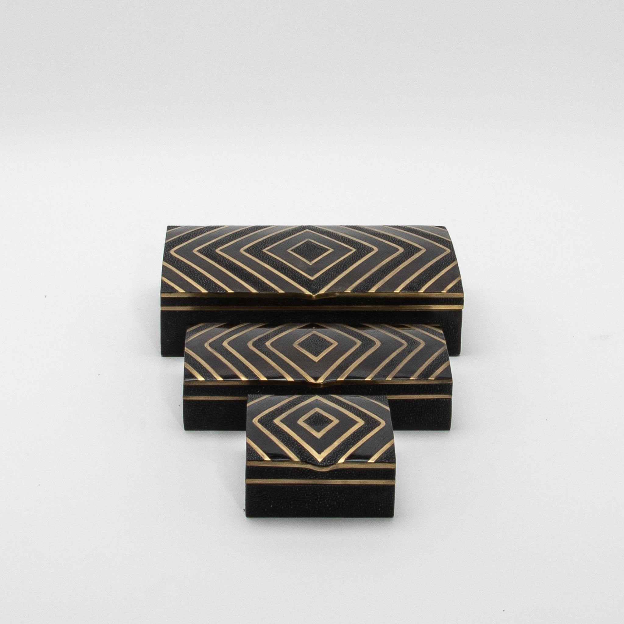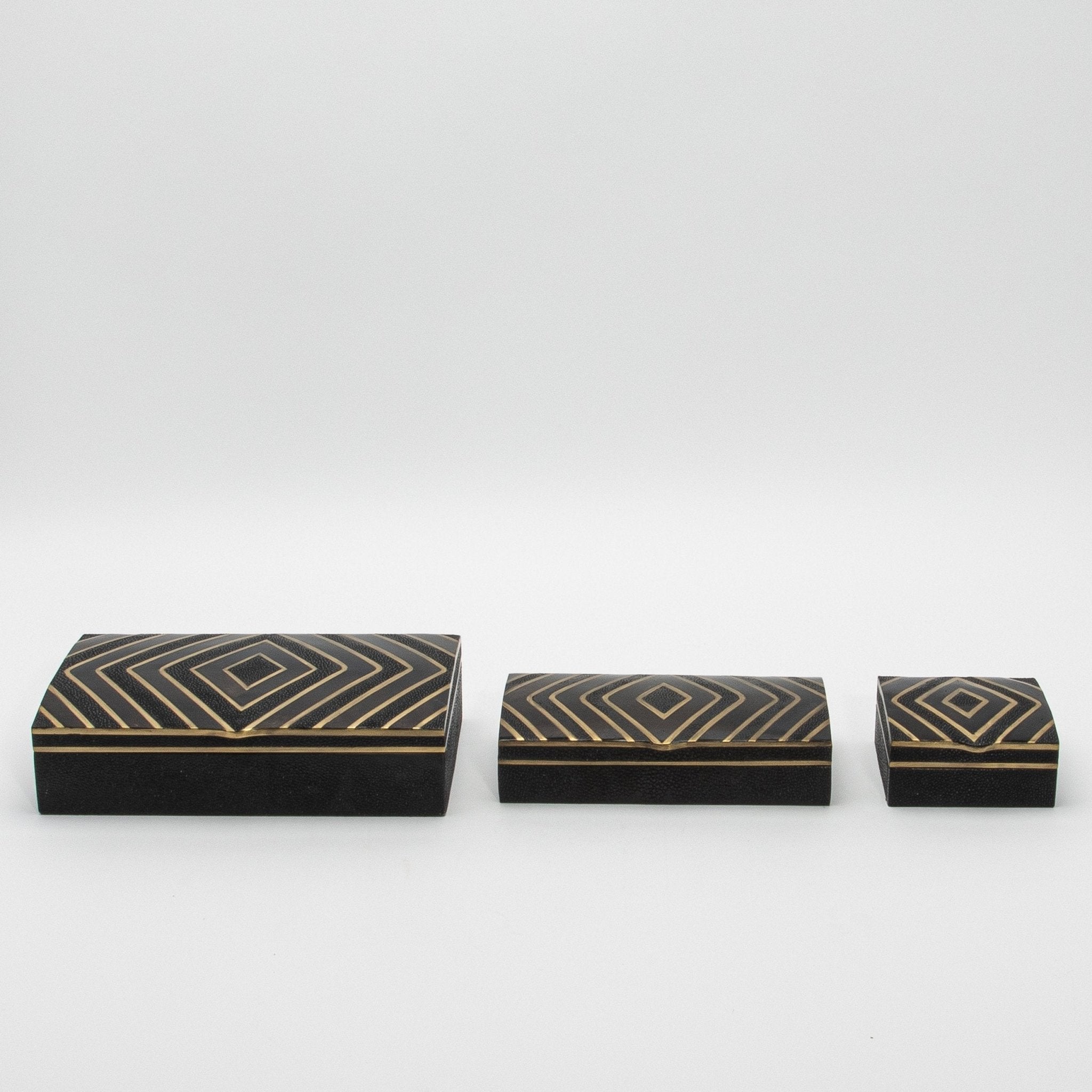 Set of 3 Boxes in Black Shagreen with Black Shell and Brass Details by R&Y Augousti
