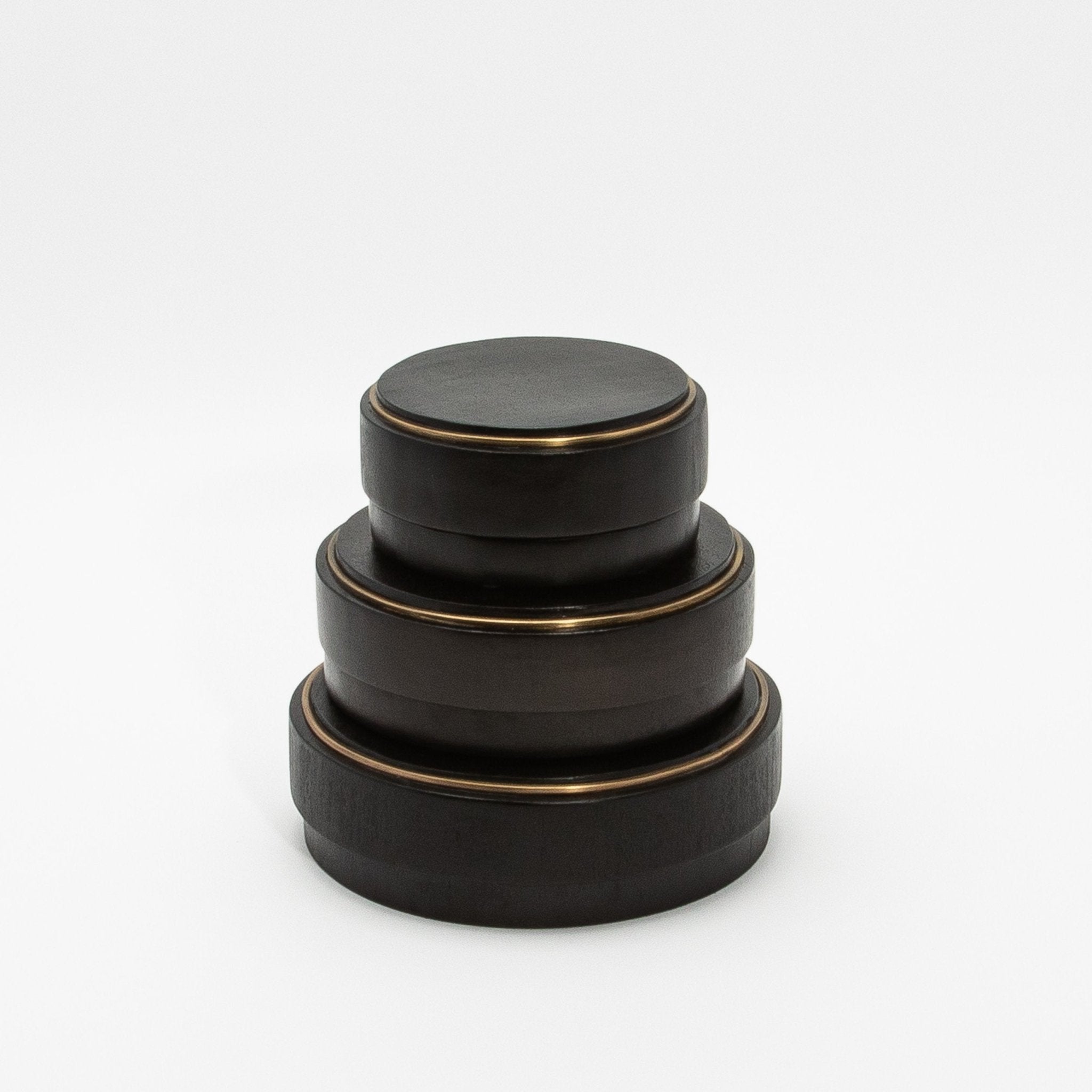 This set of three round boxes in black oak with a brass frame exemplifies sleek, modern design paired with artisanal craftsmanship. Each box features a minimalist silhouette, where the deep, rich tones of black oak meet the subtle gleam of a hand-painted brass frame, adding a refined contrast. The smooth texture of the wood, meticulously crafted, is enhanced by the simplicity of its circular form, while the delicate brass detailing creates a sense of understated luxury. Designed to nest seamlessly or be displayed individually, this set brings both functionality and elegance, perfect for storing personal treasures or adding a sophisticated touch to any space. The interior of each box, lined with polished wood, reveals the natural grain that complements the matte exterior, offering a harmonious blend of organic warmth and sleek modernity.