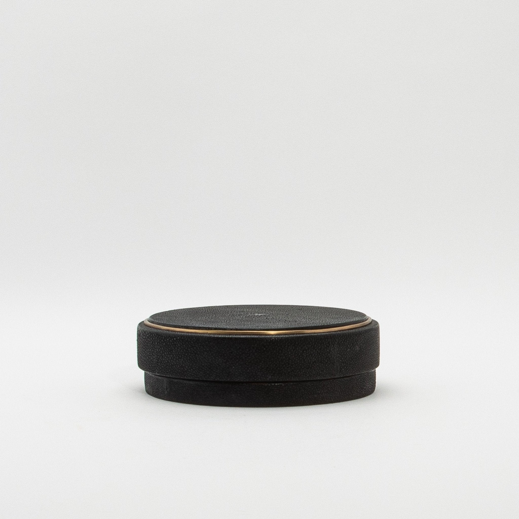 This set of 3 round boxes in black shagreen by R&Y Augousti showcases a design that seamlessly marries form and function. Each box features a perfectly symmetrical circular shape, exuding a modern elegance that draws the eye. The contrast between the elegant black shagreen and the subtle, hand-painted brass rim creates a visual rhythm, highlighting the curved silhouette of the boxes. The clean, unembellished surfaces allow the organic texture of the shagreen to take center stage, while the brass detailing adds a touch of warmth and sophistication. The proportions are thoughtfully balanced, with the height and width complementing the round design, making these boxes not just functional storage pieces but also striking sculptural accents. The minimalist approach, combined with luxurious materials, makes these boxes a sophisticated addition to any space, blending contemporary style with timeless craftsmanship.