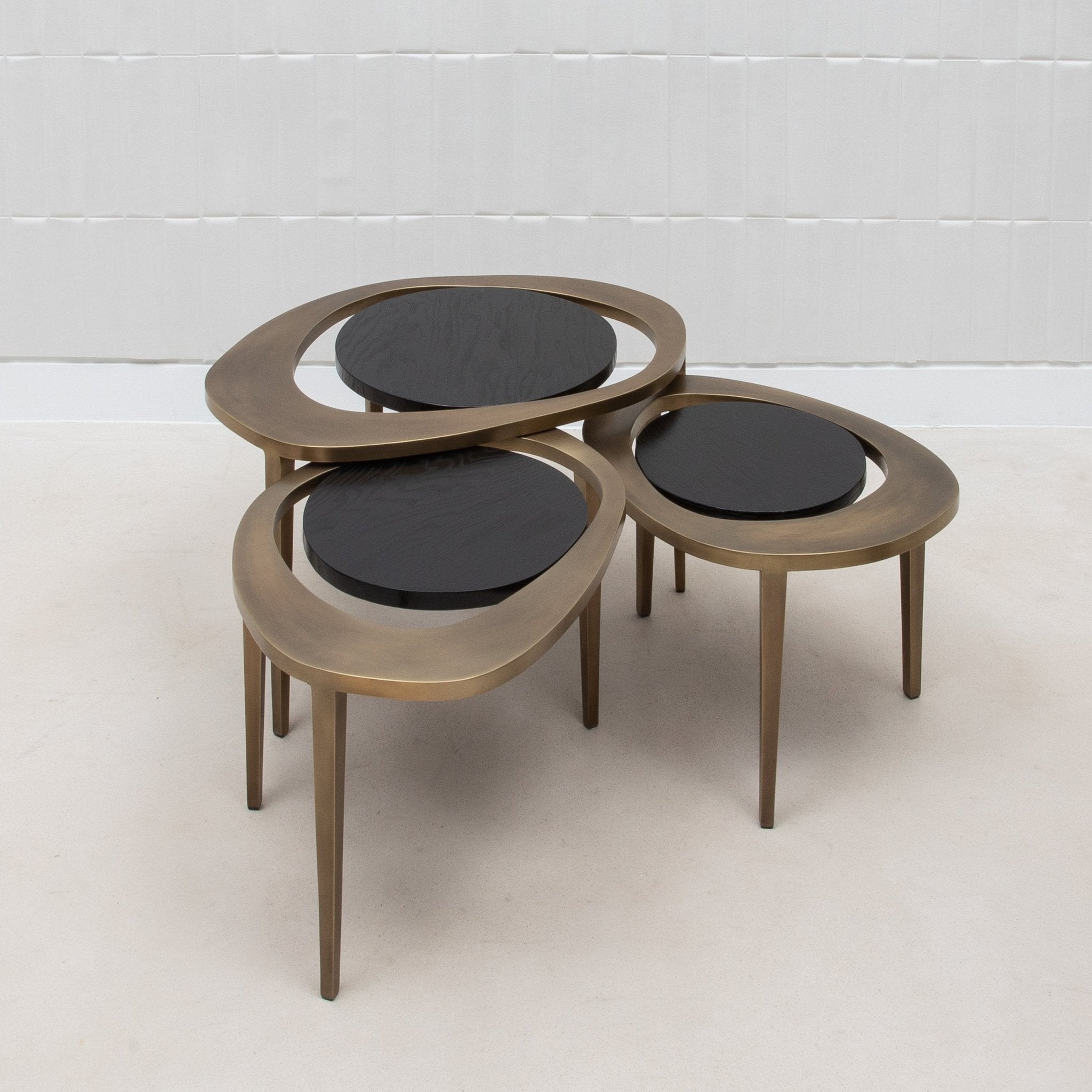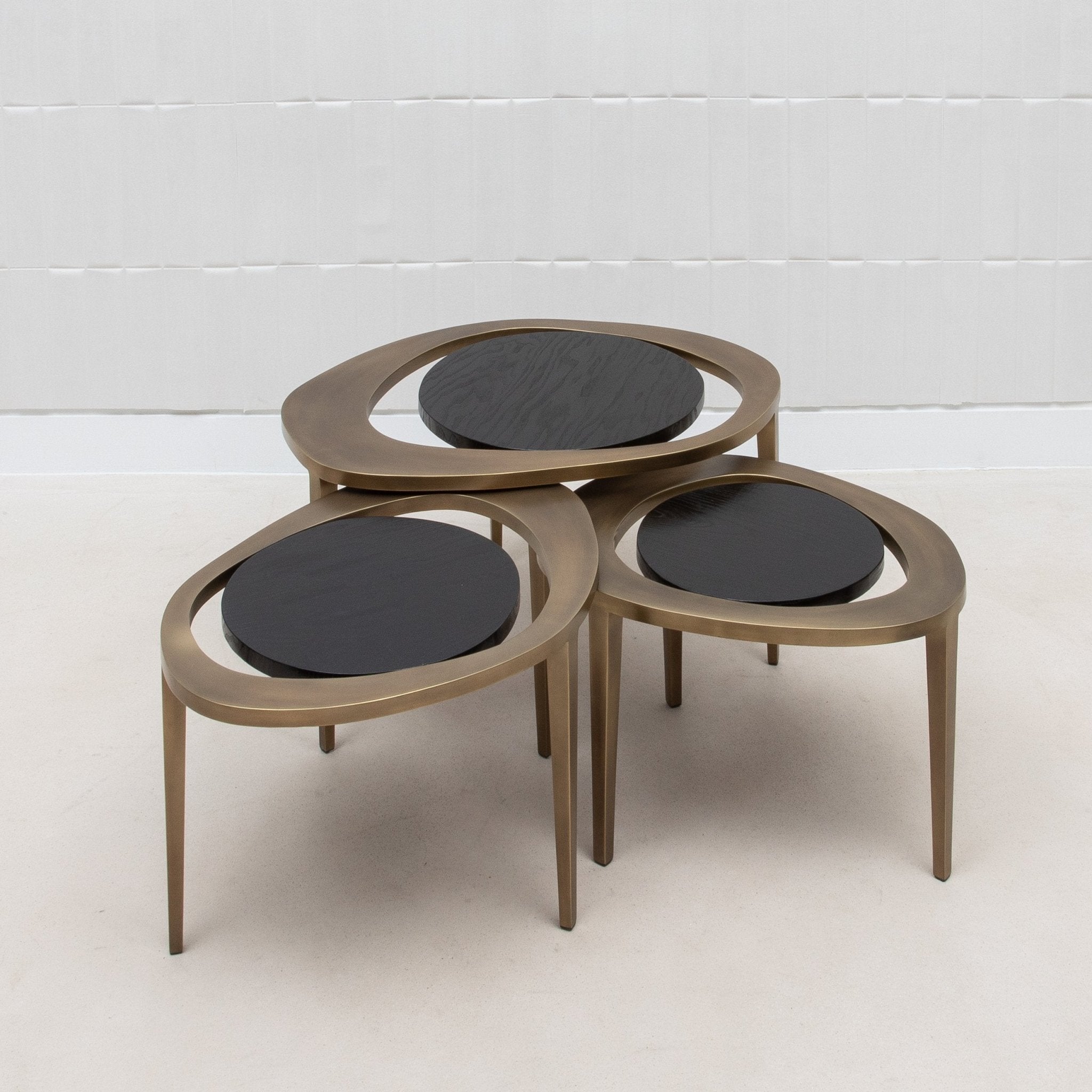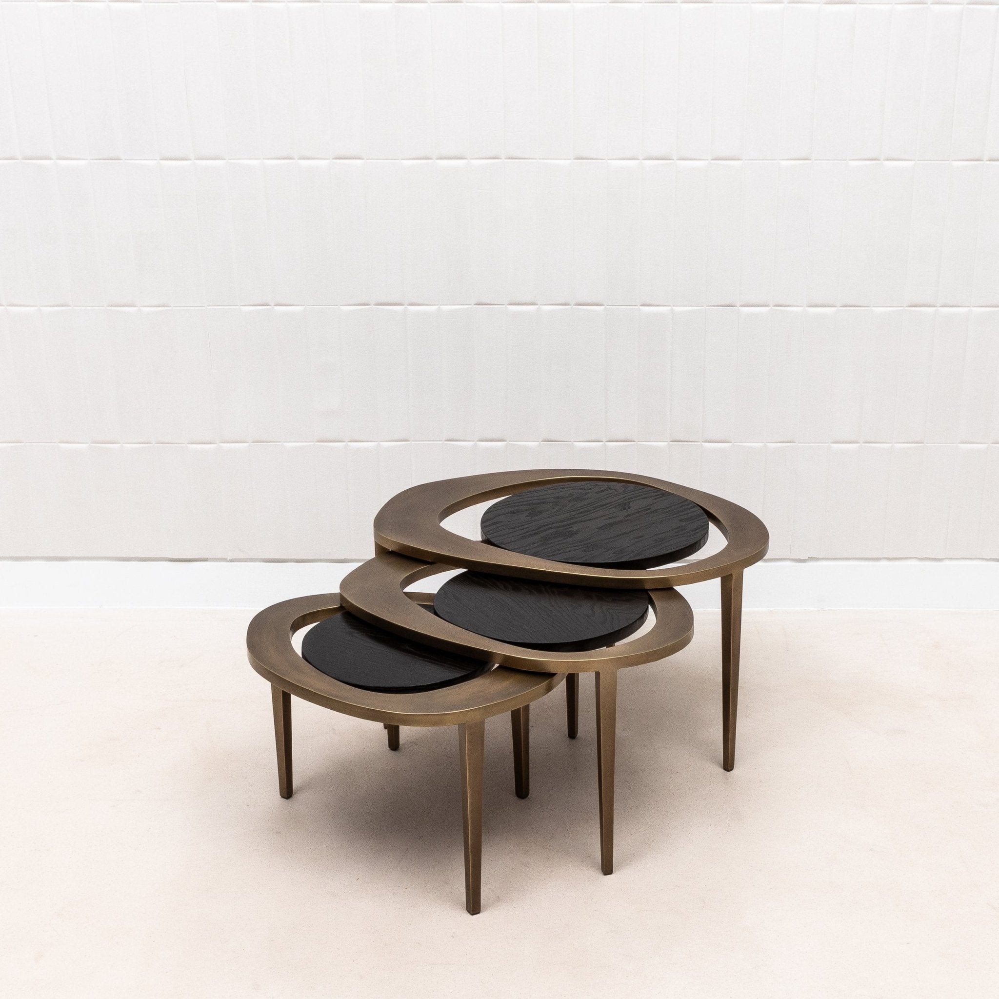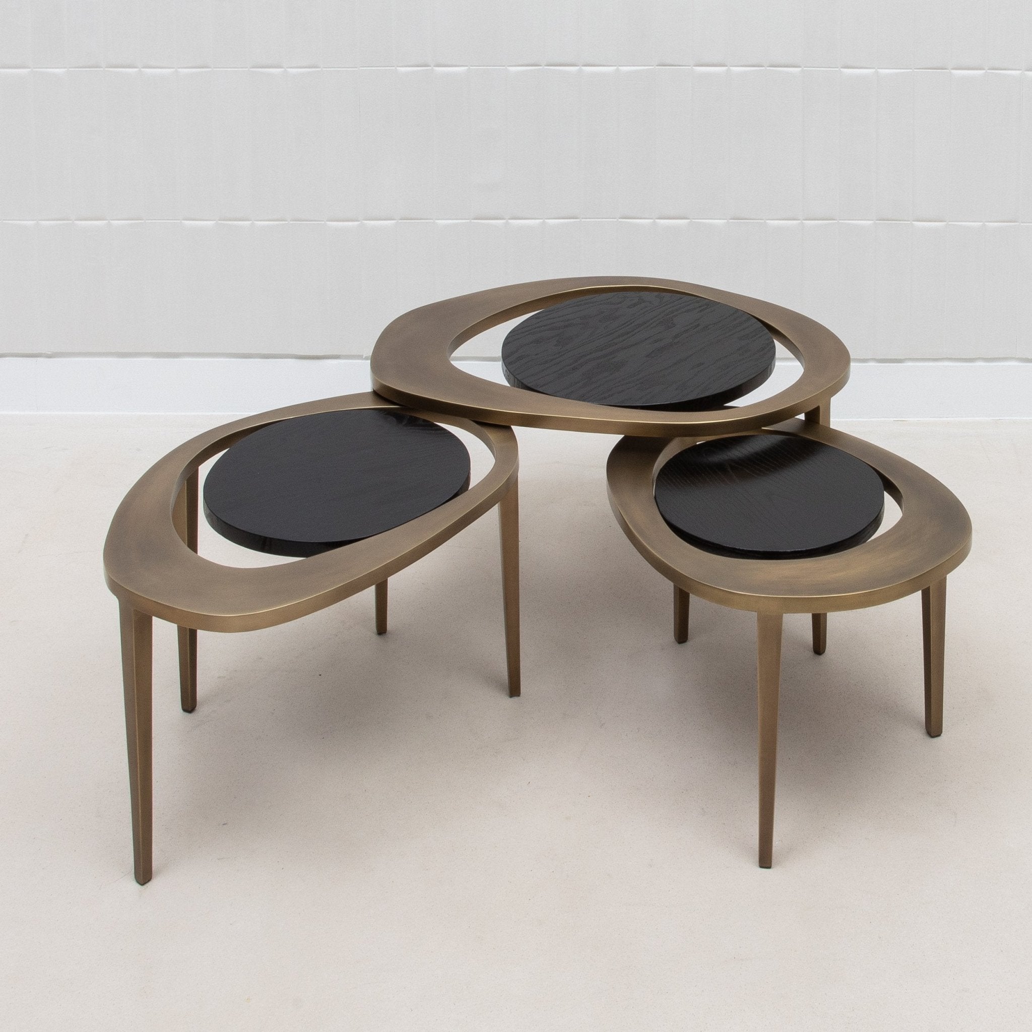 Introducing the Peacock Nesting Coffee Tables by R&Y Augousti, a harmonious blend of modern elegance and timeless craftsmanship. This set of three tables showcases the deep, rich tones of black oak, expertly paired with the warm, luxurious glow of bronze patina brass. The fluid, organic shapes of the tables are reminiscent of peacock feathers, bringing a subtle yet sophisticated touch of nature into your living space. Each piece is meticulously handcrafted, ensuring that the textures and finishes are as unique as they are beautiful. Whether nested together or displayed separately, these tables offer a versatile and striking focal point that elevates any interior with their undeniable allure and refined design.