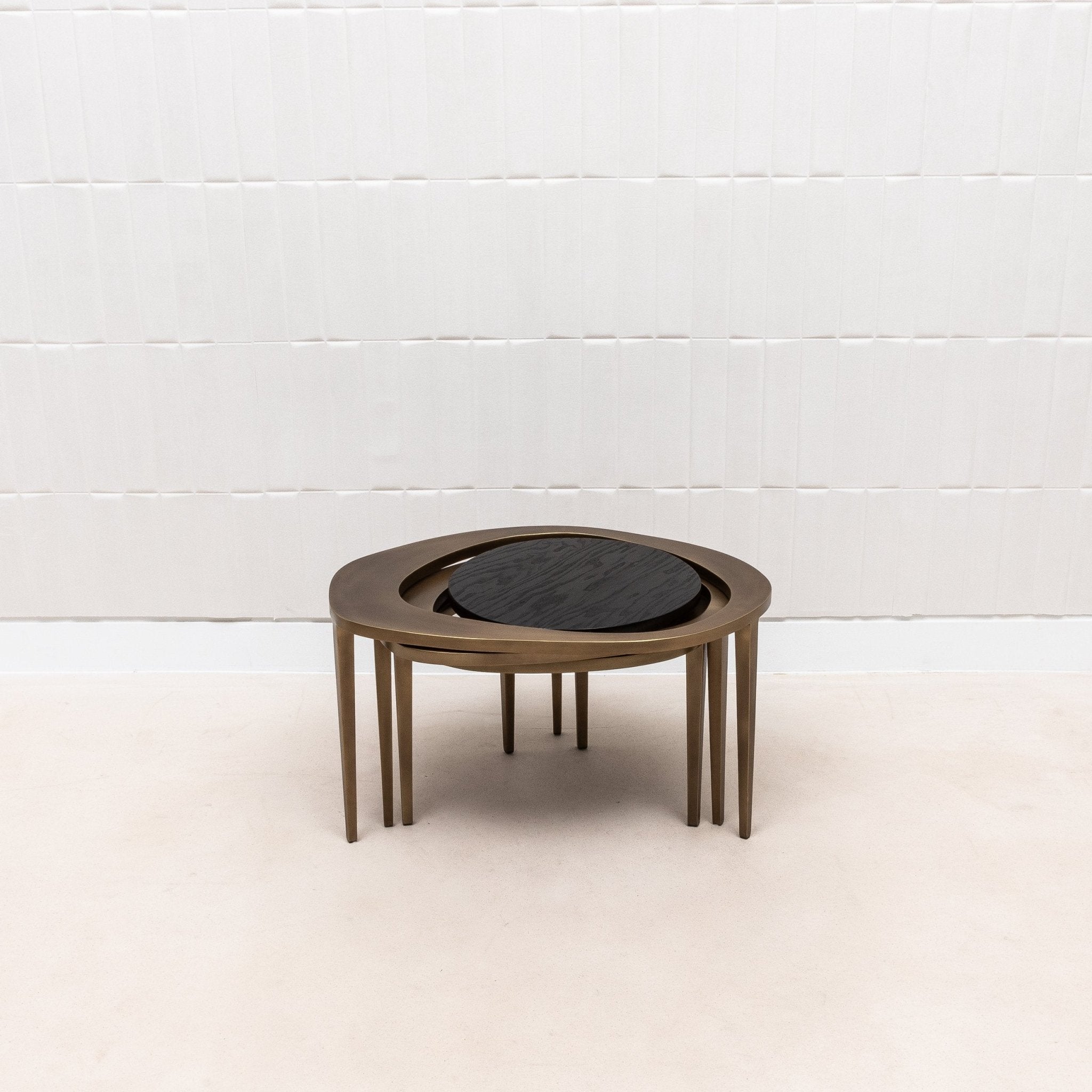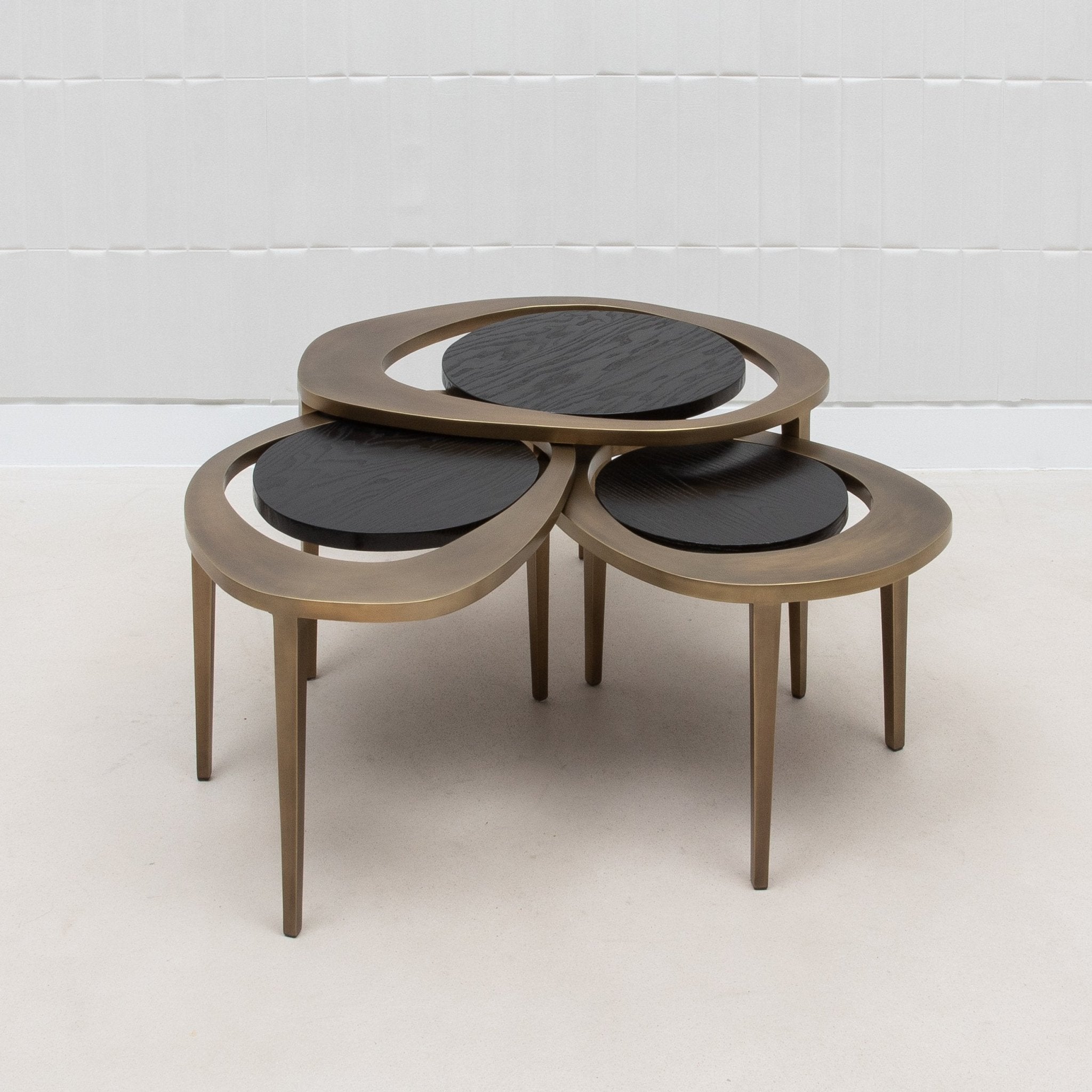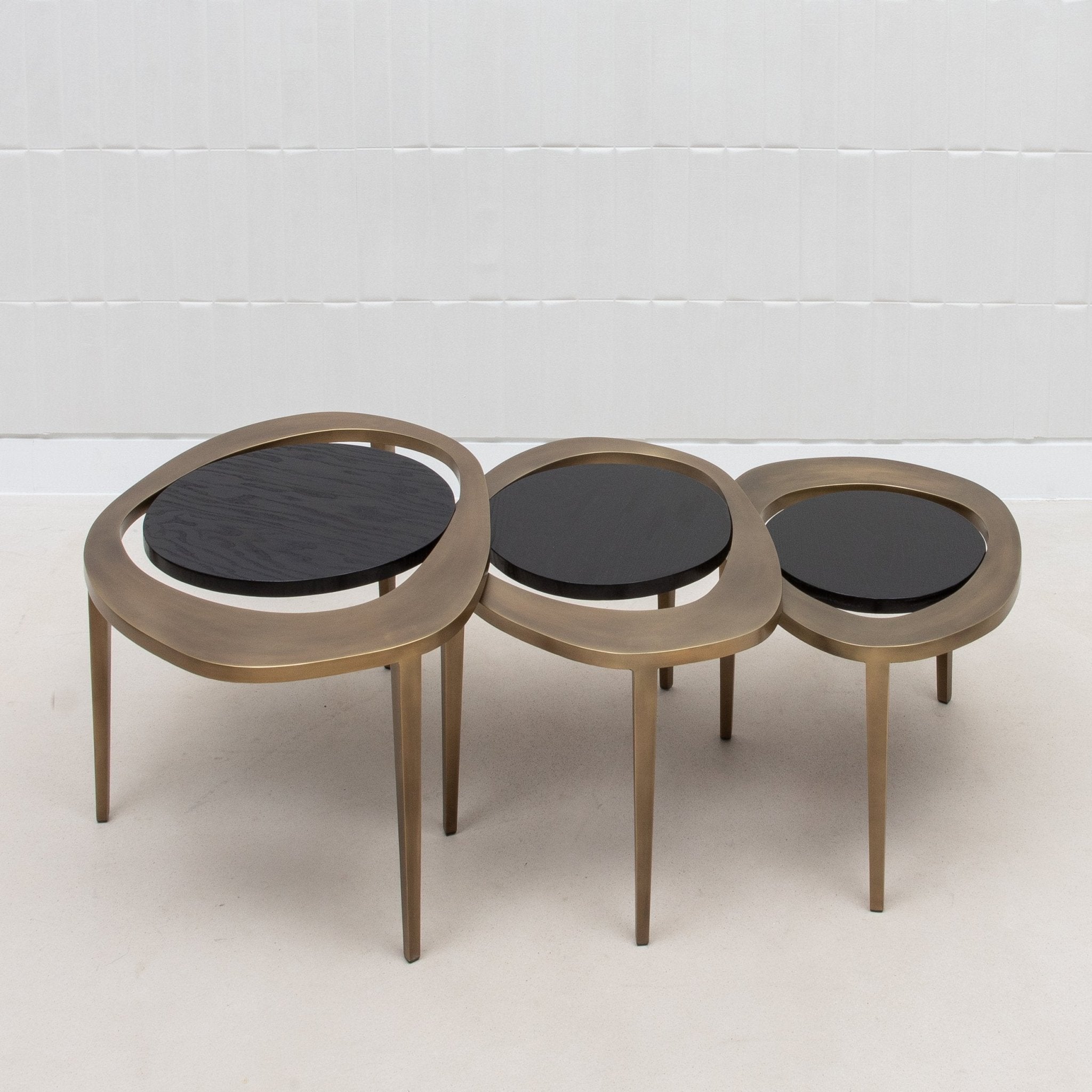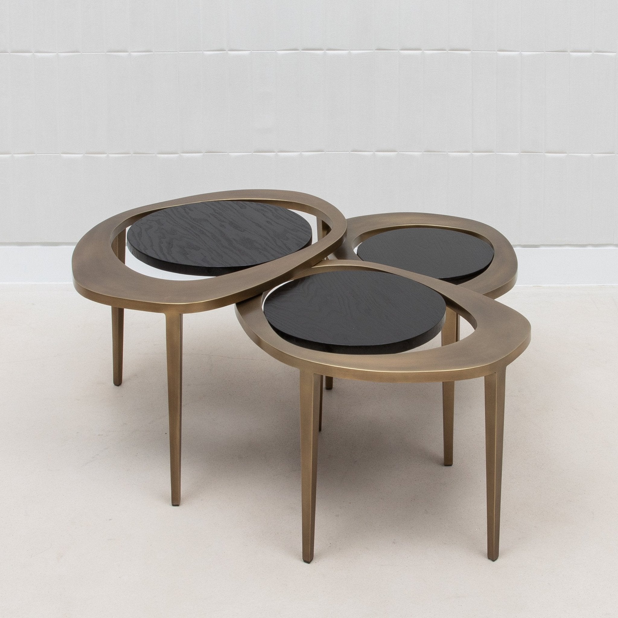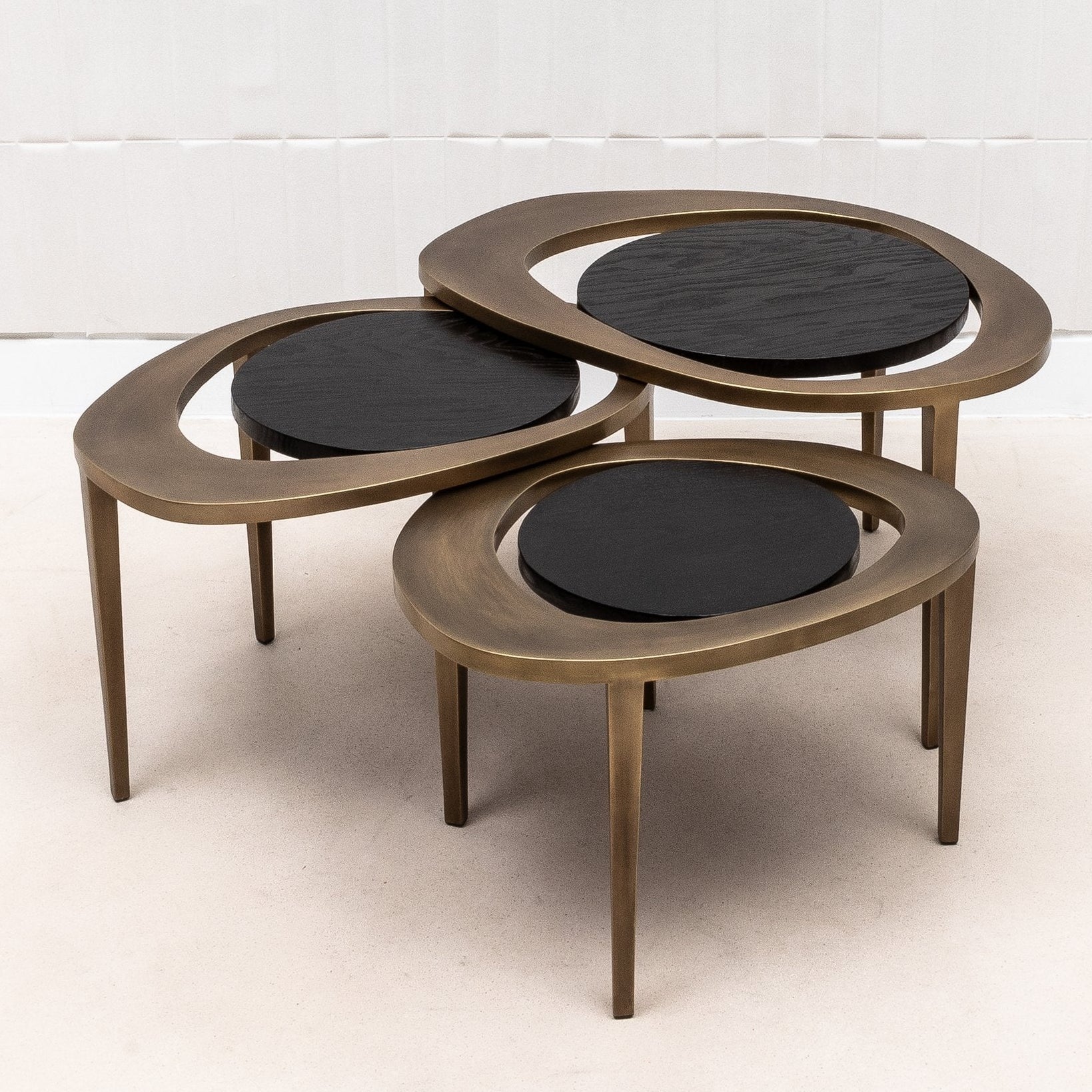 Introducing the Peacock Nesting Coffee Tables by R&Y Augousti, a harmonious blend of modern elegance and timeless craftsmanship. This set of three tables showcases the deep, rich tones of black oak, expertly paired with the warm, luxurious glow of bronze patina brass. The fluid, organic shapes of the tables are reminiscent of peacock feathers, bringing a subtle yet sophisticated touch of nature into your living space. Each piece is meticulously handcrafted, ensuring that the textures and finishes are as unique as they are beautiful. Whether nested together or displayed separately, these tables offer a versatile and striking focal point that elevates any interior with their undeniable allure and refined design.