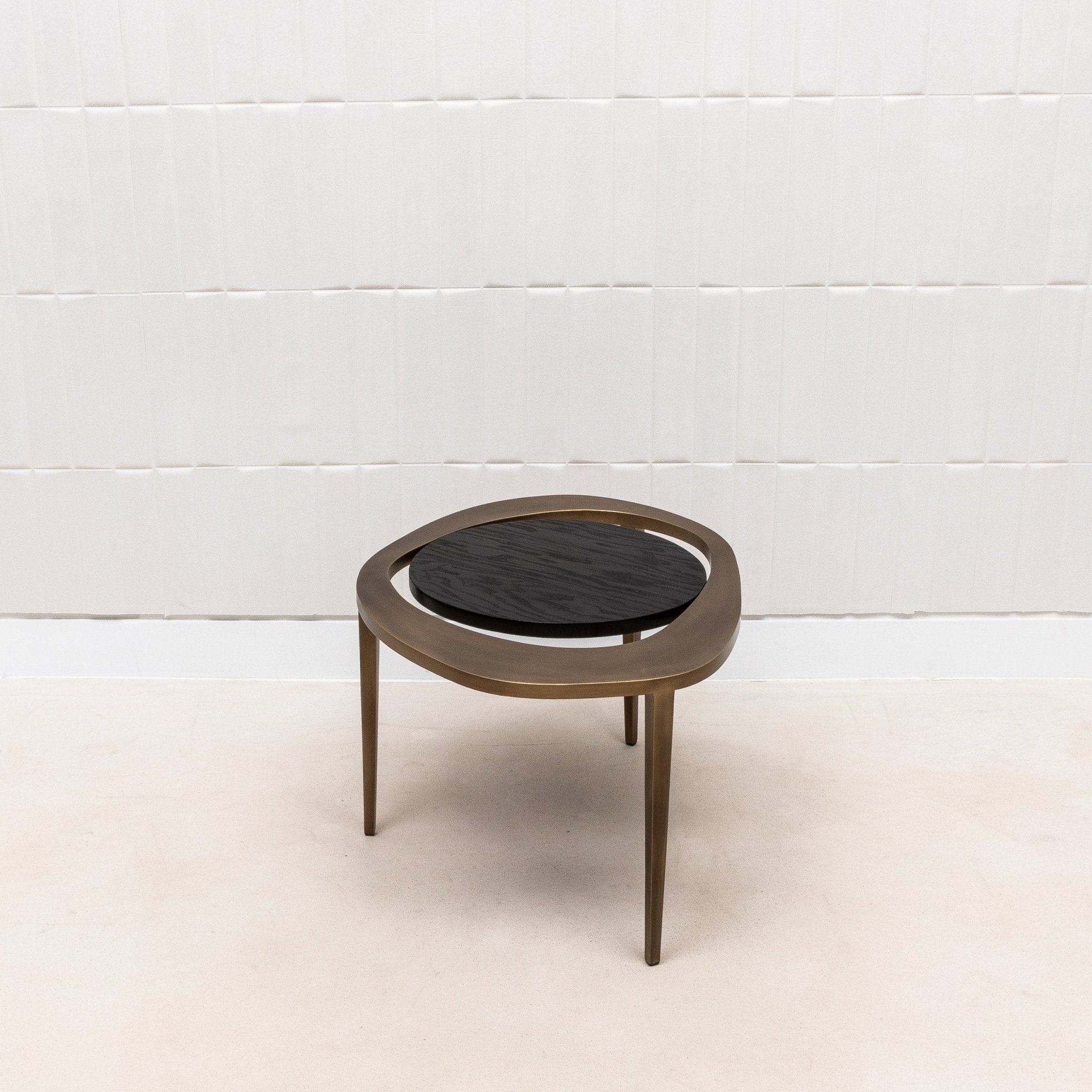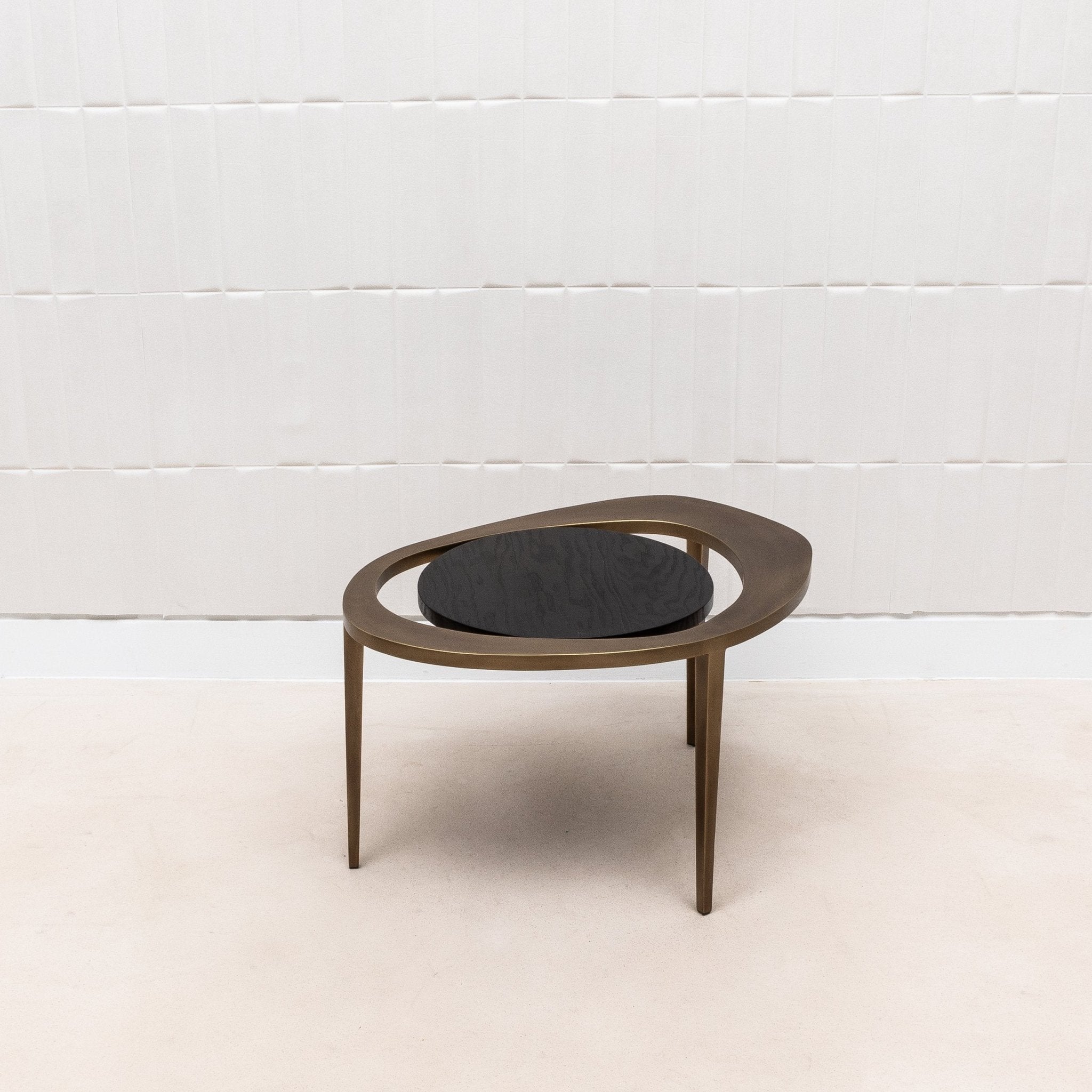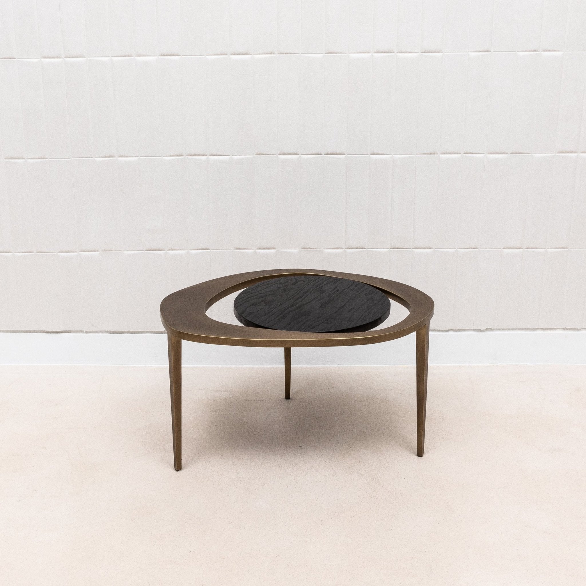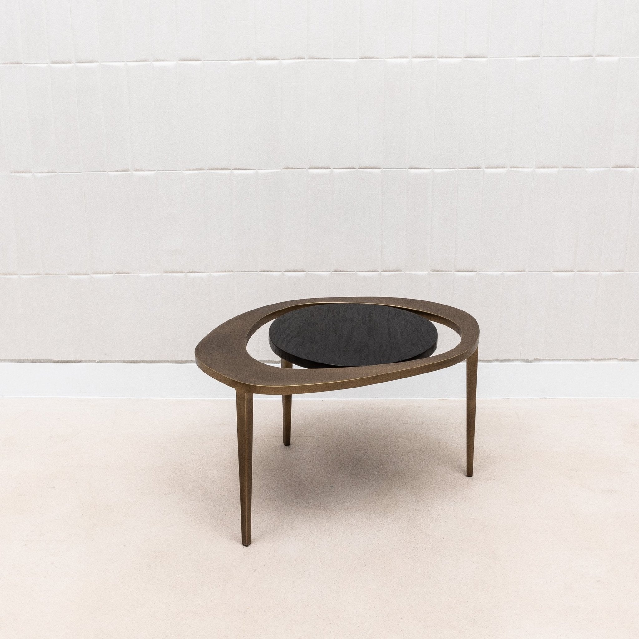 Introducing the Peacock Nesting Coffee Tables by R&Y Augousti, a harmonious blend of modern elegance and timeless craftsmanship. This set of three tables showcases the deep, rich tones of black oak, expertly paired with the warm, luxurious glow of bronze patina brass. The fluid, organic shapes of the tables are reminiscent of peacock feathers, bringing a subtle yet sophisticated touch of nature into your living space. Each piece is meticulously handcrafted, ensuring that the textures and finishes are as unique as they are beautiful. Whether nested together or displayed separately, these tables offer a versatile and striking focal point that elevates any interior with their undeniable allure and refined design.