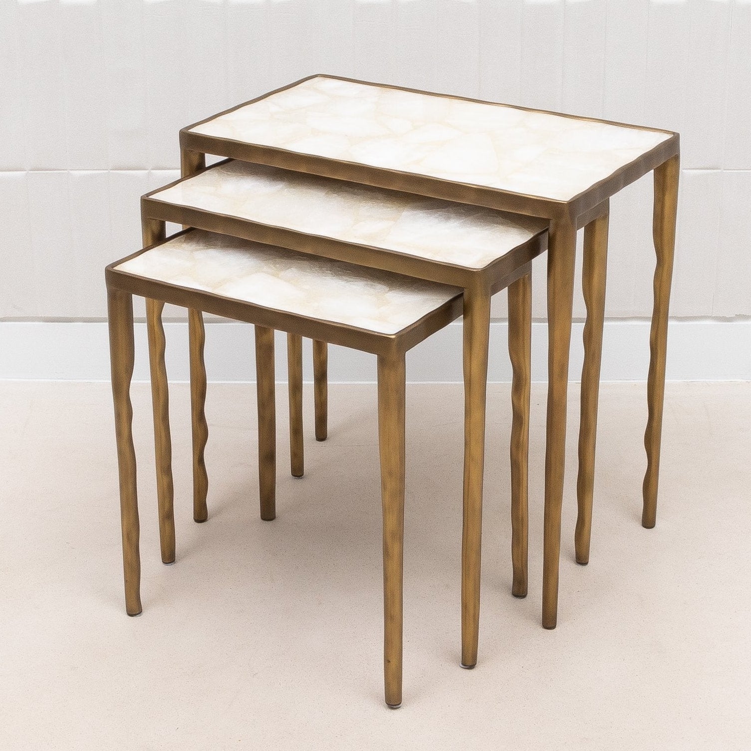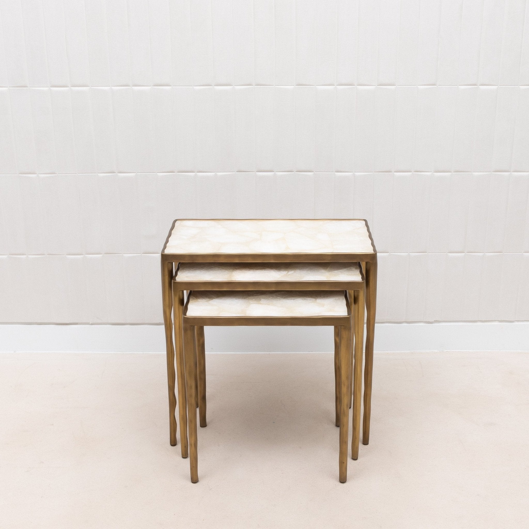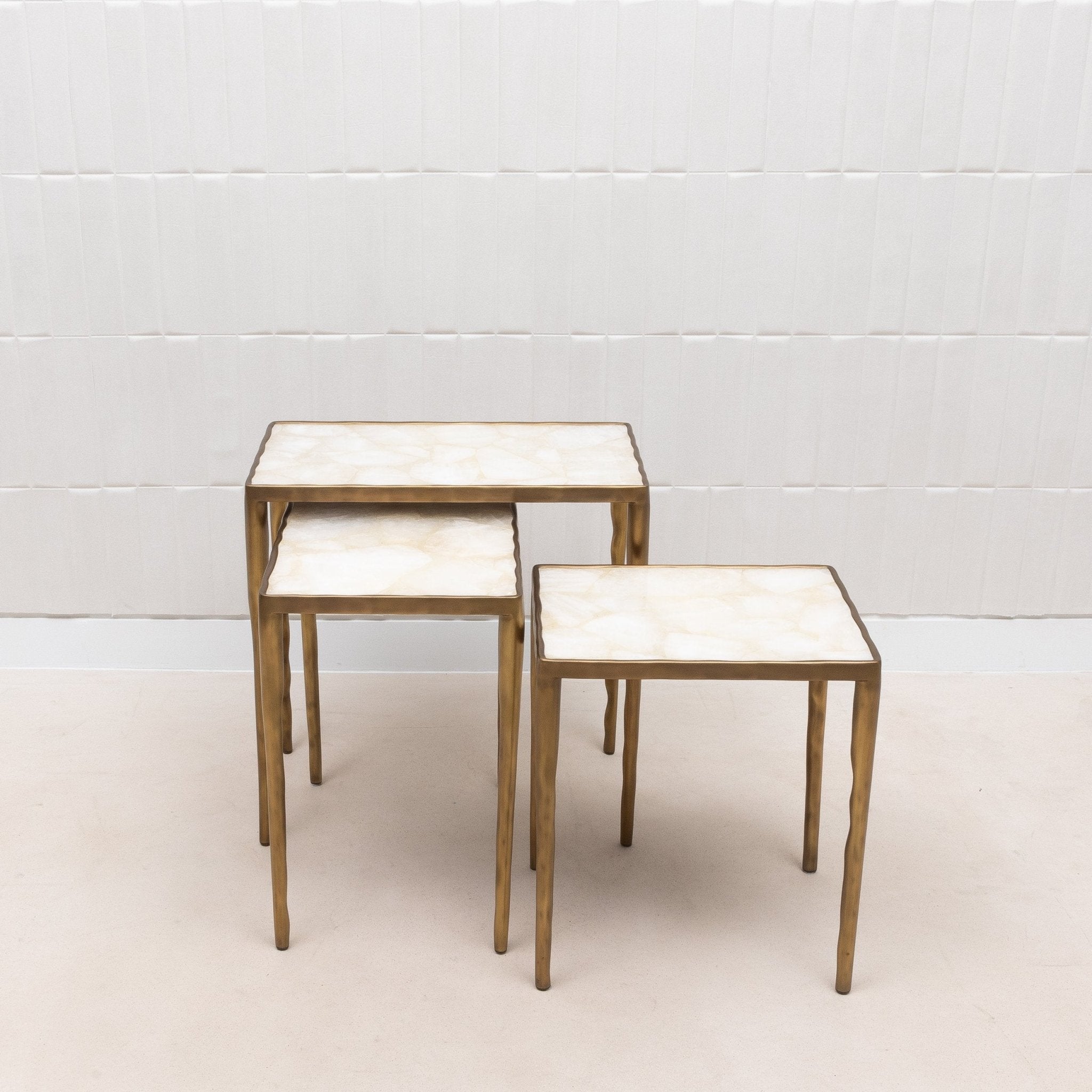 Indulge in the unparalleled luxury of this exquisite set of three Nesting Melting Tables by R&Y Augousti, a true testament to artisanal mastery and opulent design. Each table is crowned with a stunning white quartz surface, meticulously hand-selected for its luminous quality, evoking the ethereal beauty of moonlight captured in stone. The sumptuous quartz tops are encased in a fluid frame of bronze patina brass, which is artfully sculpted to mimic the gentle, organic contours found in nature, lending an air of effortless sophistication to any space. This set is not merely functional; it is a statement of timeless elegance and a celebration of the finest materials and craftsmanship. The tables nest together in a harmonious trio, offering versatility and a touch of grandeur to the most discerning interiors.